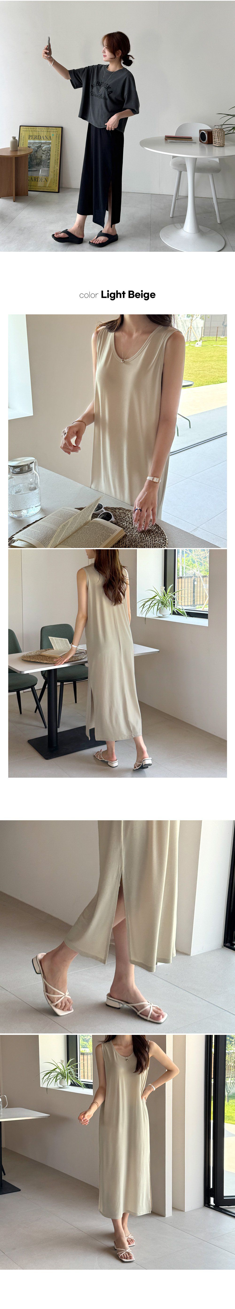 柔軟親膚/涼感面料/U領/直筒版型/側開衩/寬肩無袖/無口袋 - 休閒居家渡假簡約百搭素面涼感背心裙一件式洋裝連身裙無袖洋裝背心洋裝黑色灰色卡其色卡其綠色淺米色