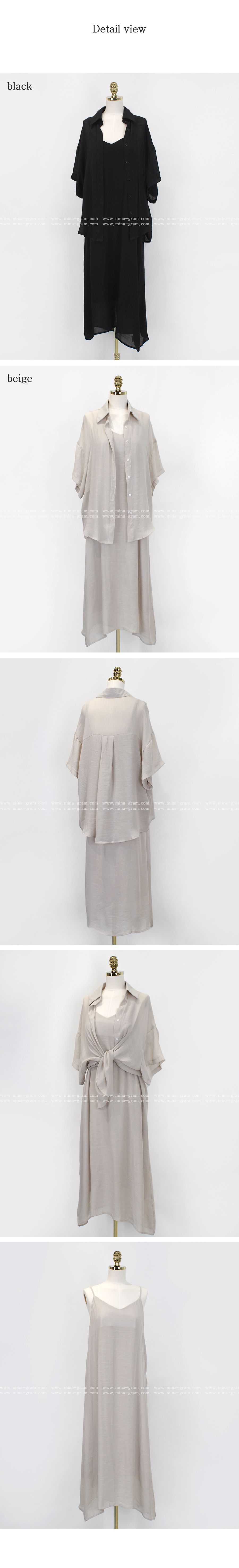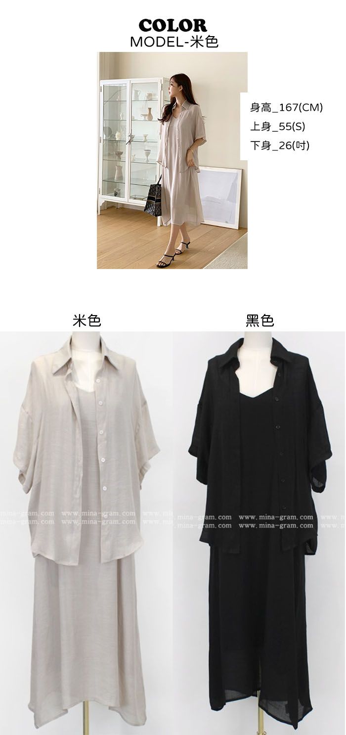 超值兩件組/長版外套/落肩七分袖/襯衫外套/開襟排釦/V領洋裝/細肩帶/吊帶裙(可調式)/無口袋/有內裏 - 休閒渡假簡約百搭素面吊帶洋裝套裝七分袖襯衫外套無袖連身裙米色黑色