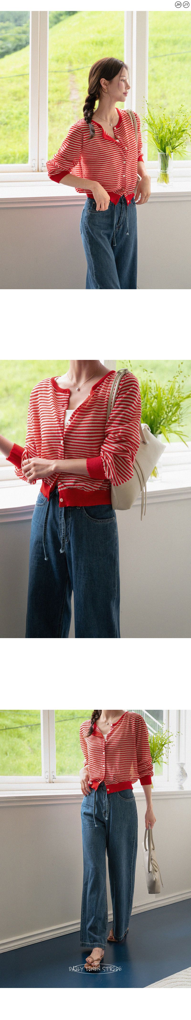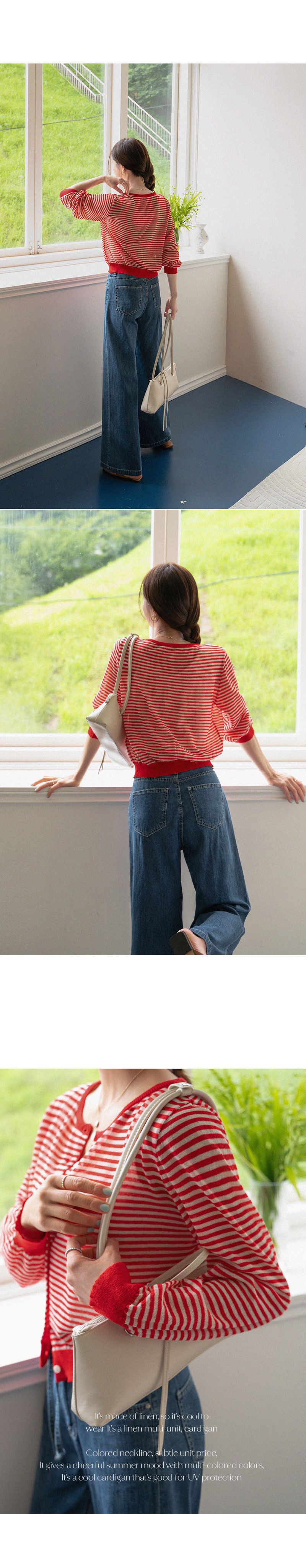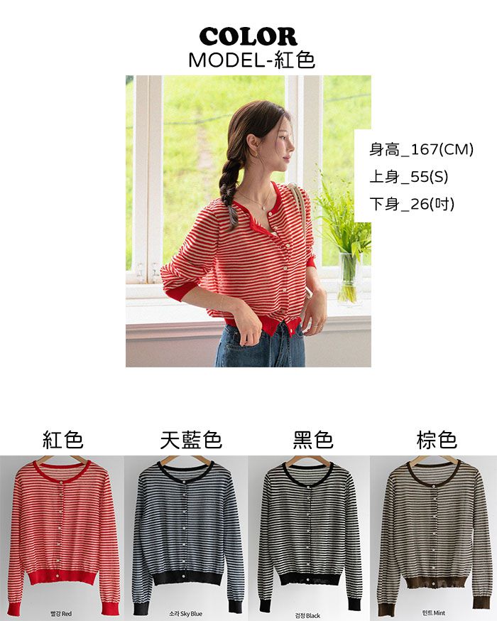 涼感混亞麻/好氣色/滾邊圓領/短版外套/開襟排釦 - 休閒居家渡假配色條紋外套條紋針織外套長袖外套紅色深灰色黑色棕色