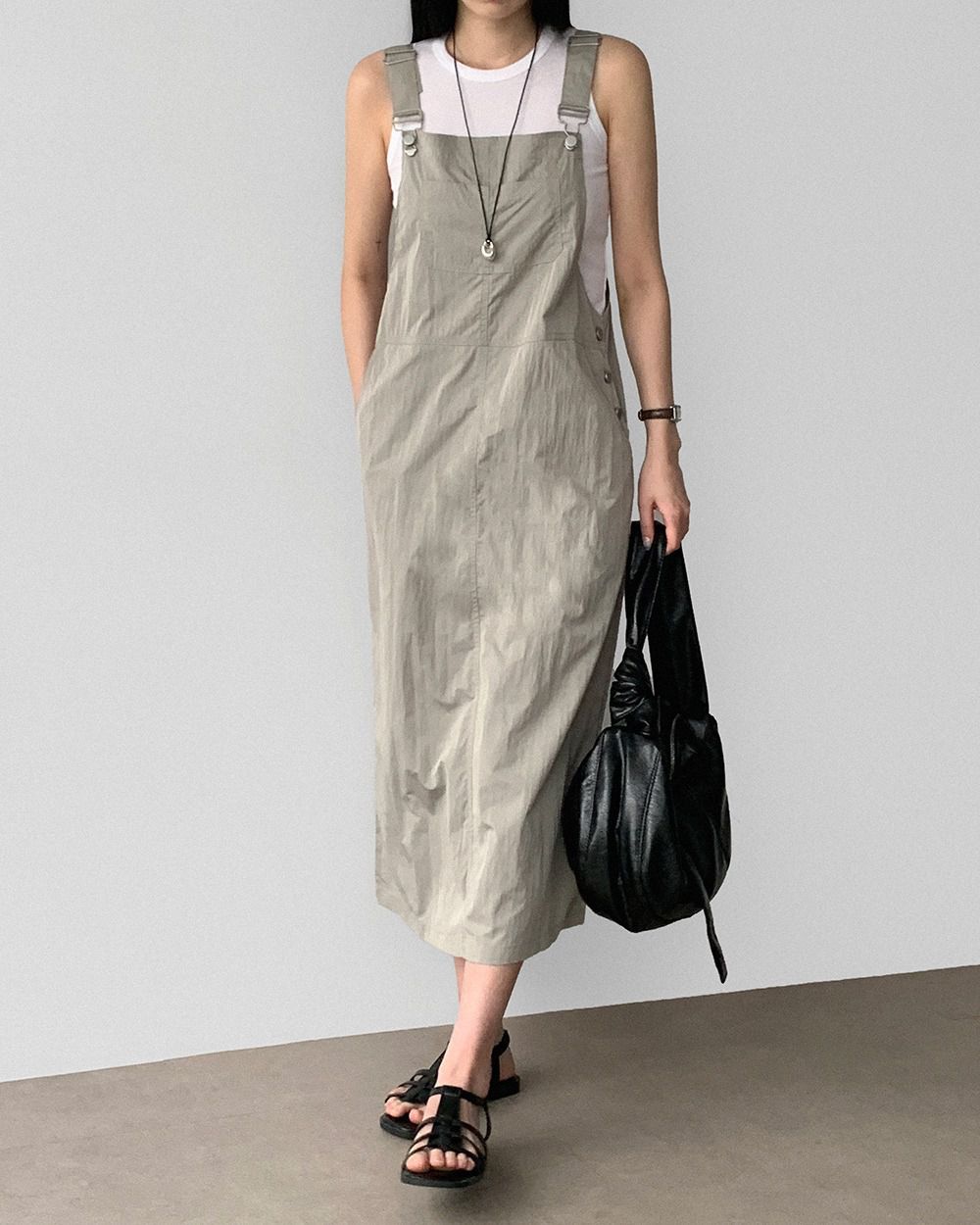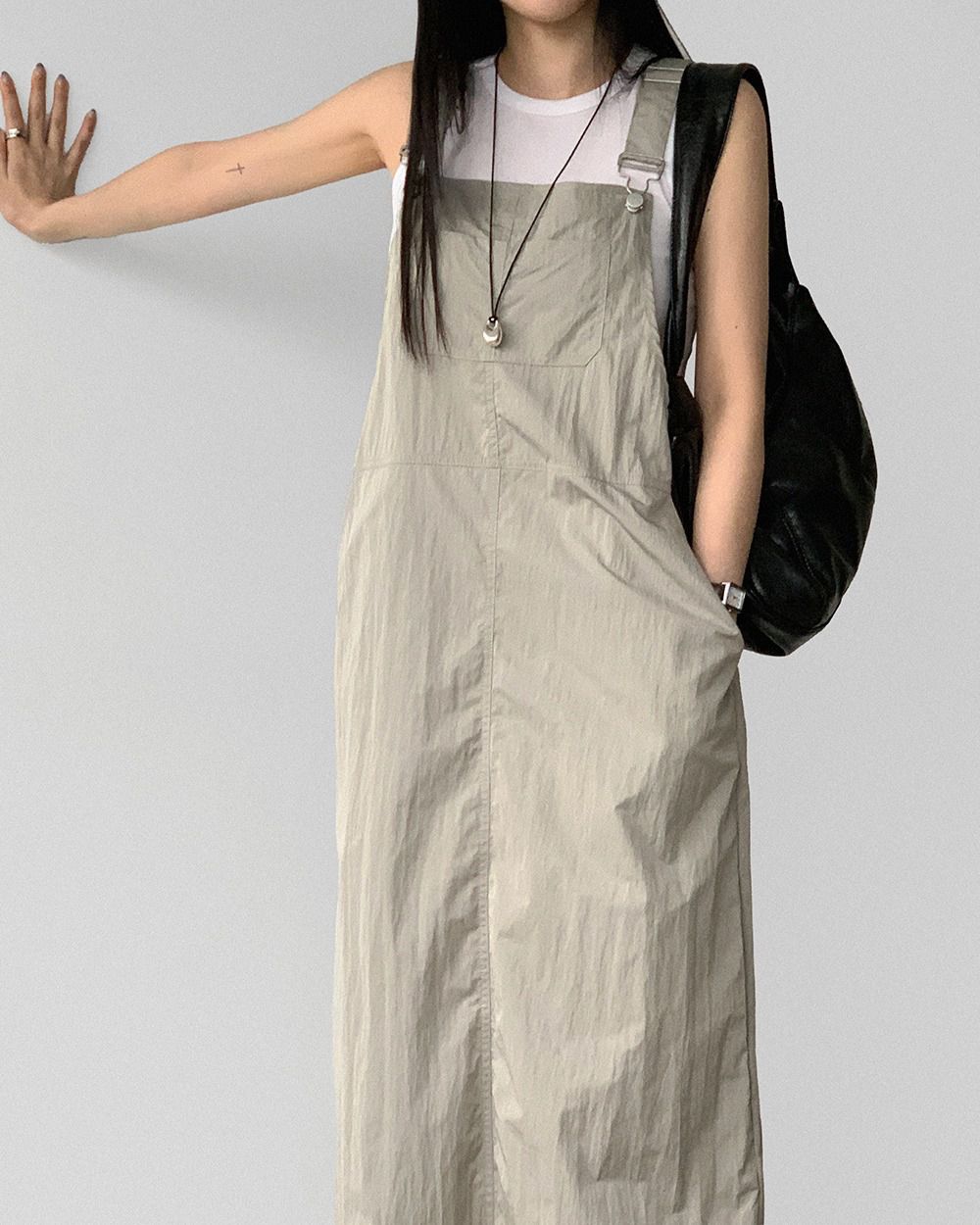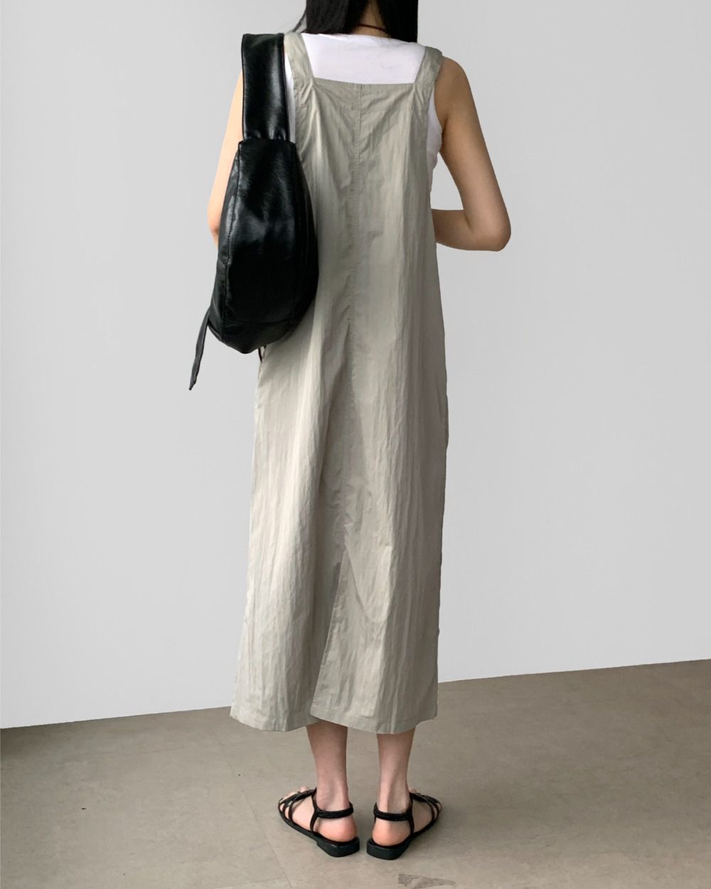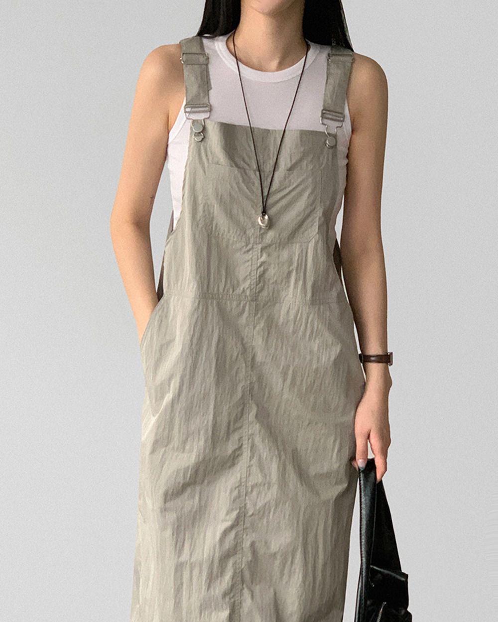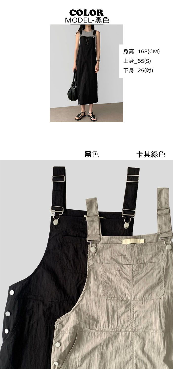 胸前大口袋/可調肩帶/平口/雙口袋/側邊三釦/直筒後開衩 - 休閒居家渡假簡約百搭素面平口吊帶裙無袖連身裙一件式洋裝吊帶洋裝