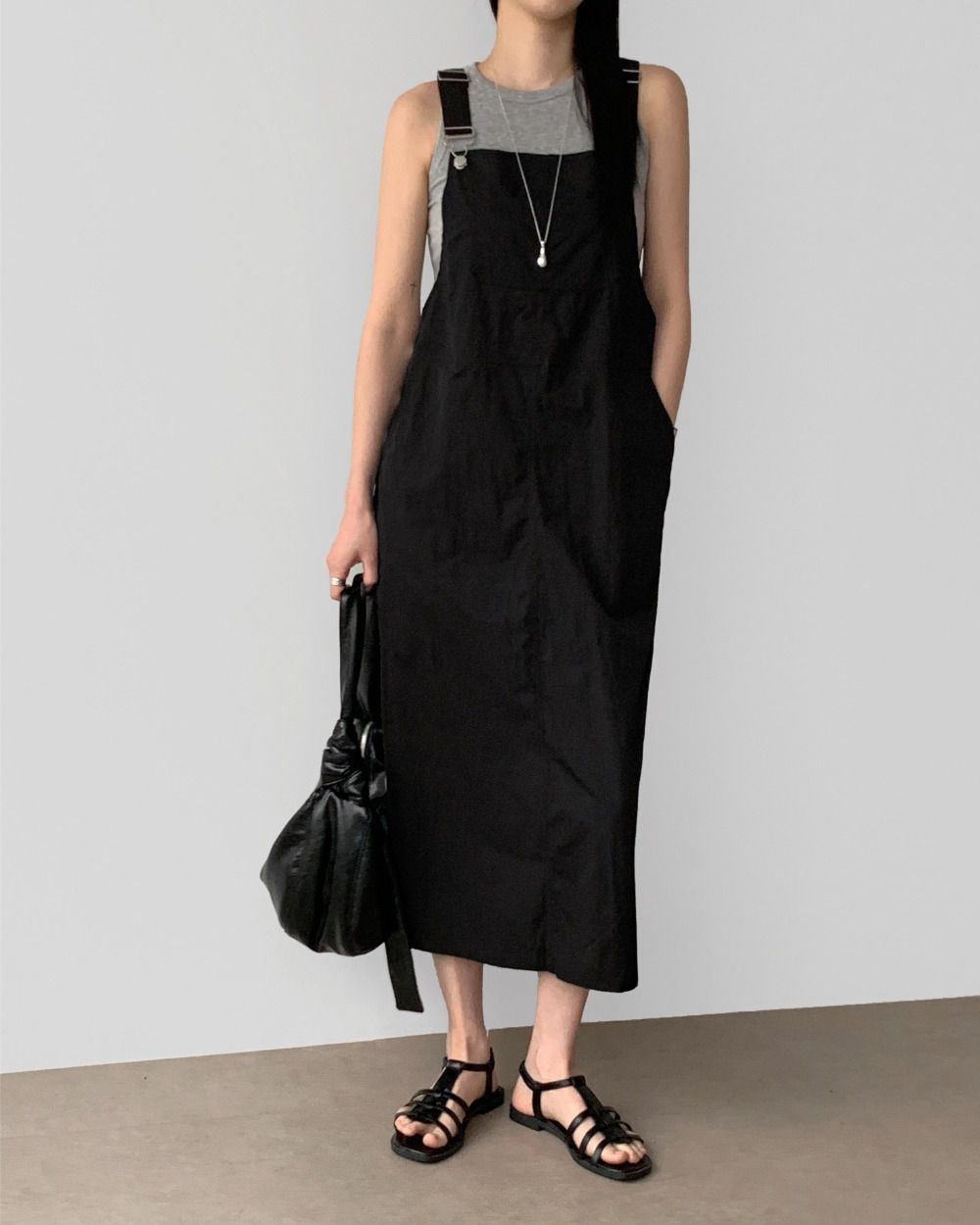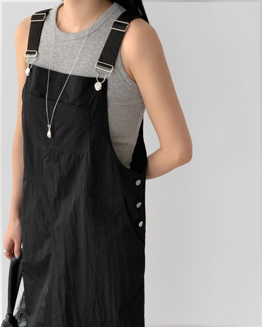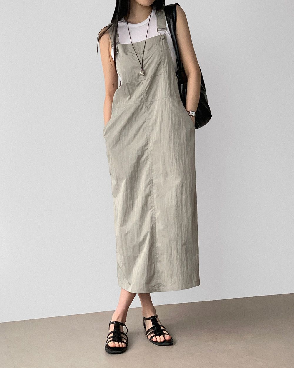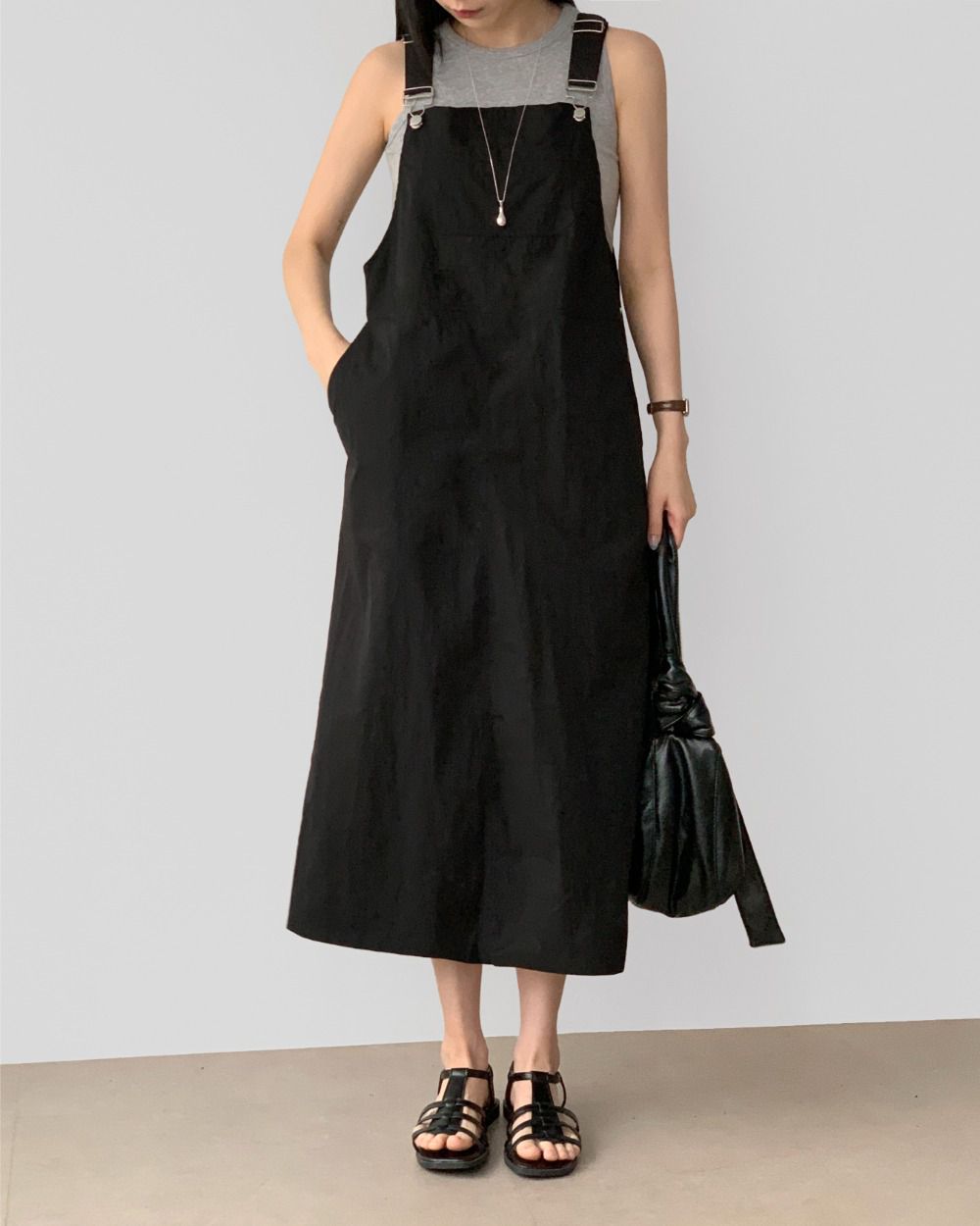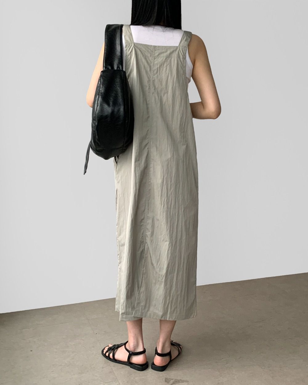 胸前大口袋/可調肩帶/平口/雙口袋/側邊三釦/直筒後開衩 - 休閒居家渡假簡約百搭素面平口吊帶裙無袖連身裙一件式洋裝吊帶洋裝