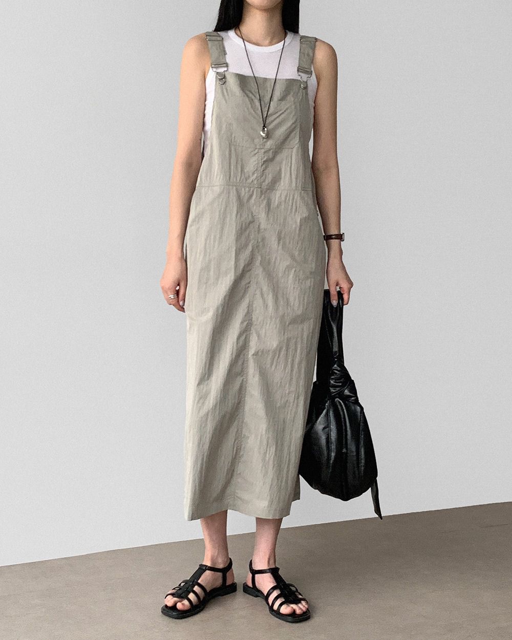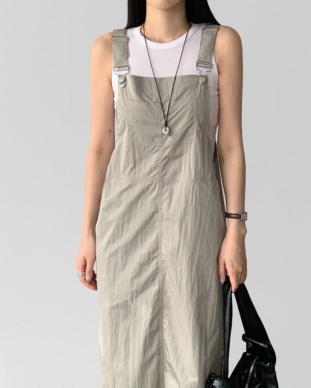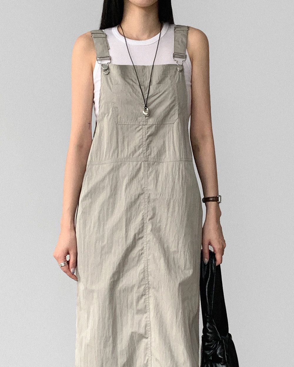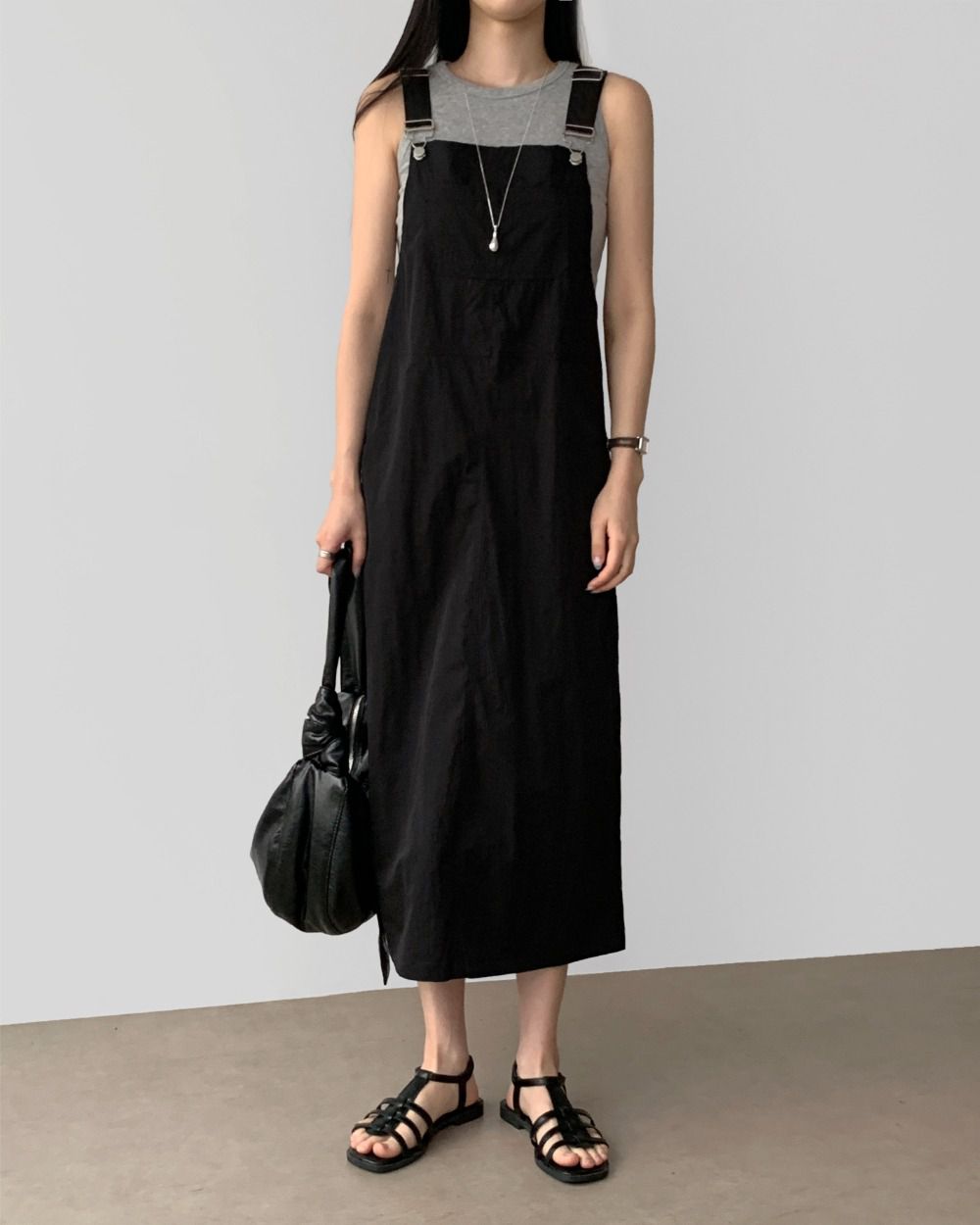 胸前大口袋/可調肩帶/平口/雙口袋/側邊三釦/直筒後開衩 - 休閒居家渡假簡約百搭素面平口吊帶裙無袖連身裙一件式洋裝吊帶洋裝