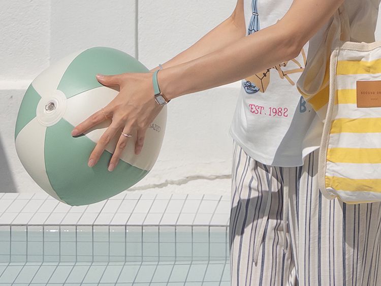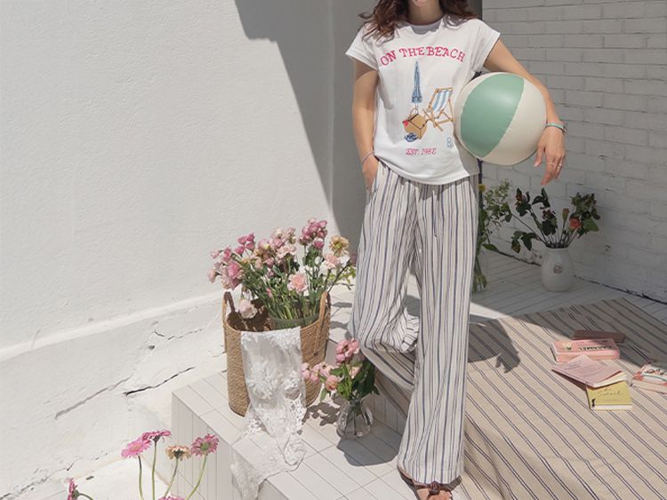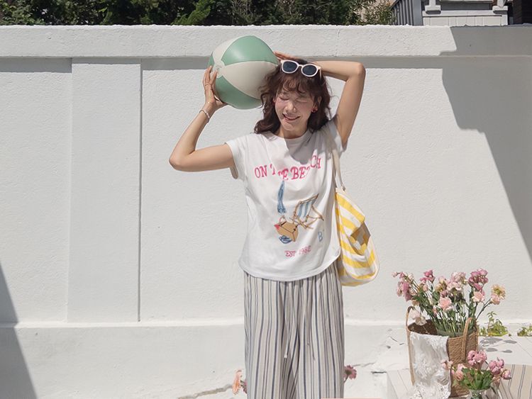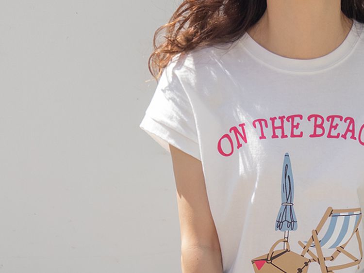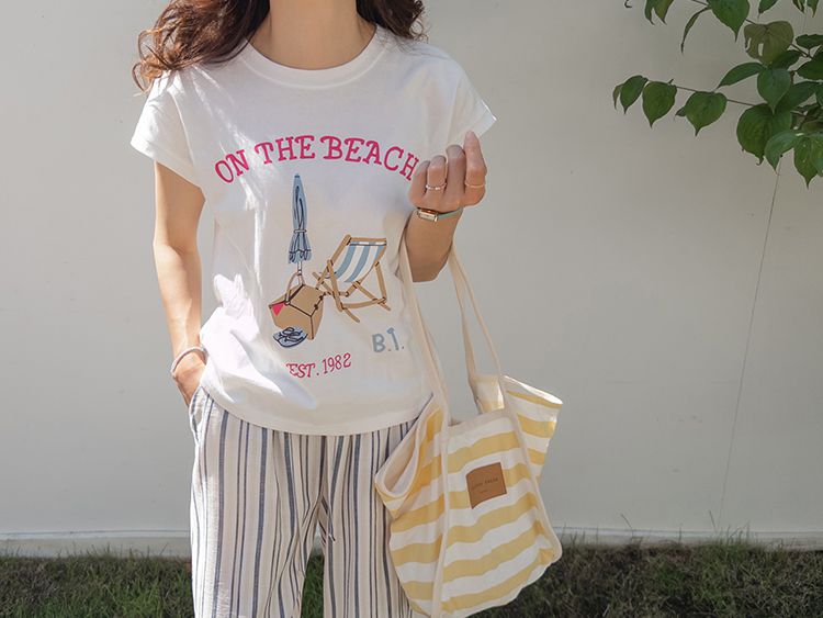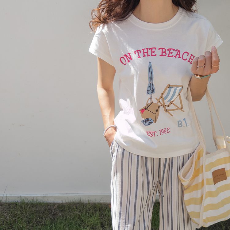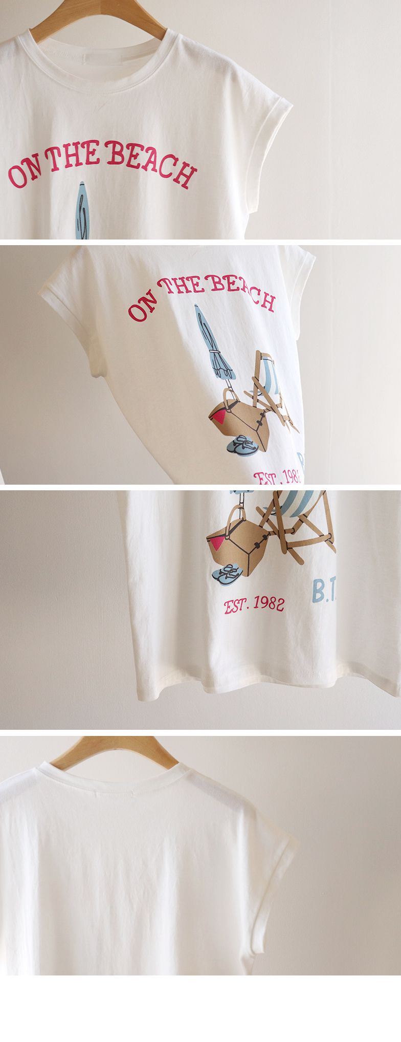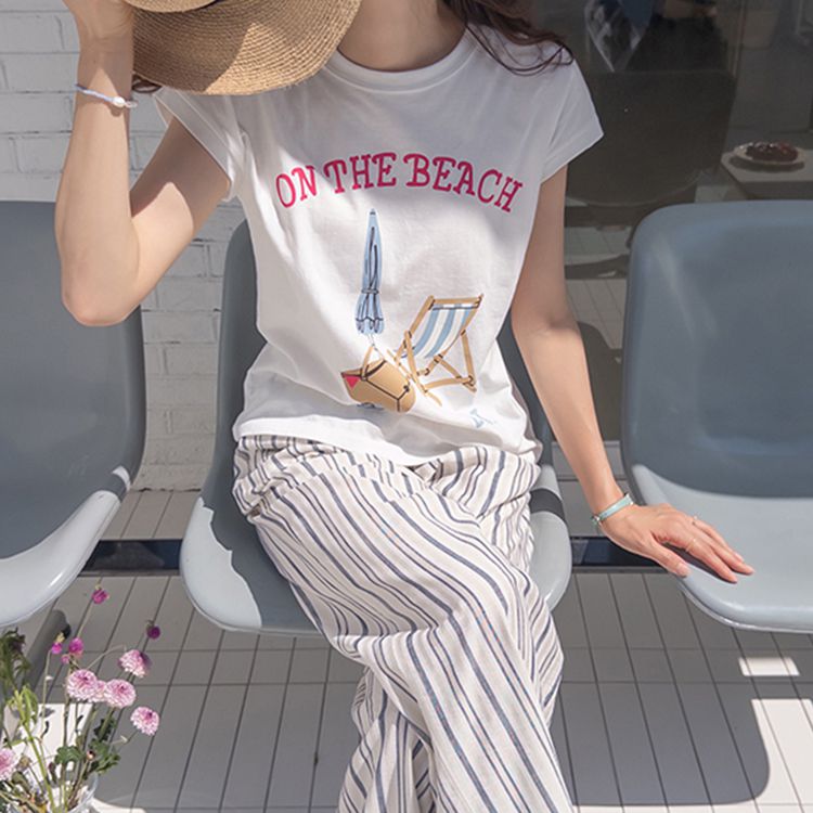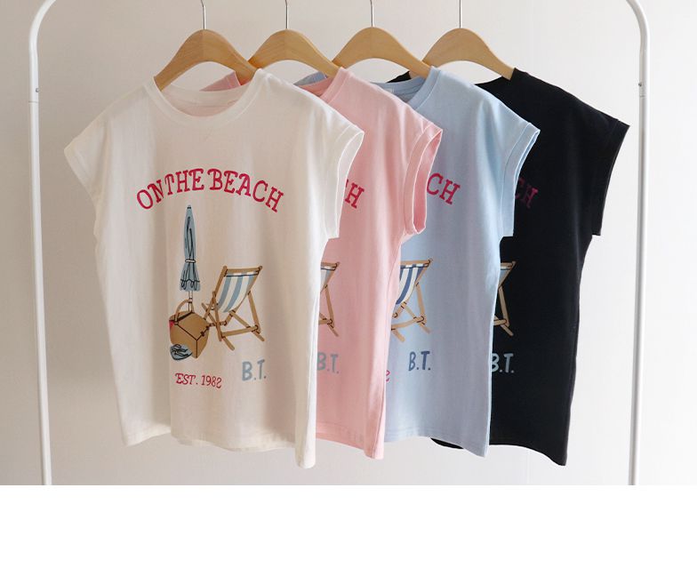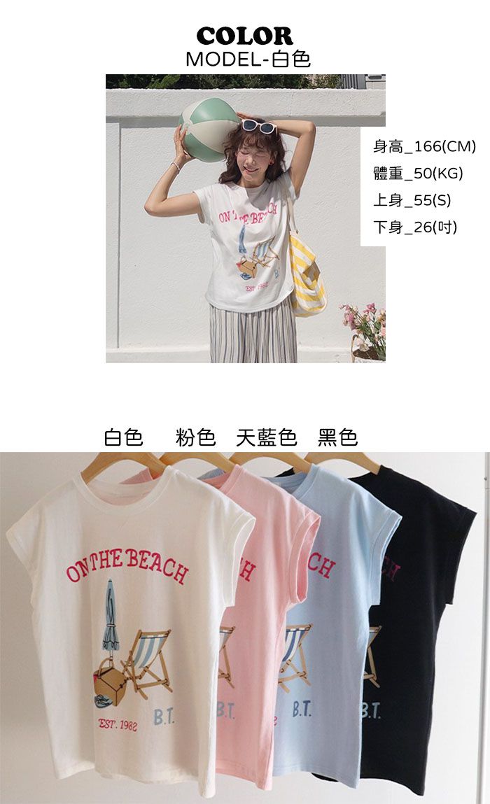 膠印海邊沙灘椅印花/圓領/連肩袖/小包肩短袖/棉質 - 休閒居家沙灘椅印花T恤夏日圖騰連肩短袖上衣天藍色粉色黑色白色