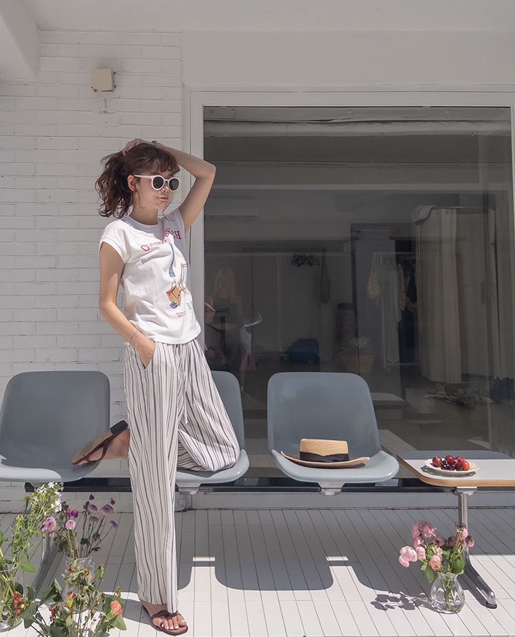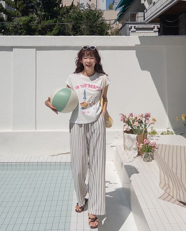 【C55099】韓國LEE 夏日印花T恤-圓領沙灘椅圖騰連肩短袖棉質上衣★★