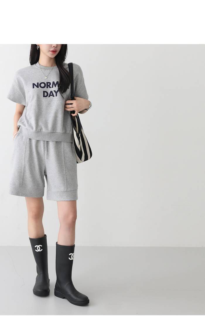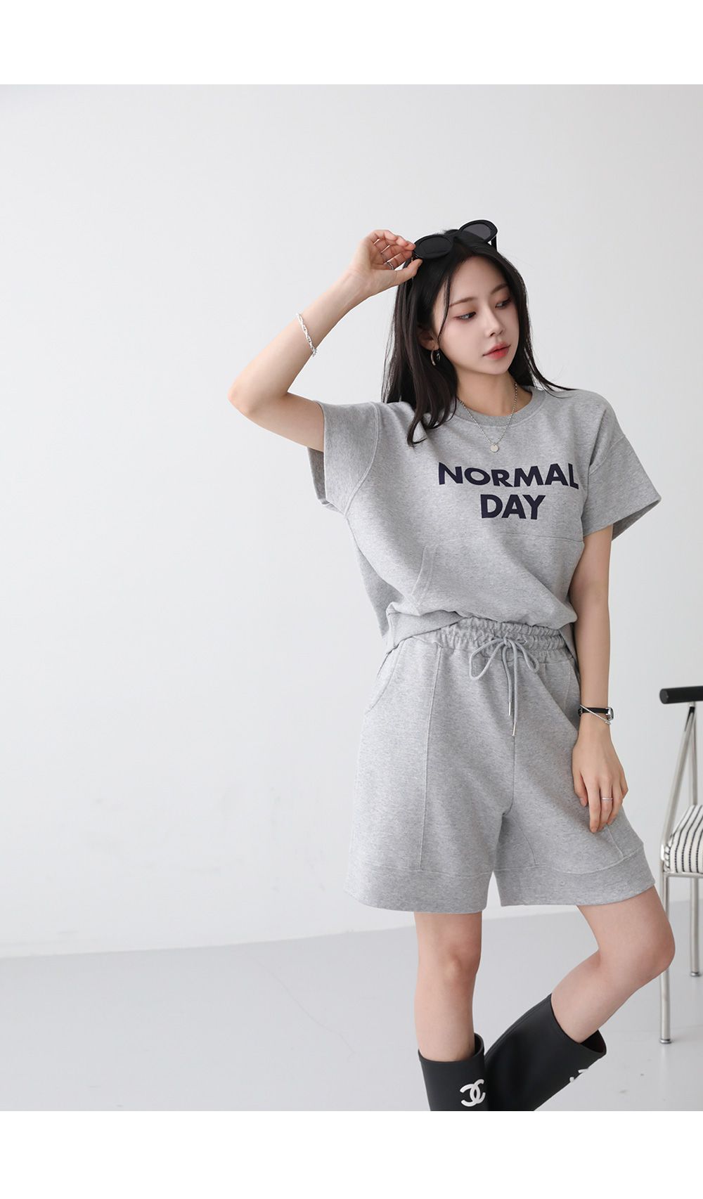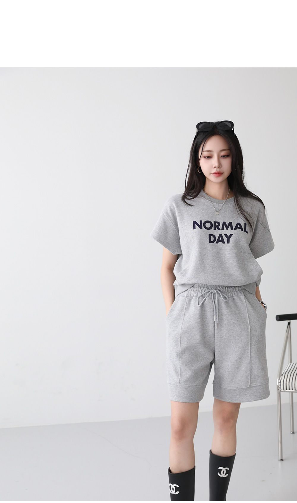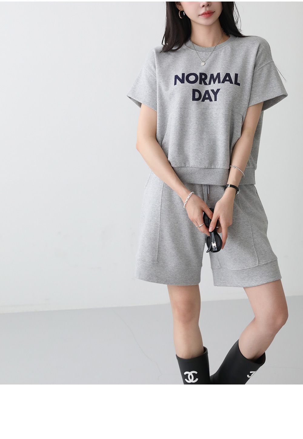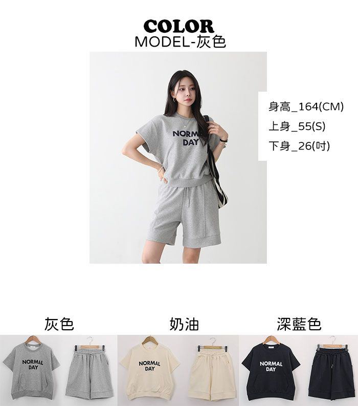 超值兩件組/圓領/寬袖/大口袋上衣/棉質/加寬抽繩鬆緊腰/雙口袋/立體車線短褲 - 大口袋字母套裝短袖上衣出芽車線短褲兩件式套裝灰色奶油色深藍色