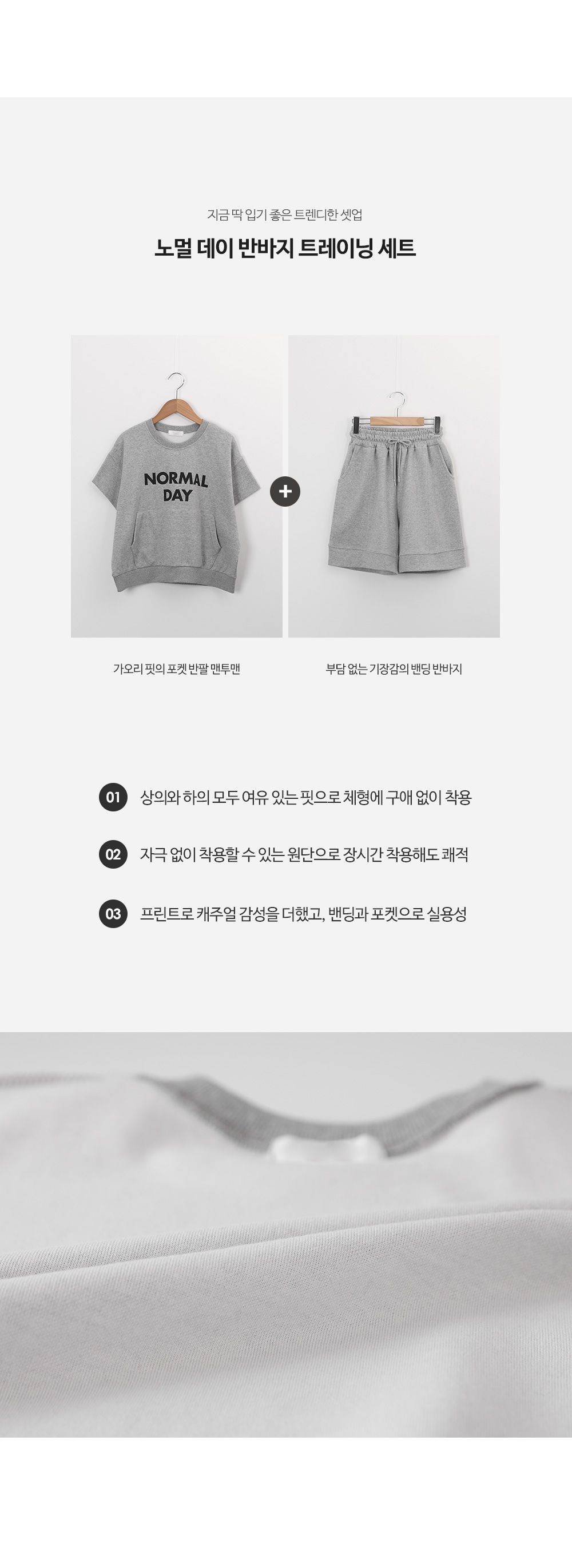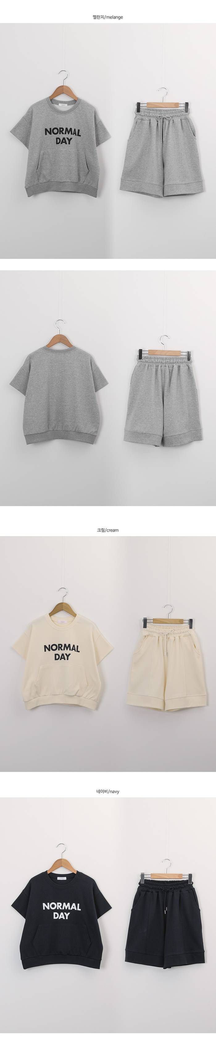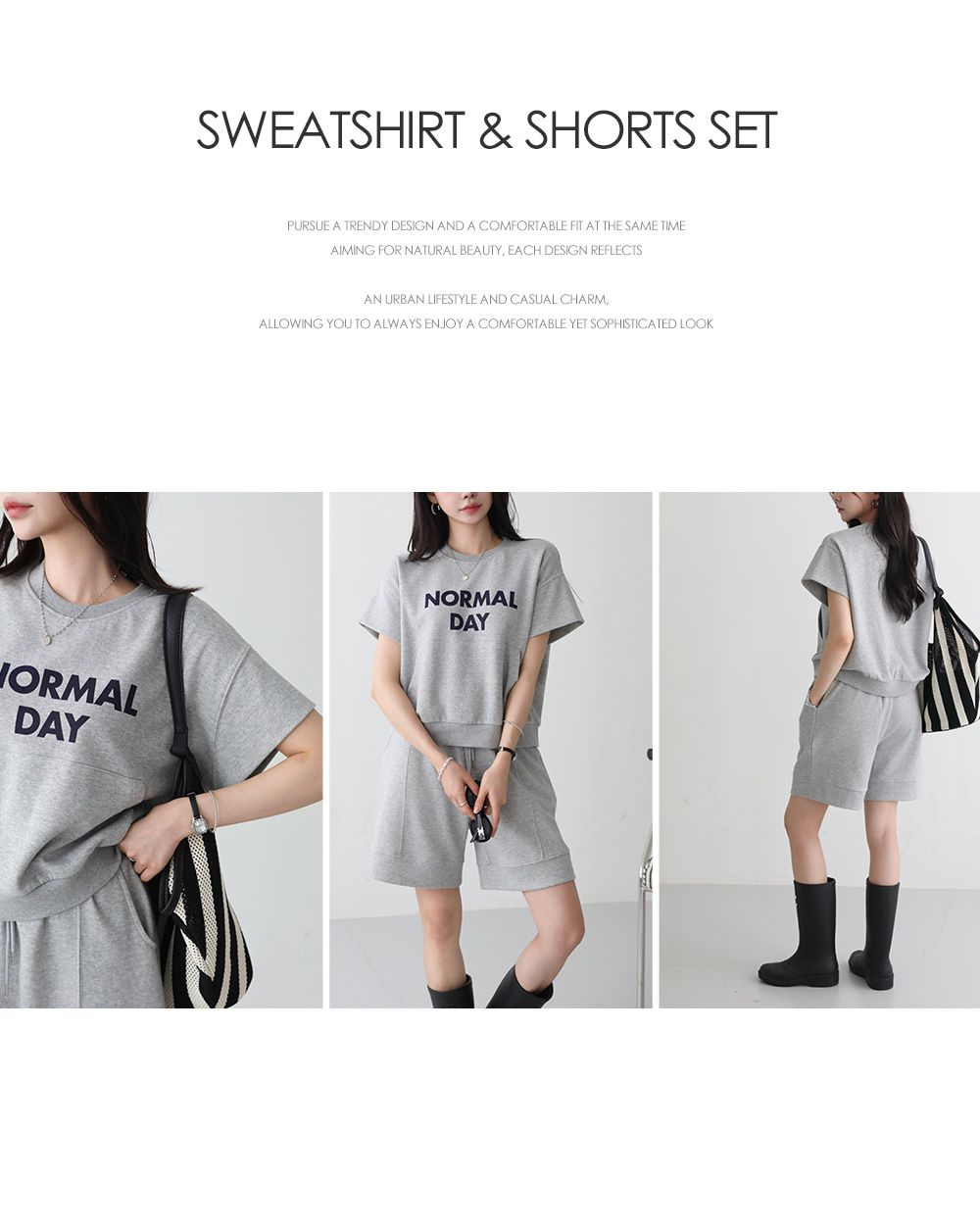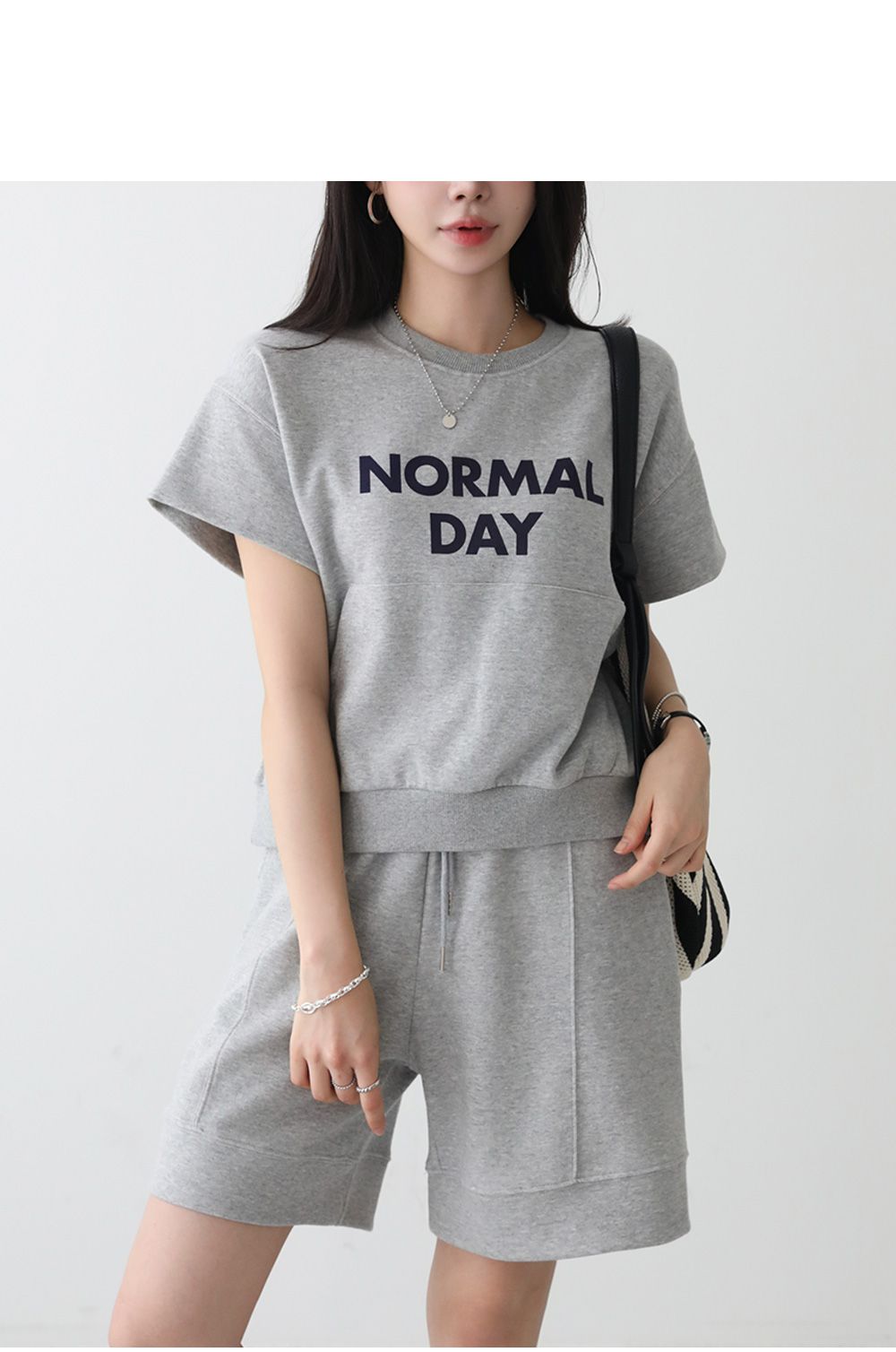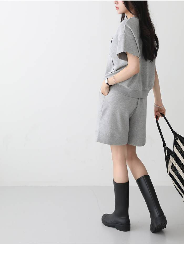 超值兩件組/圓領/寬袖/大口袋上衣/棉質/加寬抽繩鬆緊腰/雙口袋/立體車線短褲 - 大口袋字母套裝短袖上衣出芽車線短褲兩件式套裝灰色奶油色深藍色