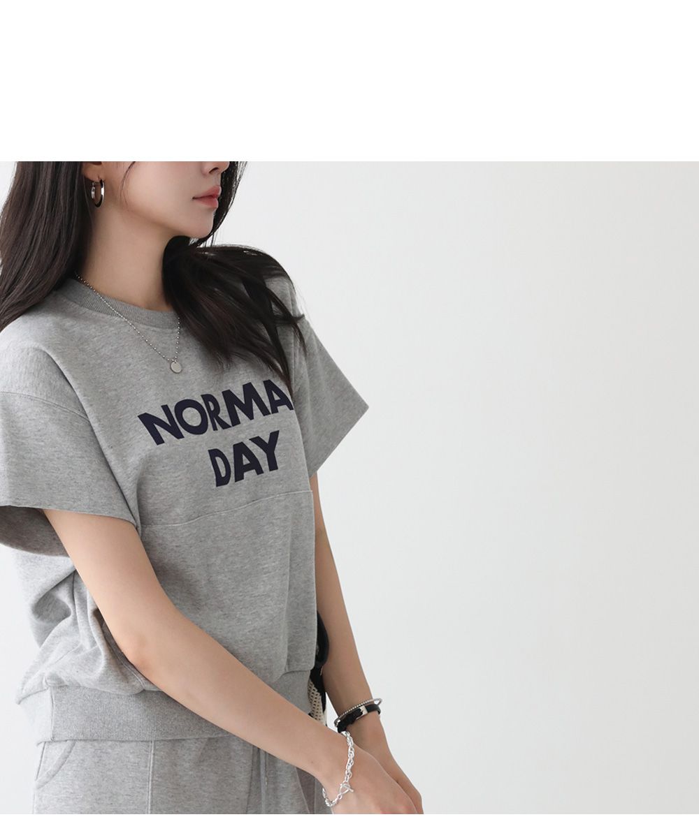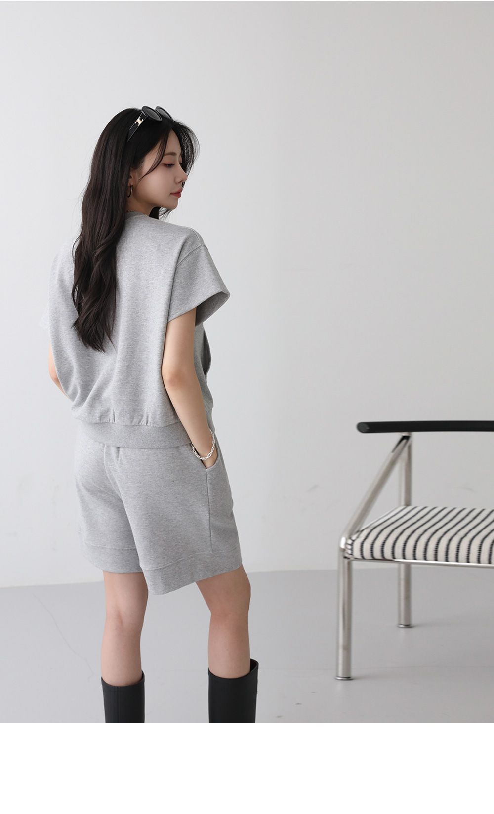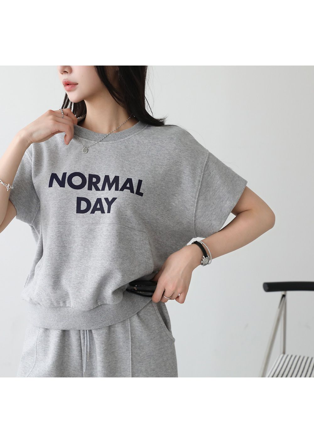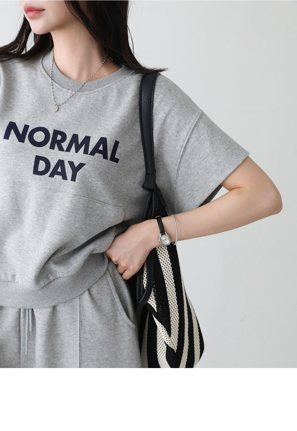 超值兩件組/圓領/寬袖/大口袋上衣/棉質/加寬抽繩鬆緊腰/雙口袋/立體車線短褲 - 大口袋字母套裝短袖上衣出芽車線短褲兩件式套裝灰色奶油色深藍色