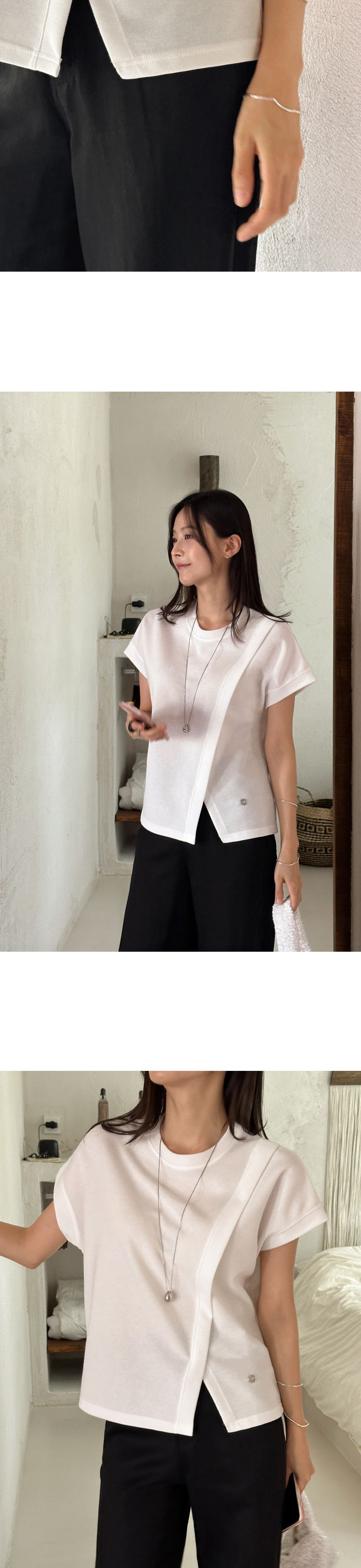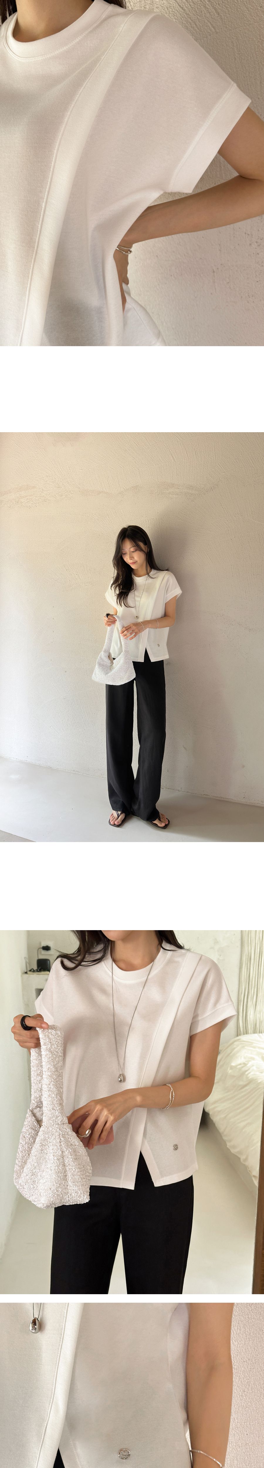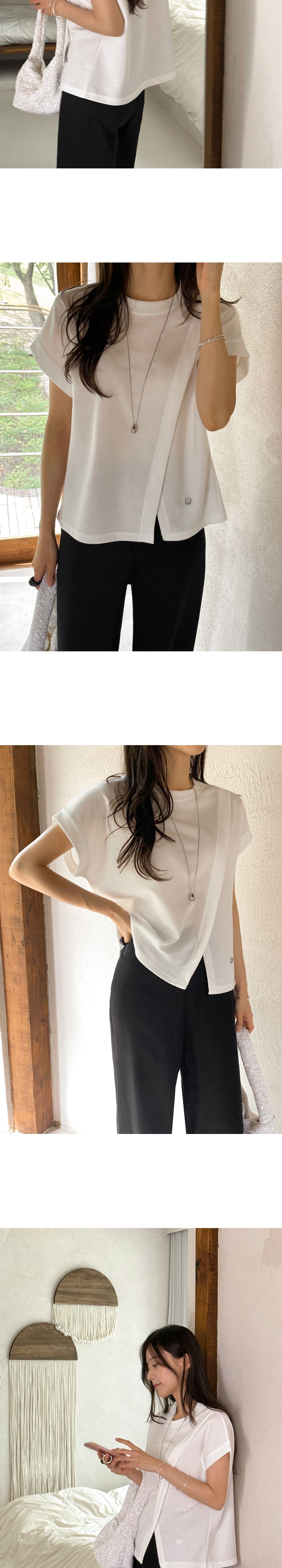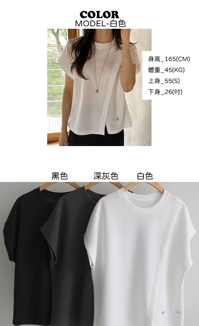 LOGO吊牌/不對稱斜邊開衩/圓領/連肩袖 - 休閒居家簡約百搭素面斜切開衩T恤上衣短袖上衣白色深灰色黑色