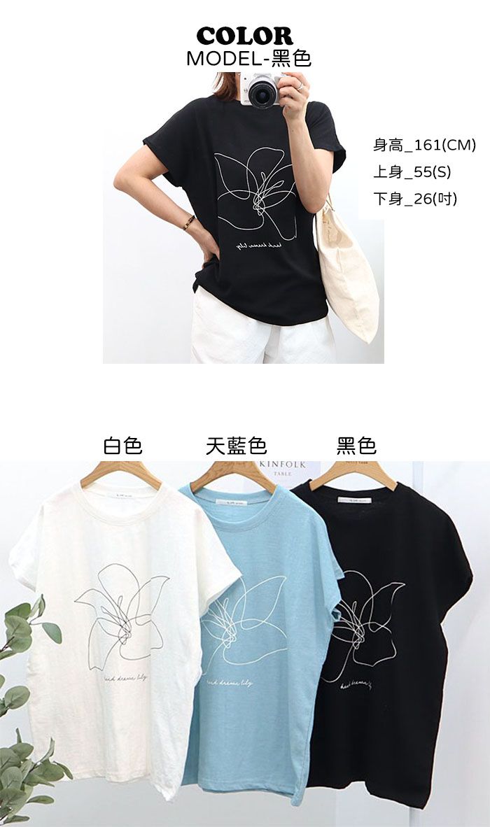 膠印線條花朵/圓領/連肩袖/棉質 - 休閒居家花朵印花上衣印花T恤線條花朵T恤短袖上衣天藍色黑色白色
