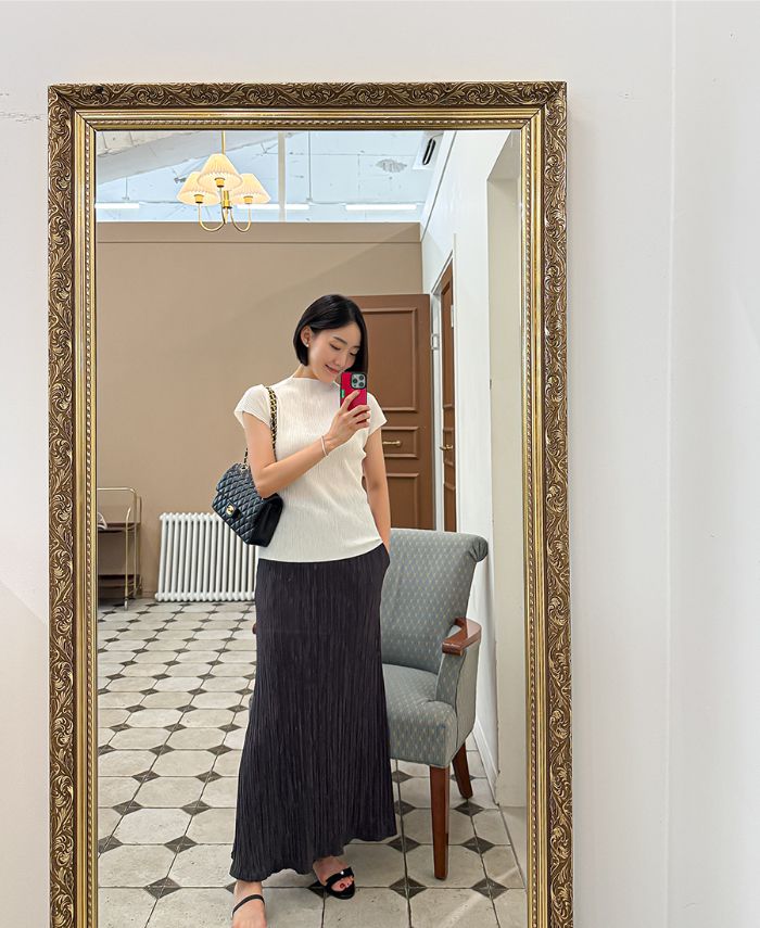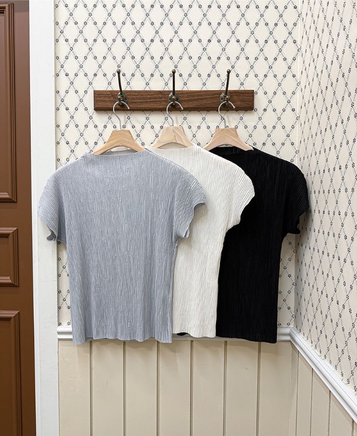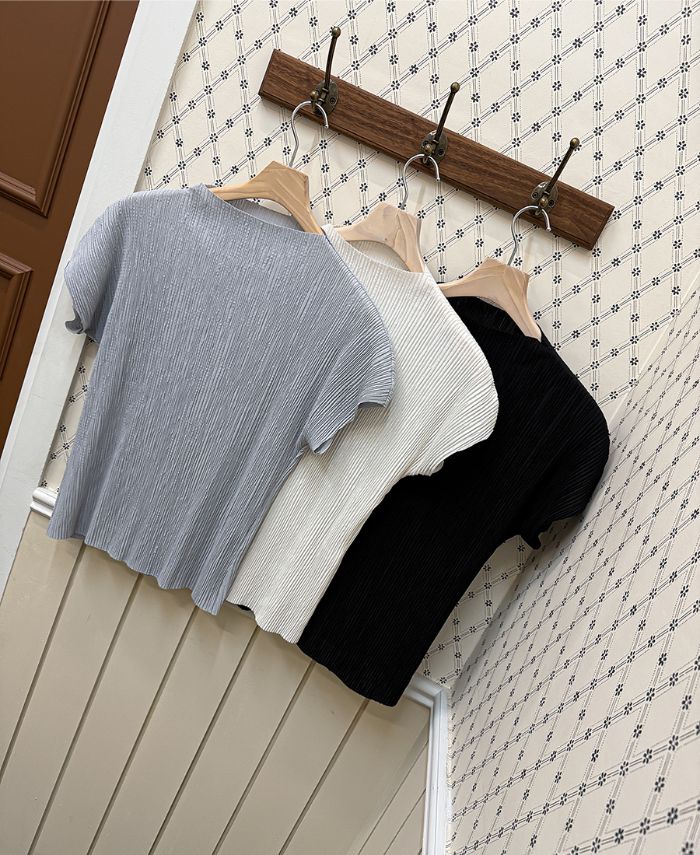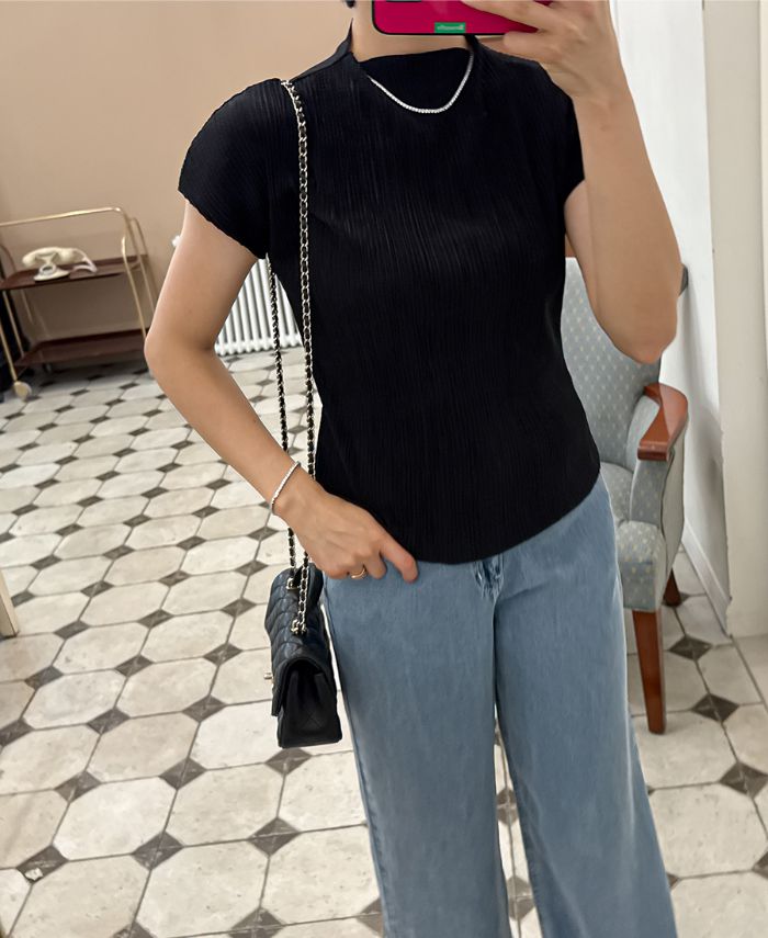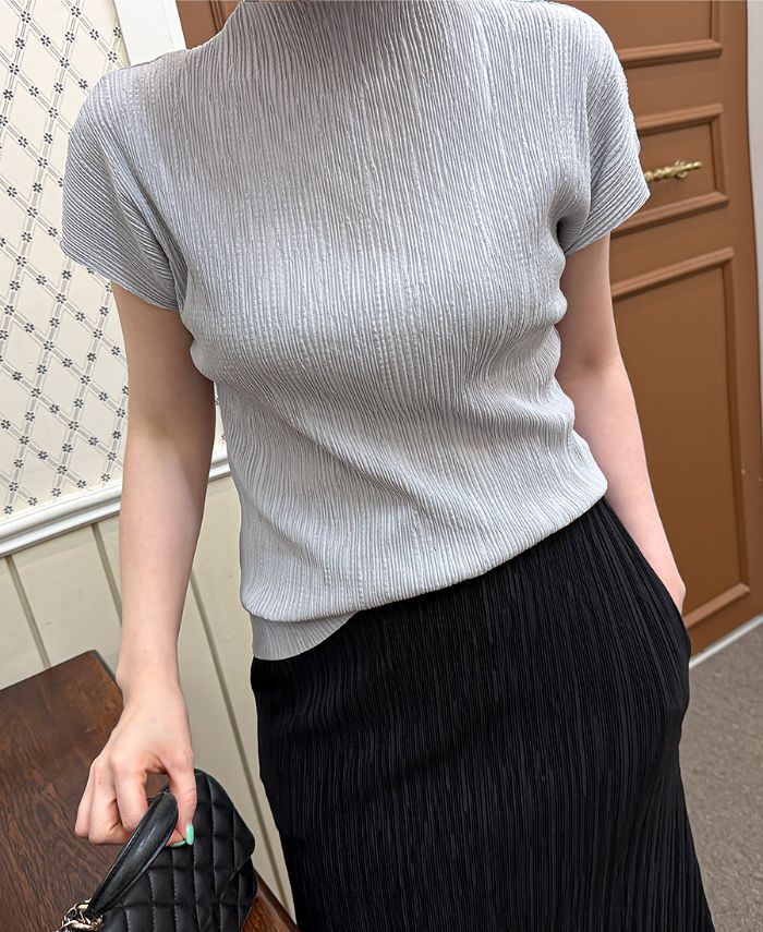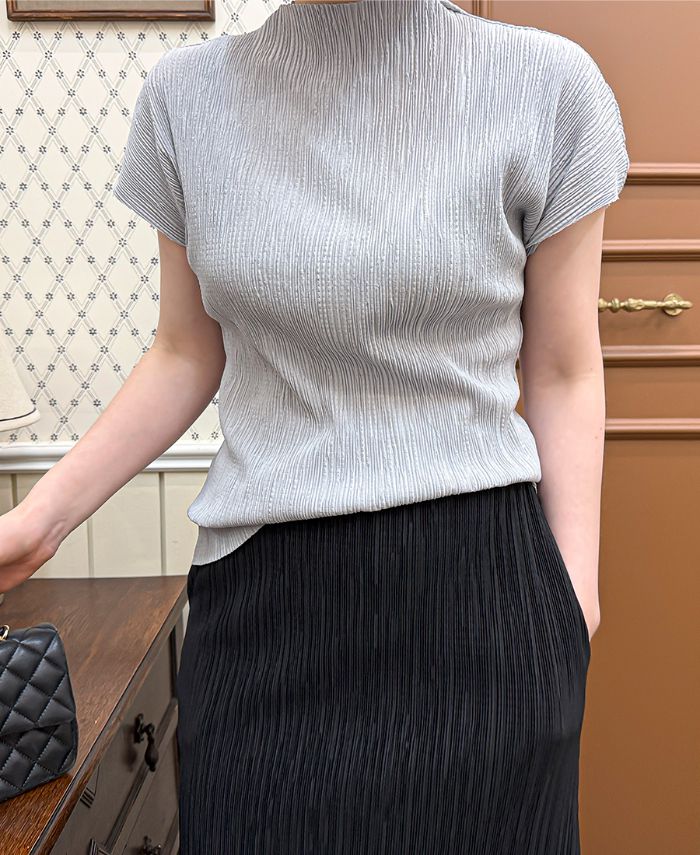 百褶上衣/高領/不收邊/連肩袖/立領 - 休閒居家OL上班族簡約百搭素面褶襉立領上衣短袖T恤黑色象牙色天藍色