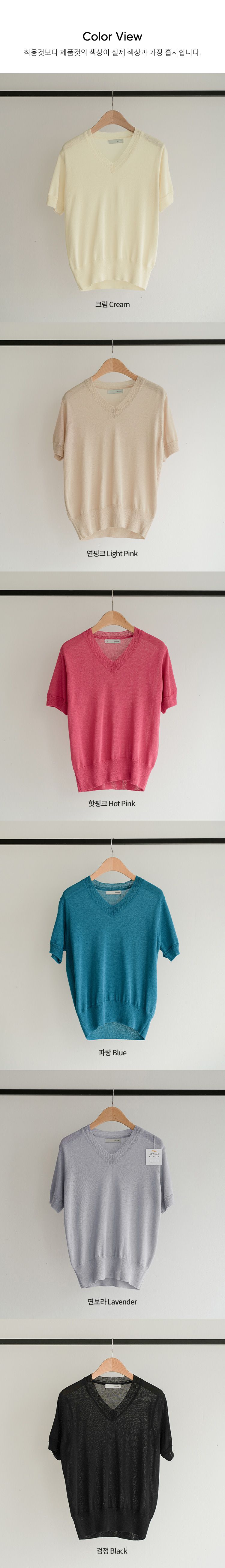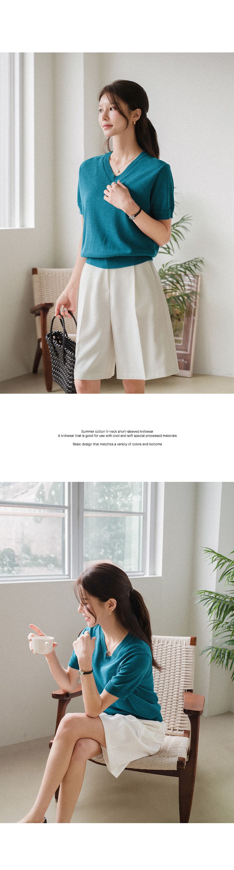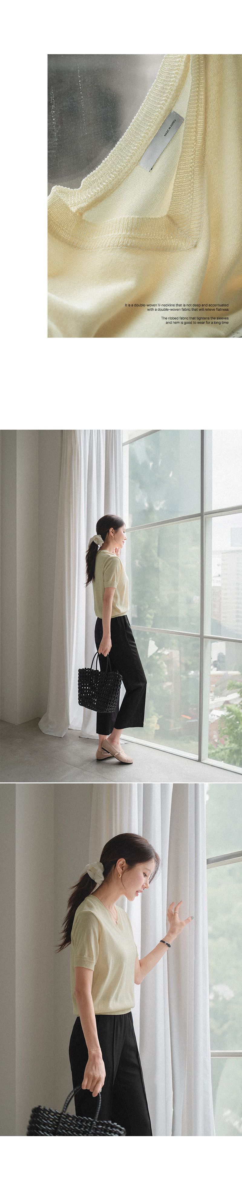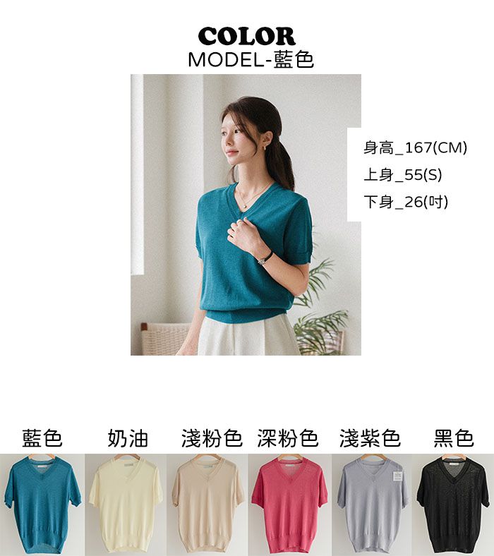 輕薄好氣色/滾邊袖口/V領 - 休閒居家OL上班族簡約百搭素面V領針織衫針織上衣短袖上衣藍色奶油色淺粉色深粉色淺紫色黑色