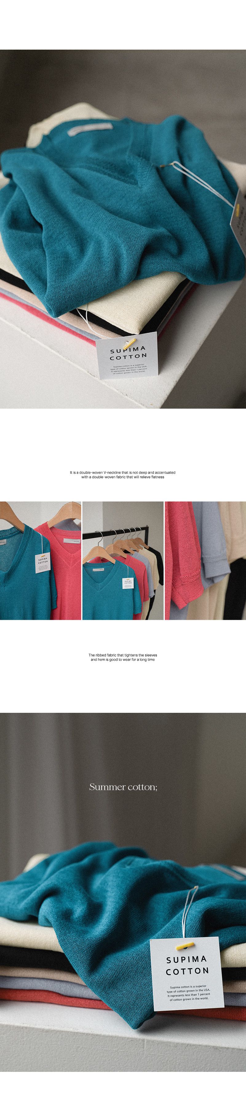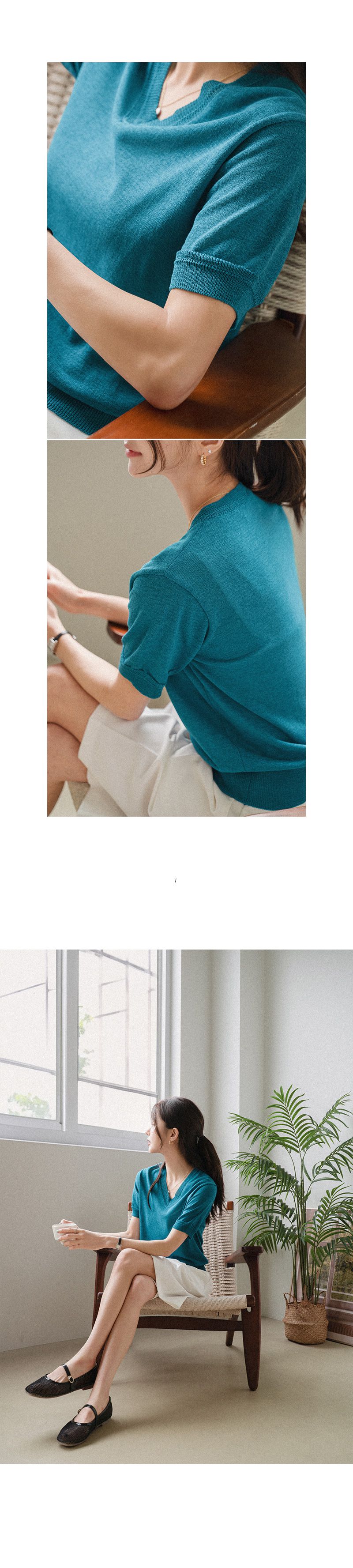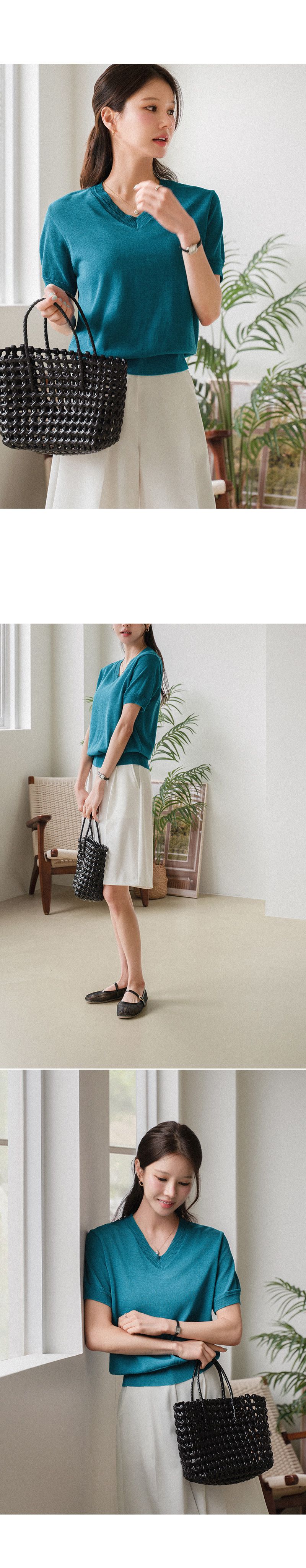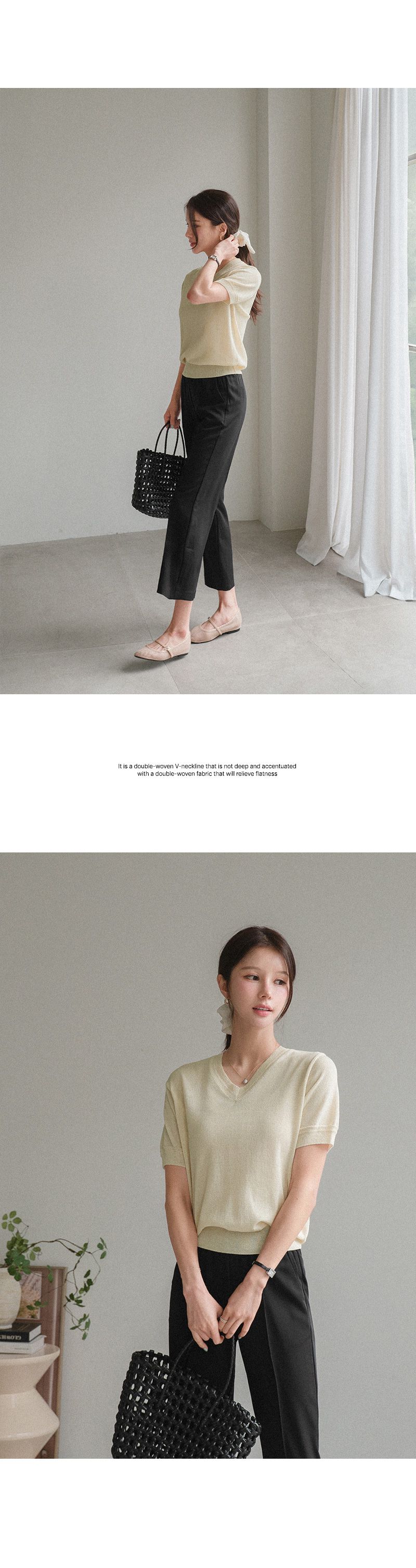 輕薄好氣色/滾邊袖口/V領 - 休閒居家OL上班族簡約百搭素面V領針織衫針織上衣短袖上衣藍色奶油色淺粉色深粉色淺紫色黑色