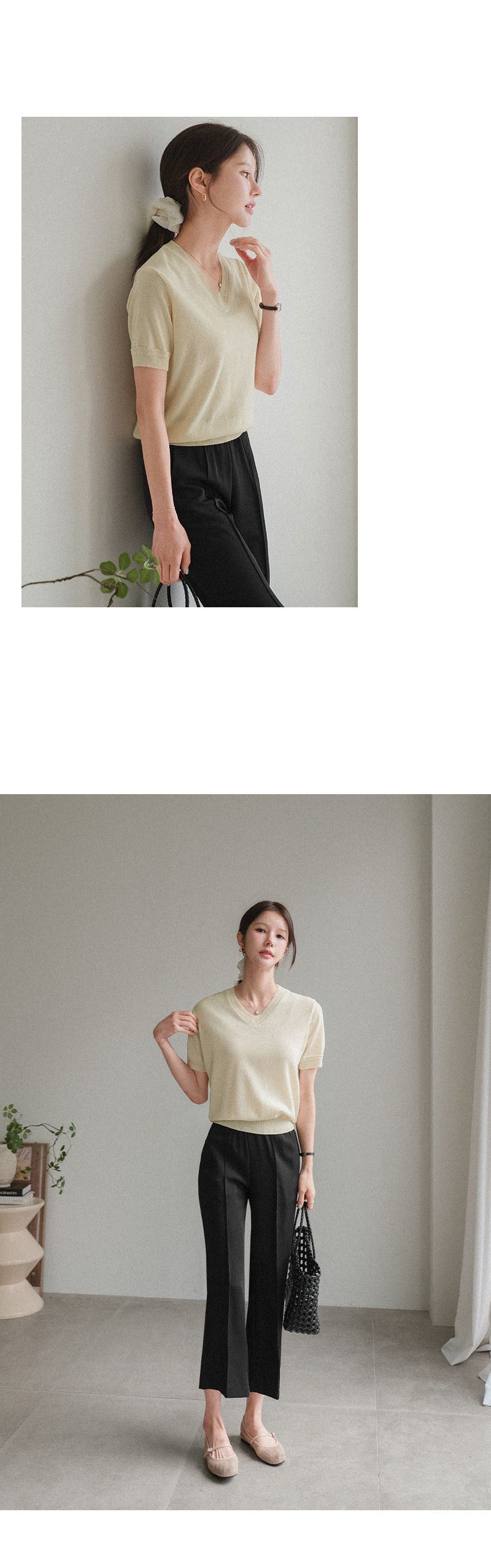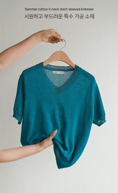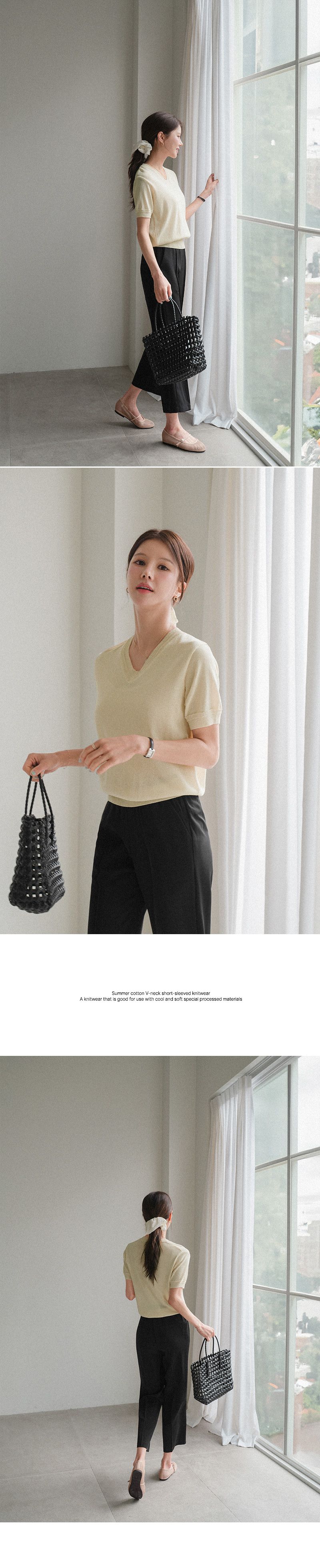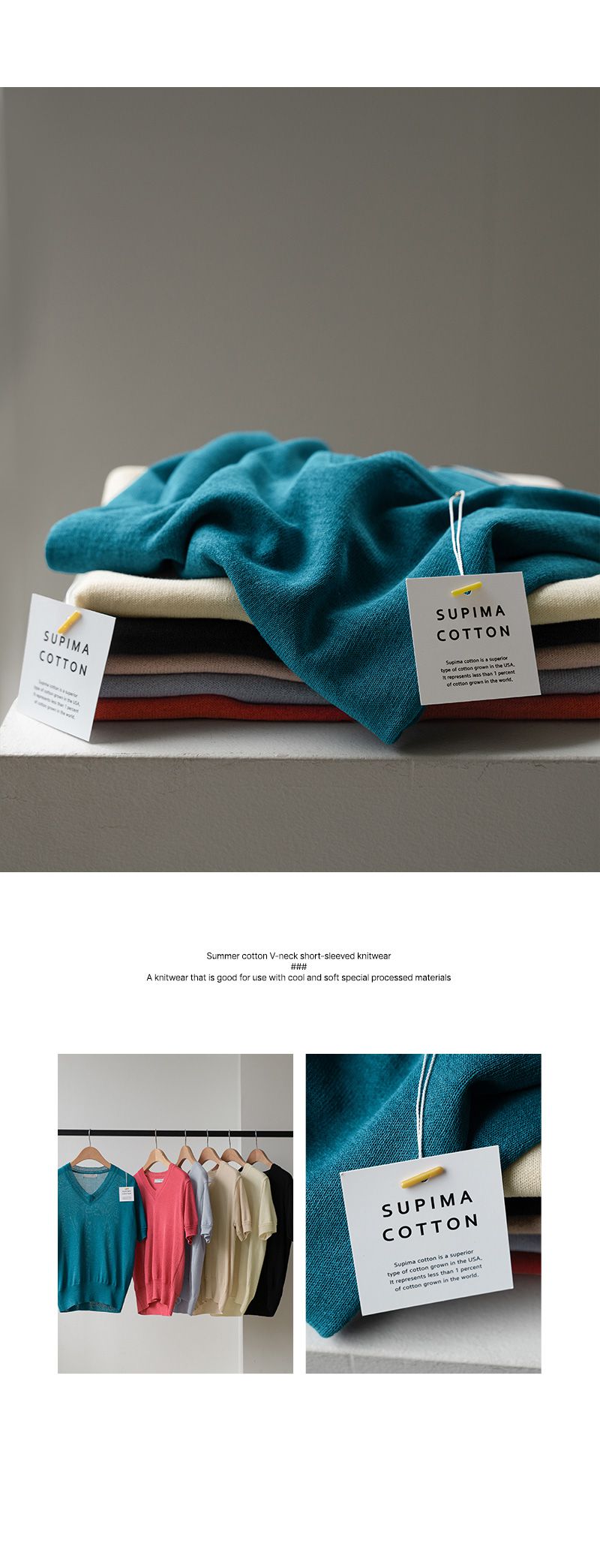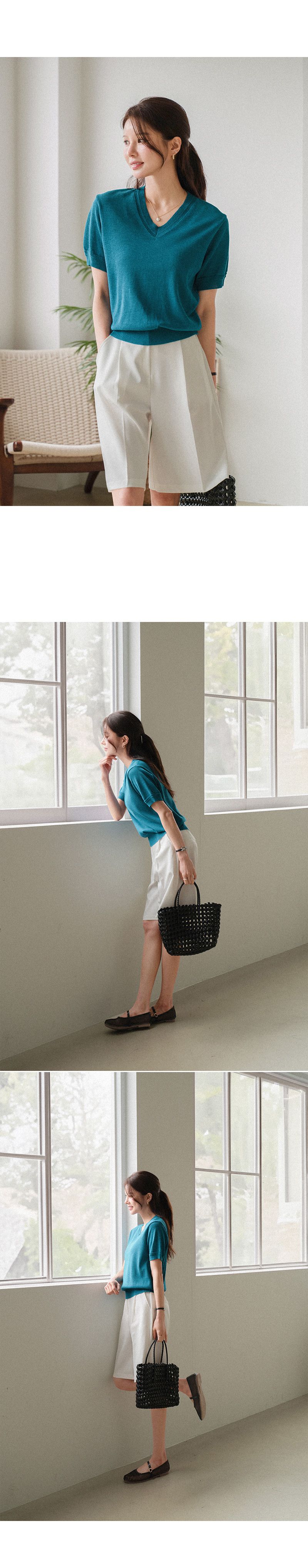 輕薄好氣色/滾邊袖口/V領 - 休閒居家OL上班族簡約百搭素面V領針織衫針織上衣短袖上衣藍色奶油色淺粉色深粉色淺紫色黑色