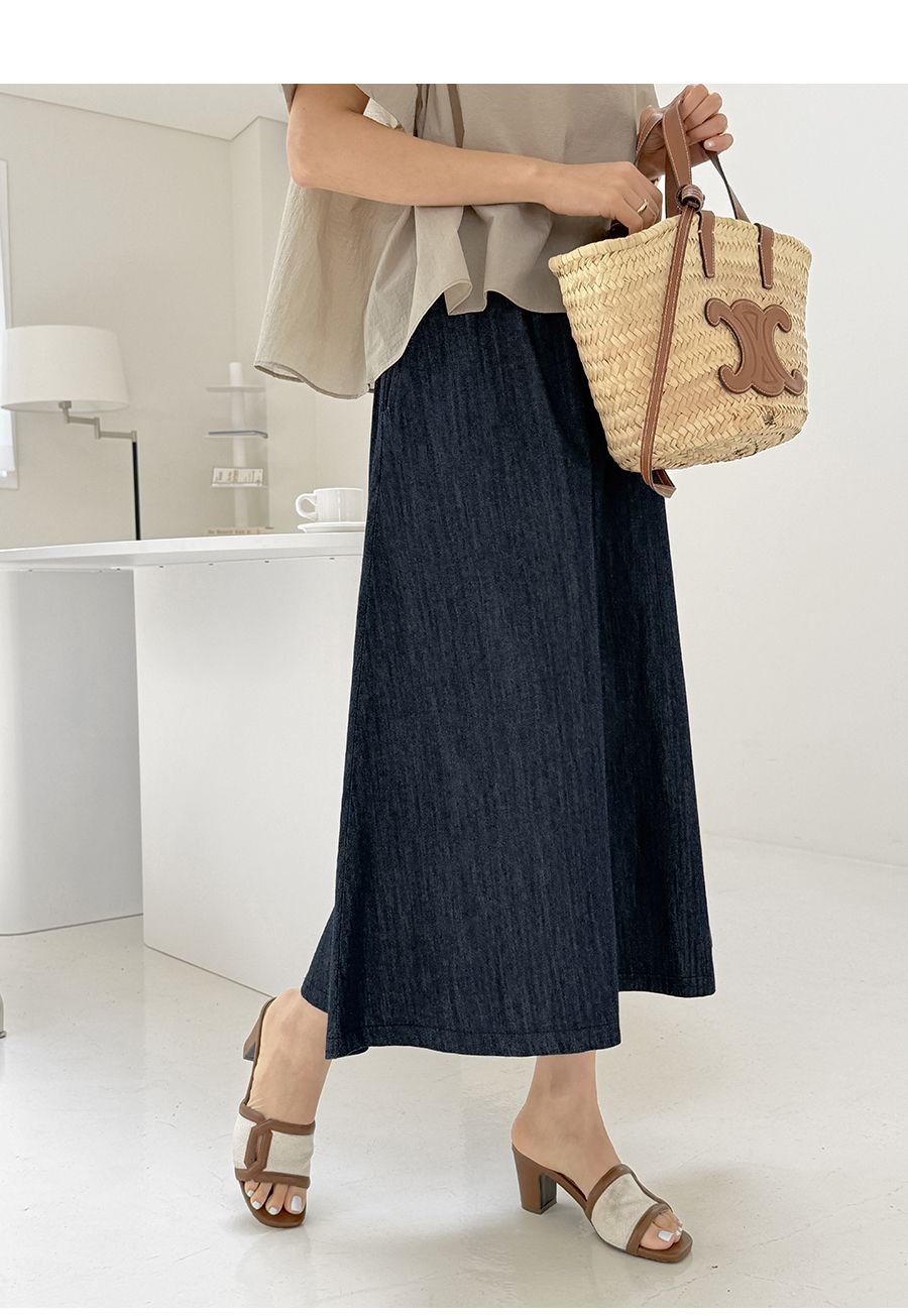 全腰鬆緊/寬鬆大尺碼牛仔褲/A字傘狀/雙口袋/棉質 - 休閒居家渡假簡約百搭素面棉質牛仔寬褲牛仔褲八分褲多尺寸FL深青色