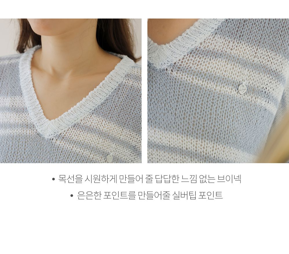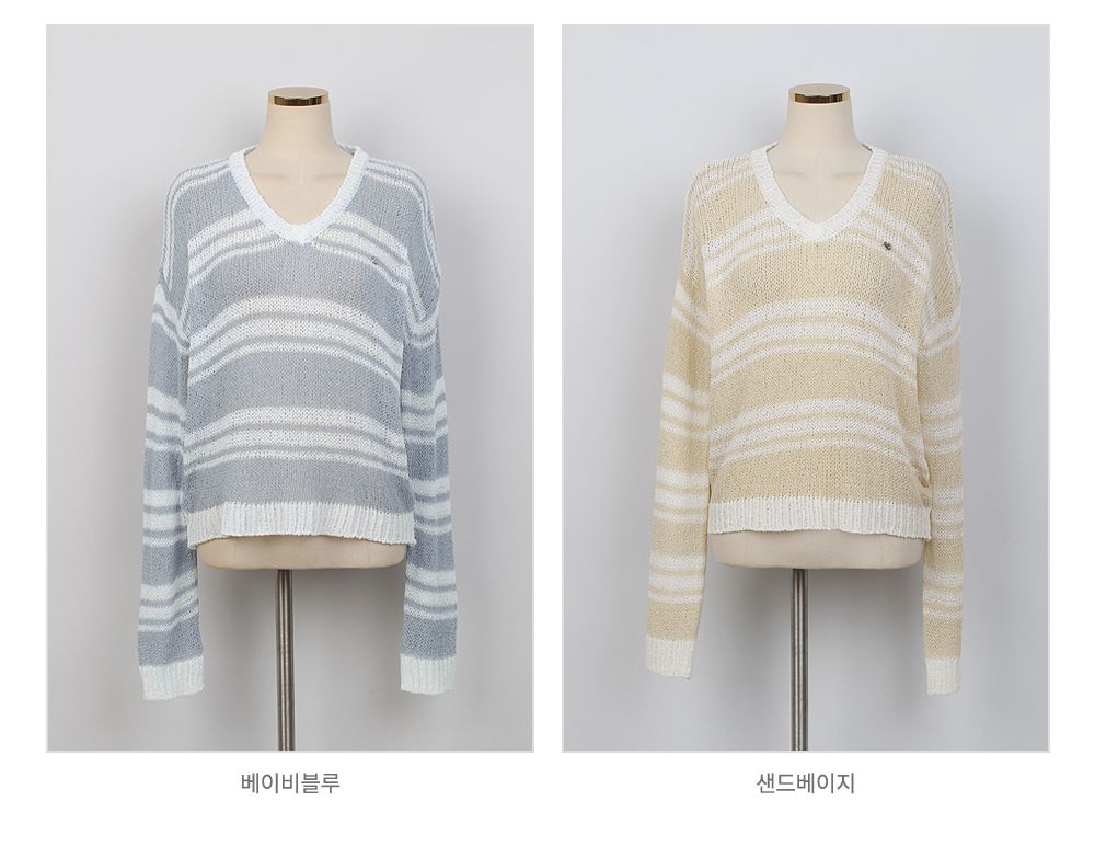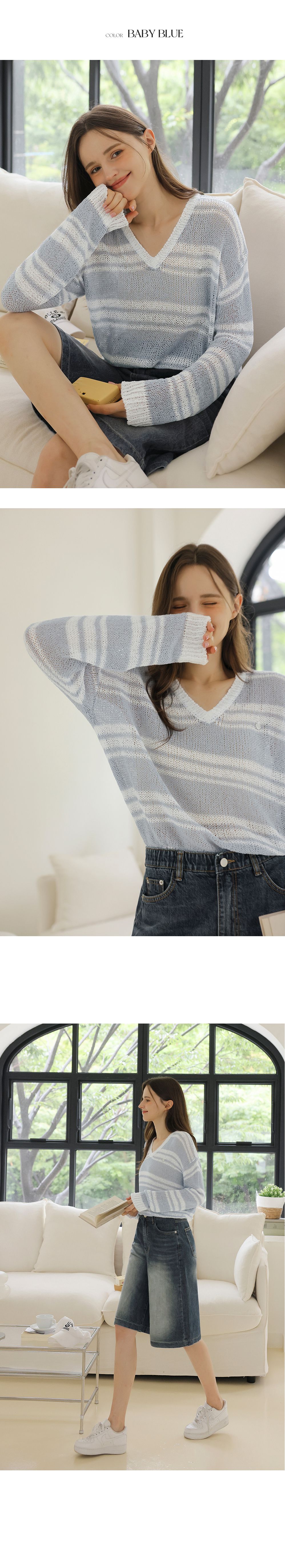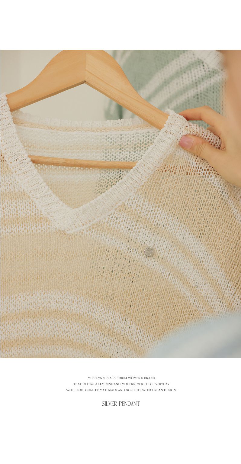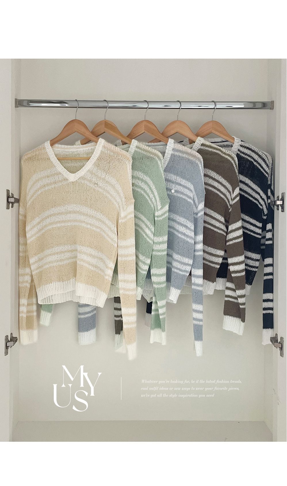 【C55148】韓國MID 條紋洞洞針織衫-V領金屬吊牌慵懶落肩長袖上衣