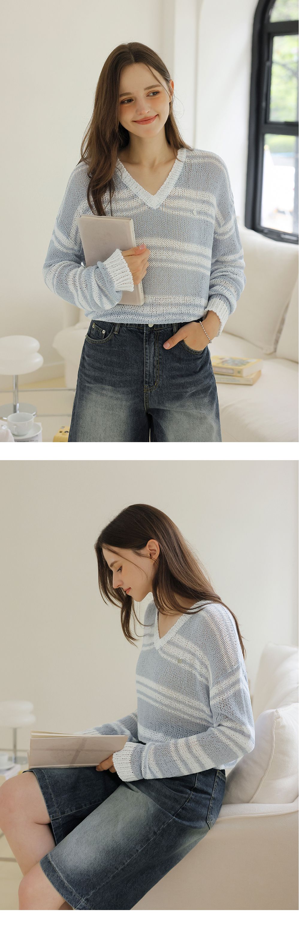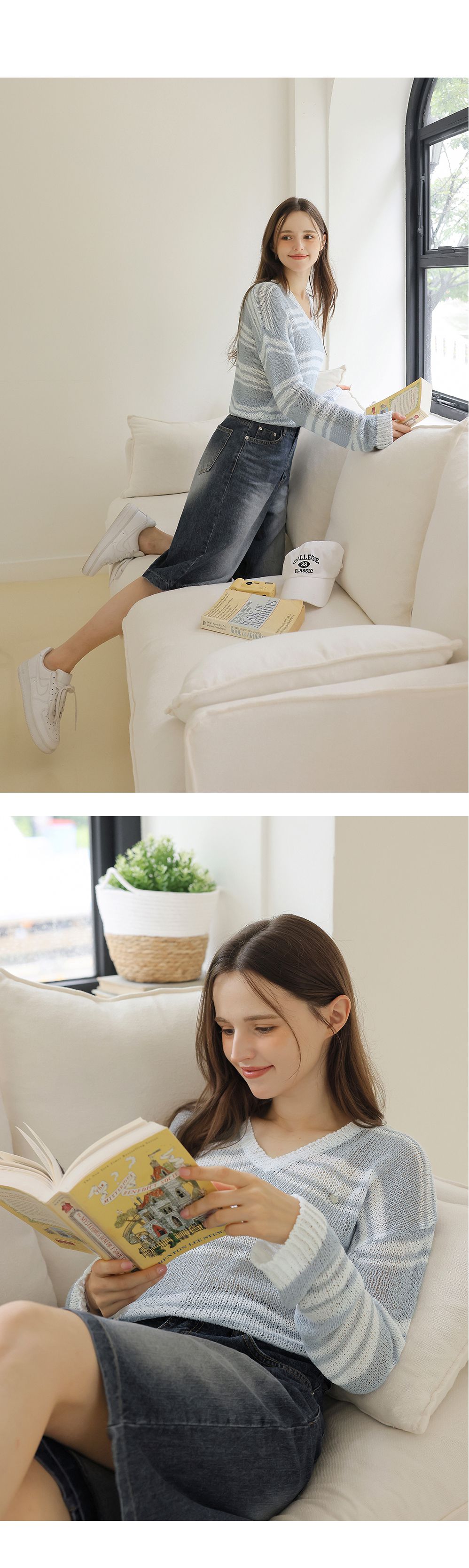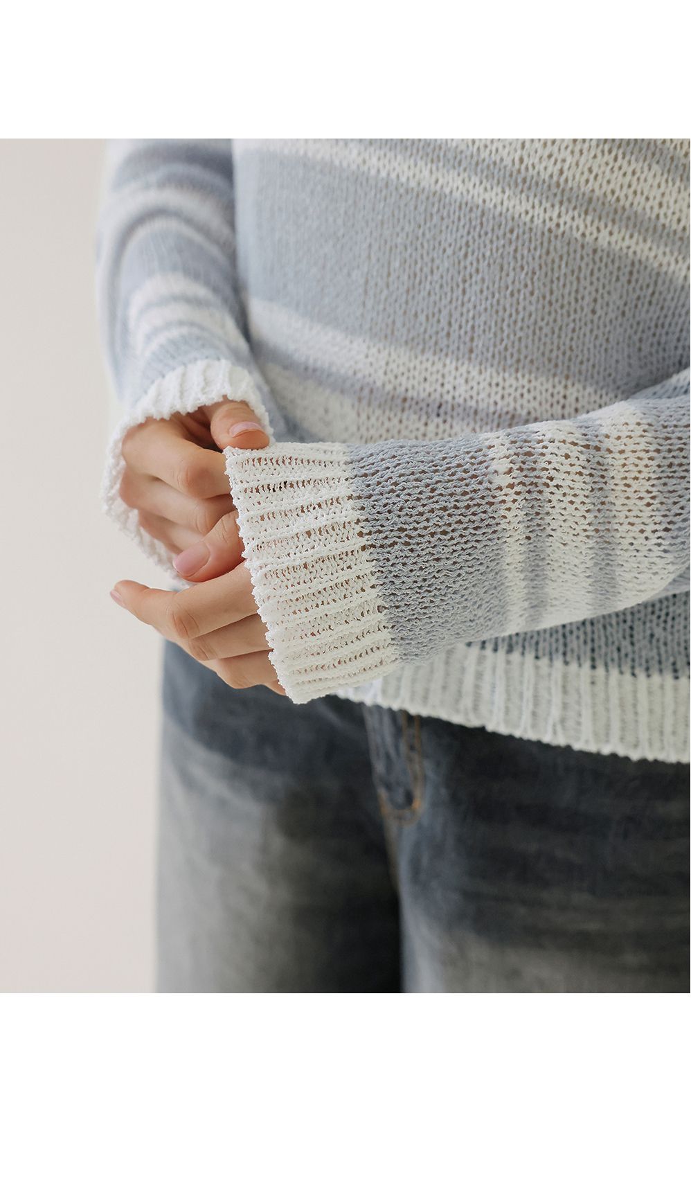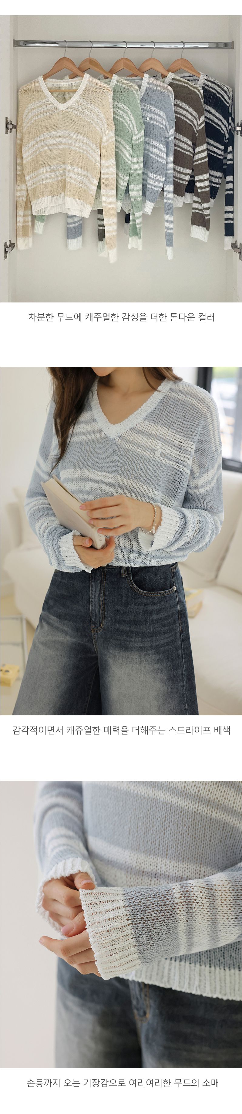 【C55148】韓國MID 條紋洞洞針織衫-V領金屬吊牌慵懶落肩長袖上衣