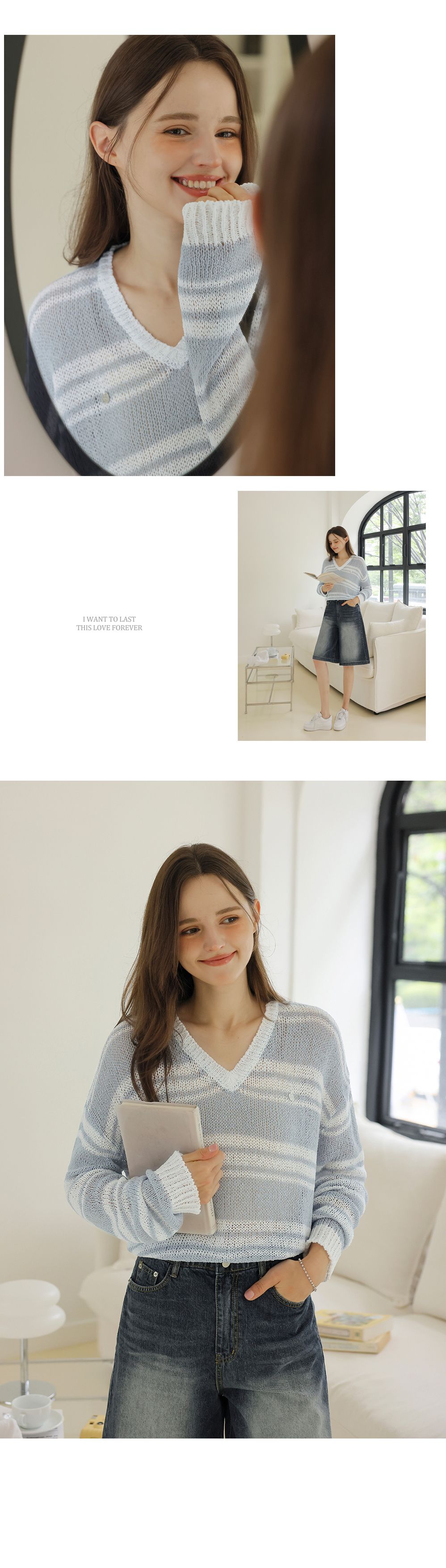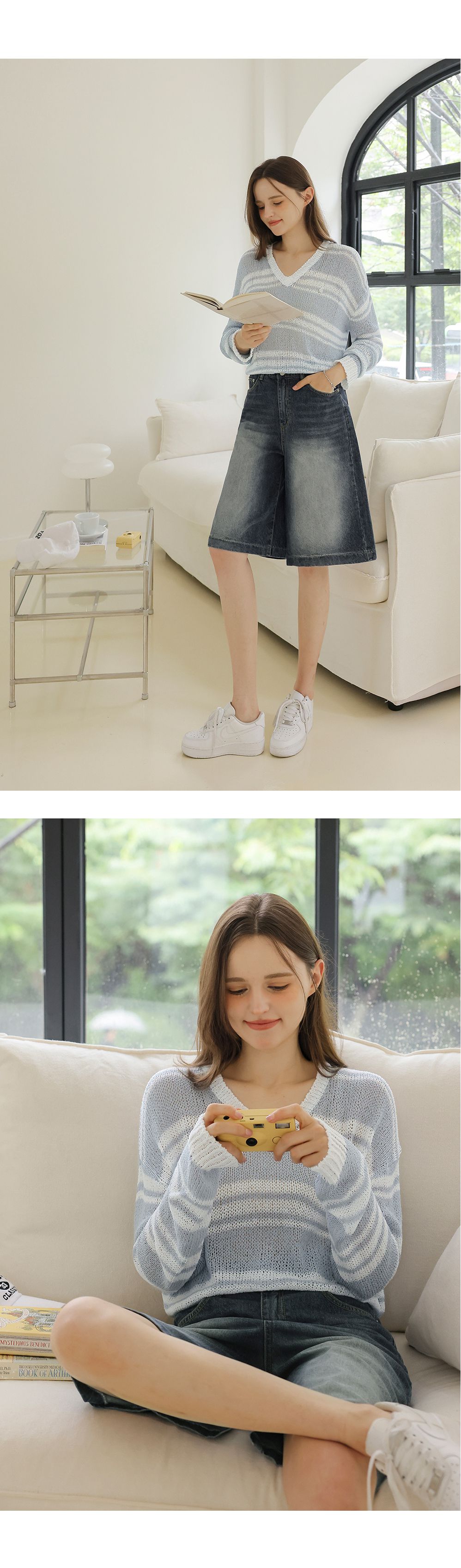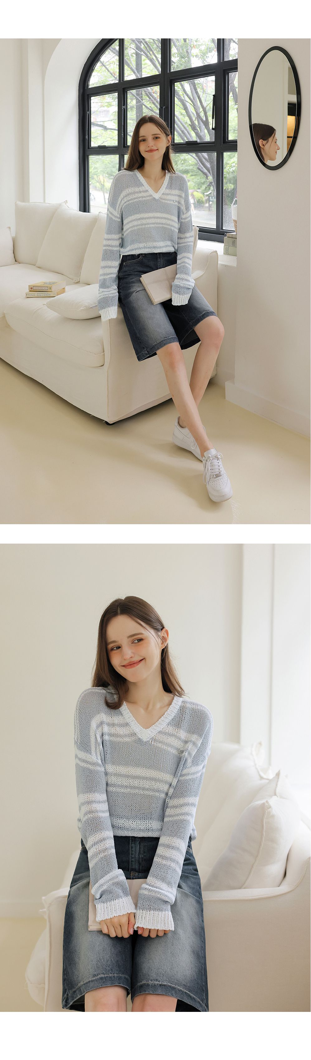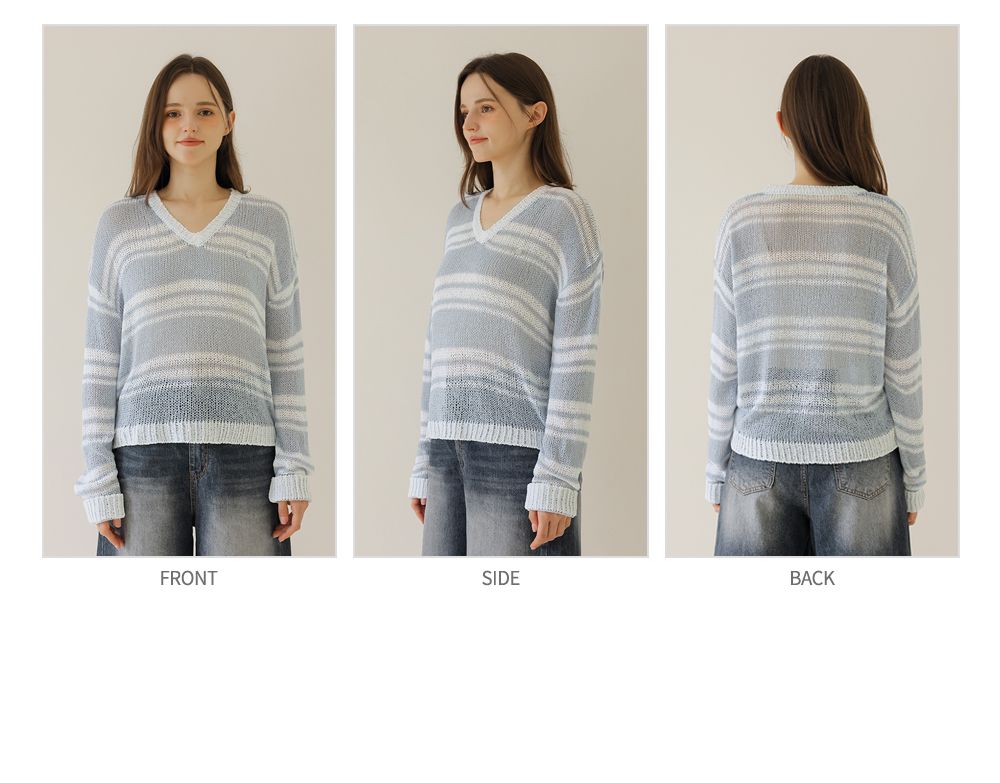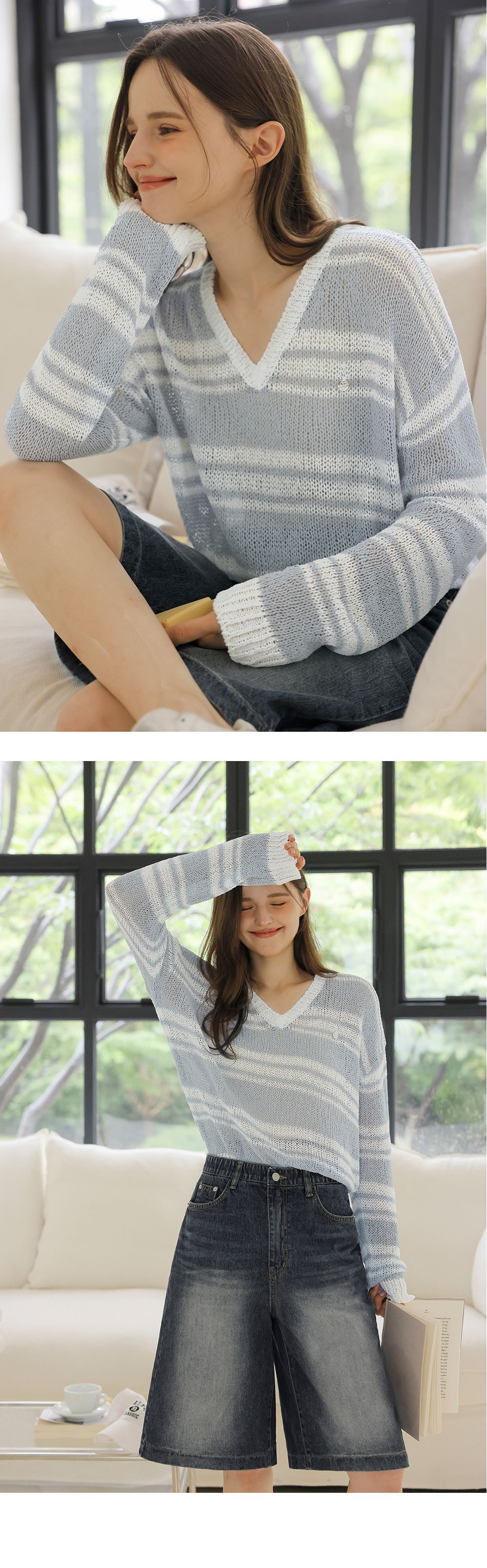 【C55148】韓國MID 條紋洞洞針織衫-V領金屬吊牌慵懶落肩長袖上衣
