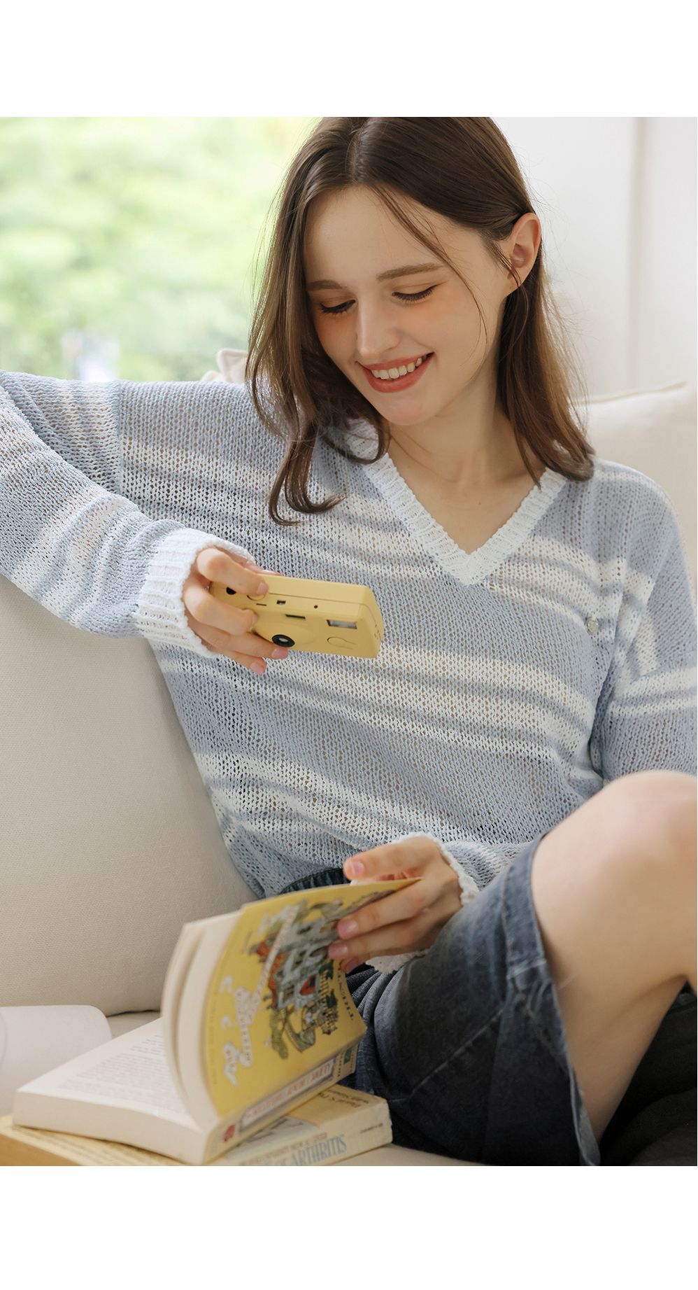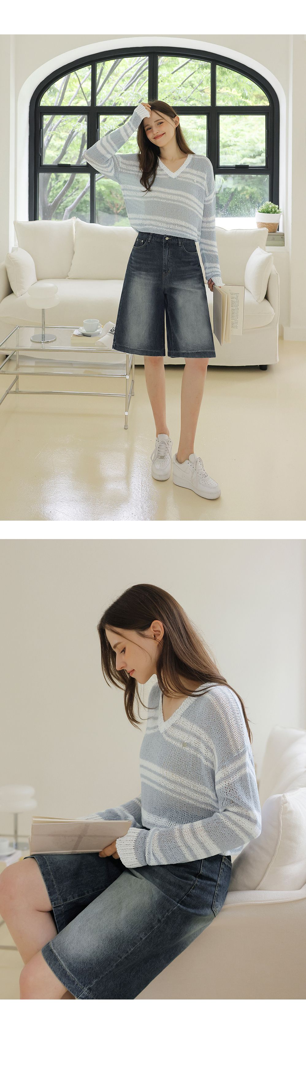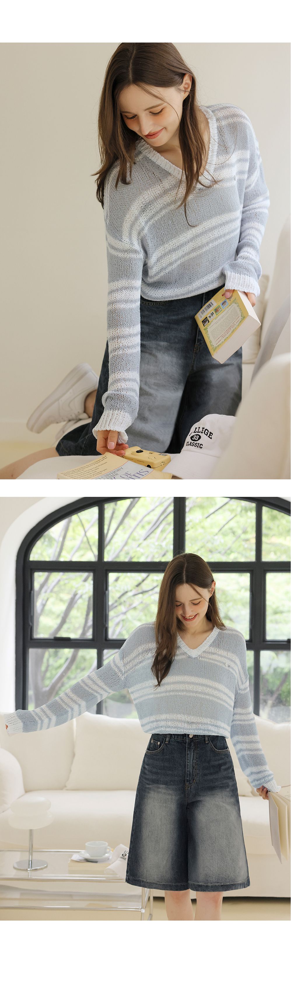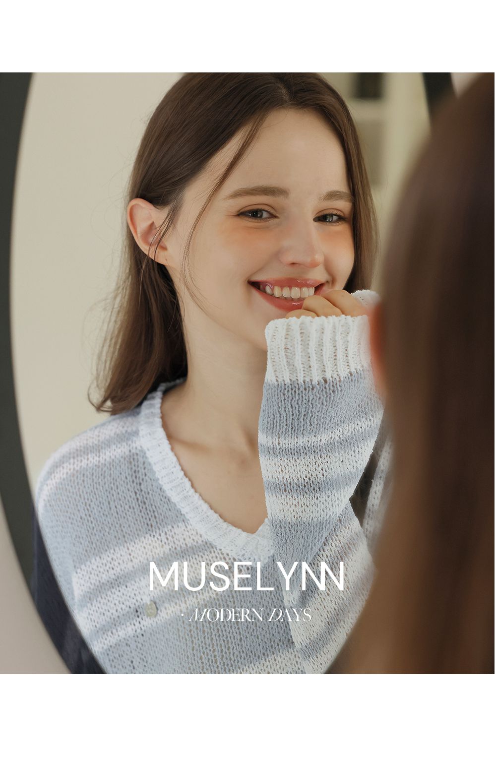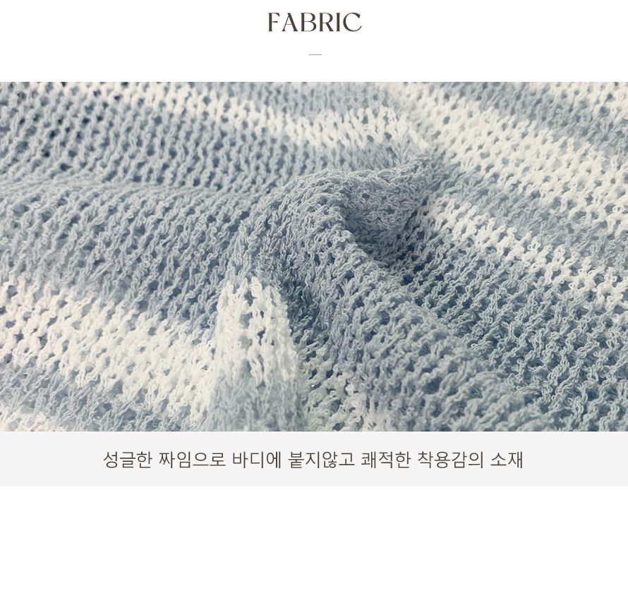 【C55148】韓國MID 條紋洞洞針織衫-V領金屬吊牌慵懶落肩長袖上衣