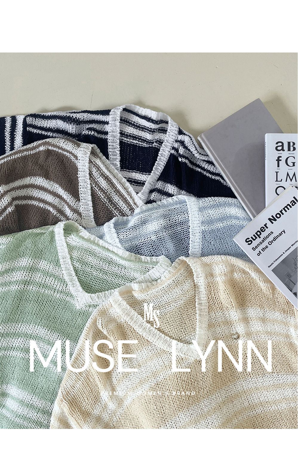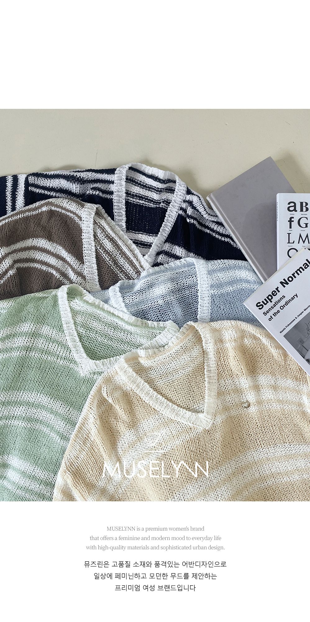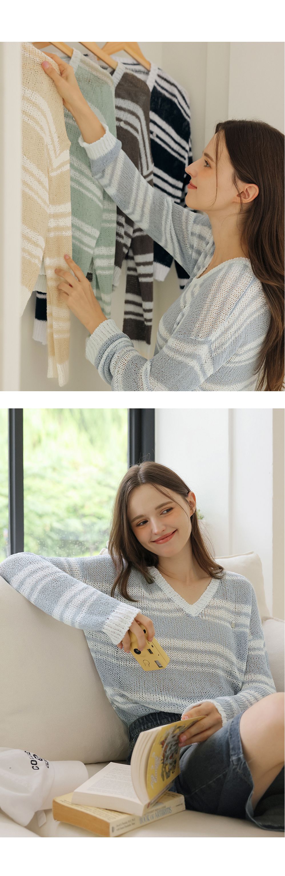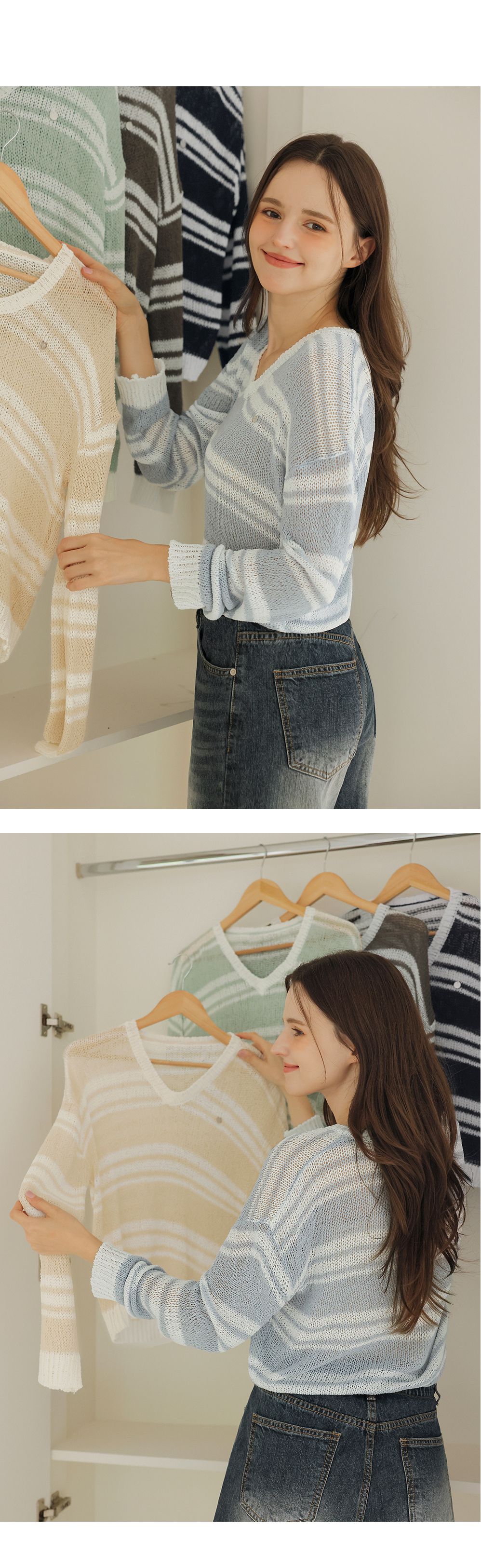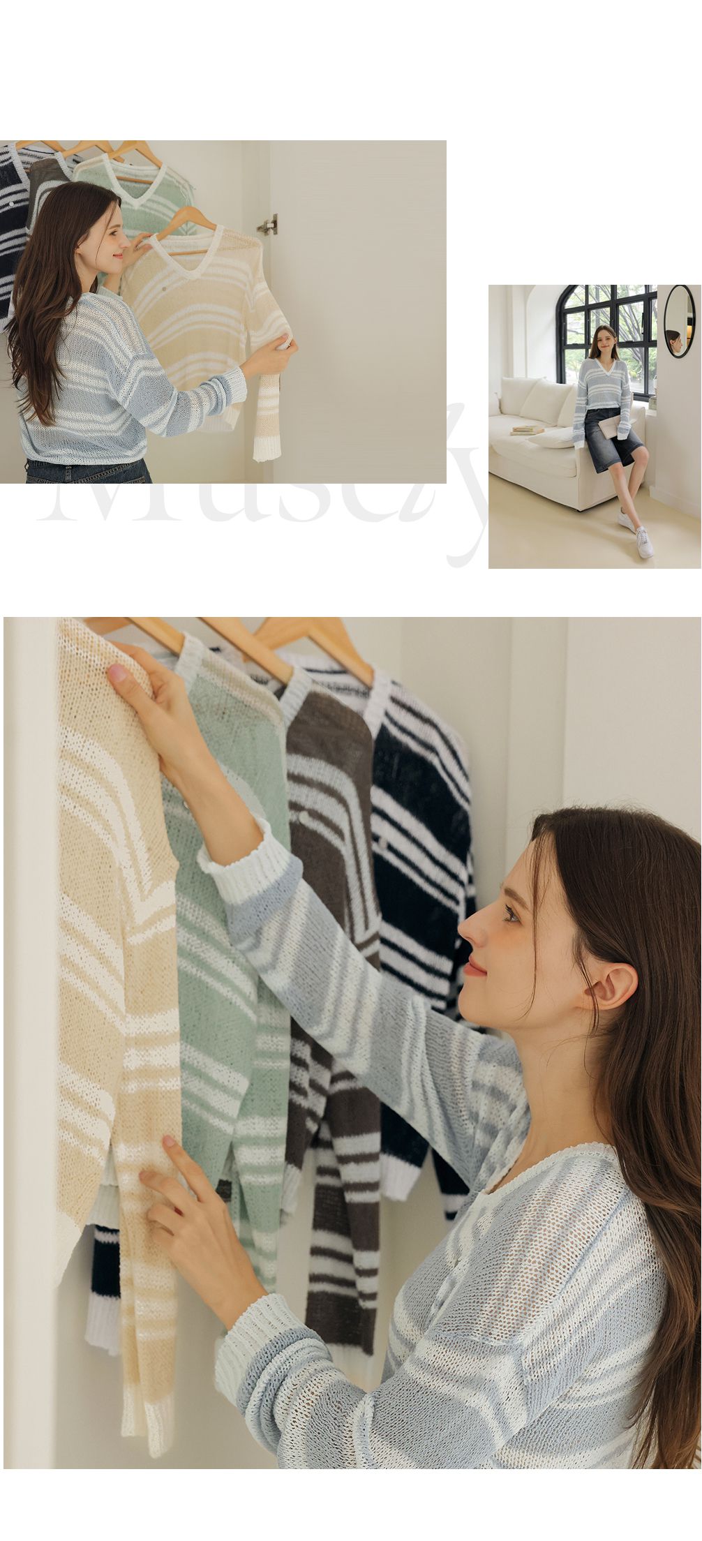 鉤針編織/洞洞裝/深V領/橫條紋/落肩/金屬LOGO吊牌 - 休閒居家渡假條紋上衣條紋針織衫針織上衣條紋洞洞針織衫金屬吊牌慵懶落肩長袖上衣天藍色米色薄荷色棕色深藍色