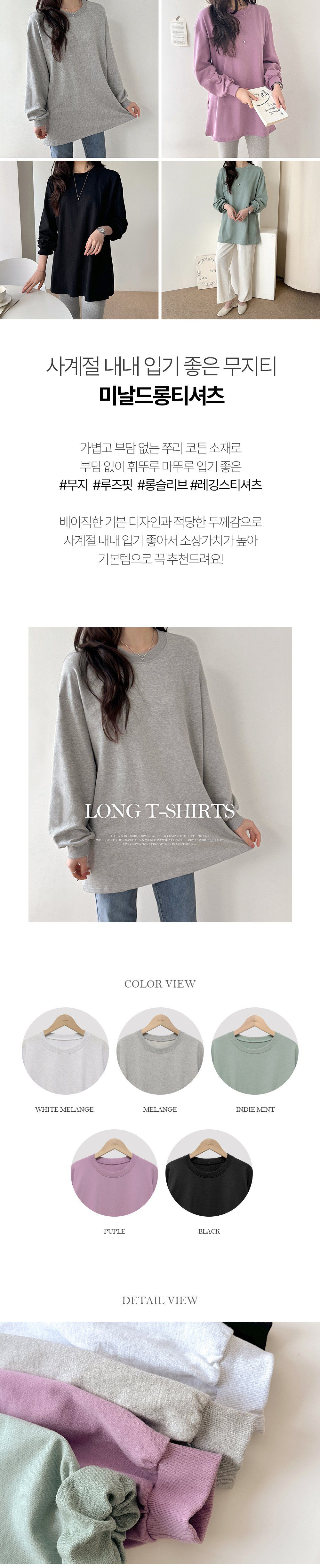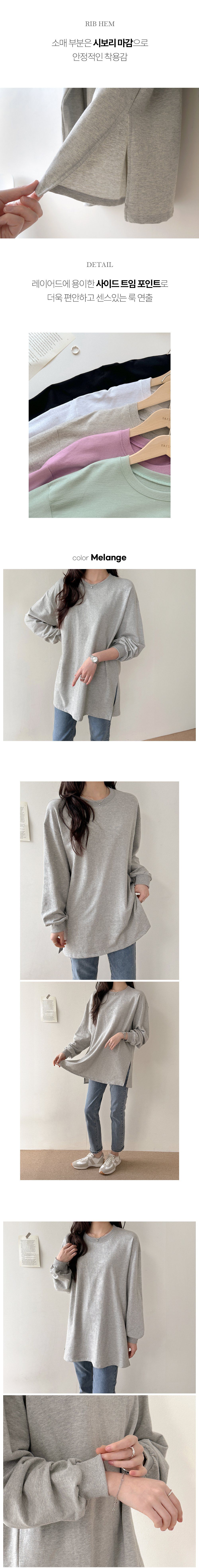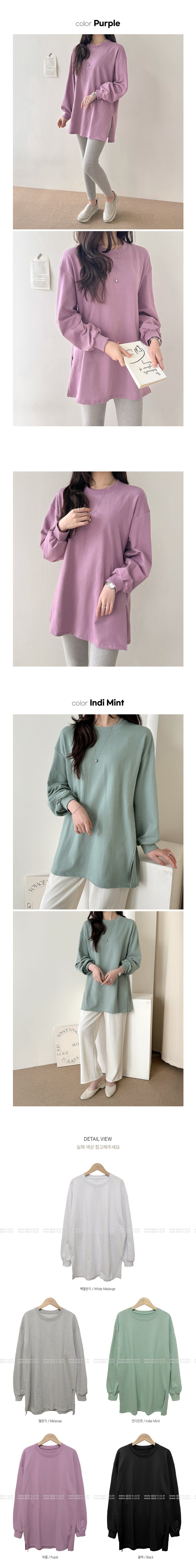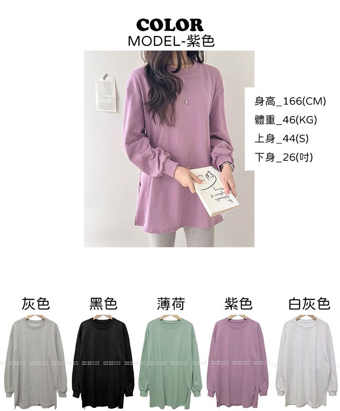 圓領/側開衩/落肩長袖/束口袖/羅紋滾邊 - 休閒居家簡約百搭素面長版大學T長袖上衣灰色黑色薄荷色紫色白灰色