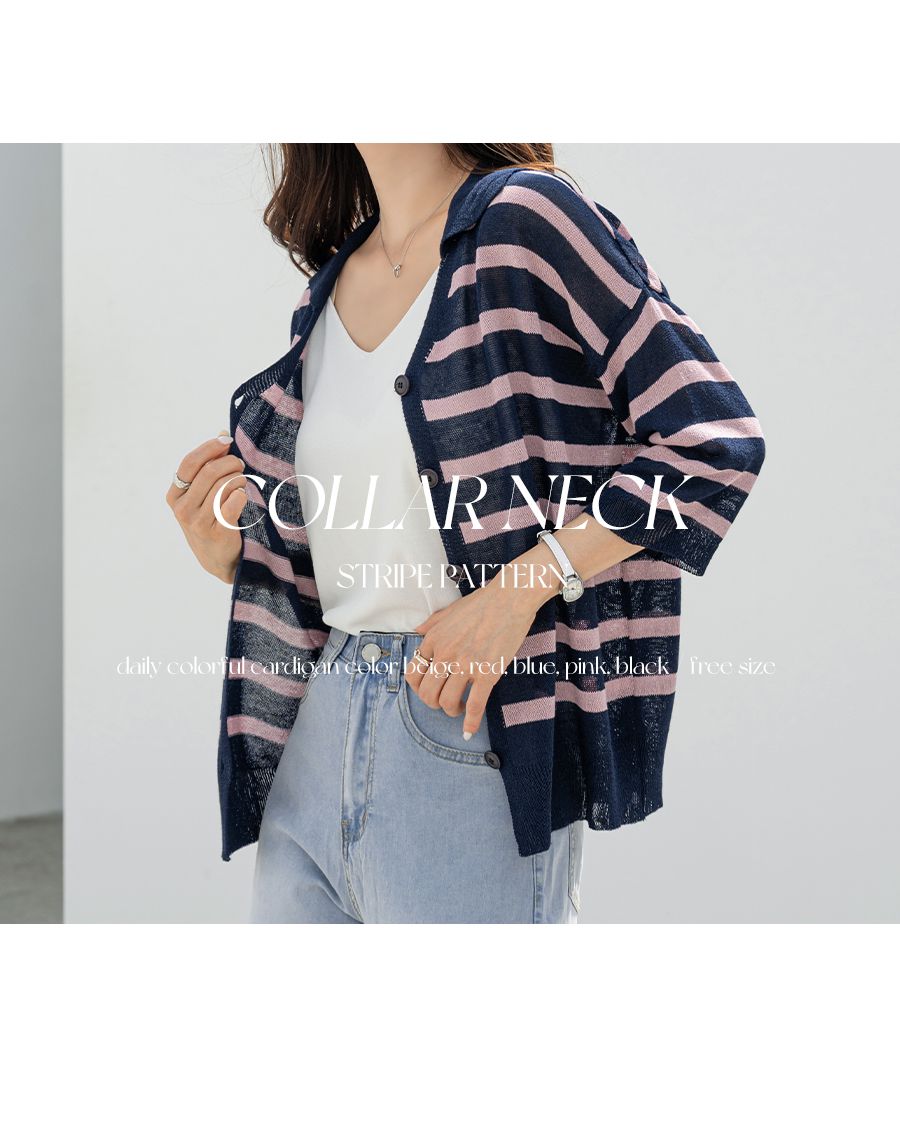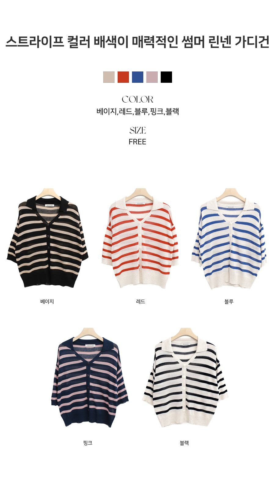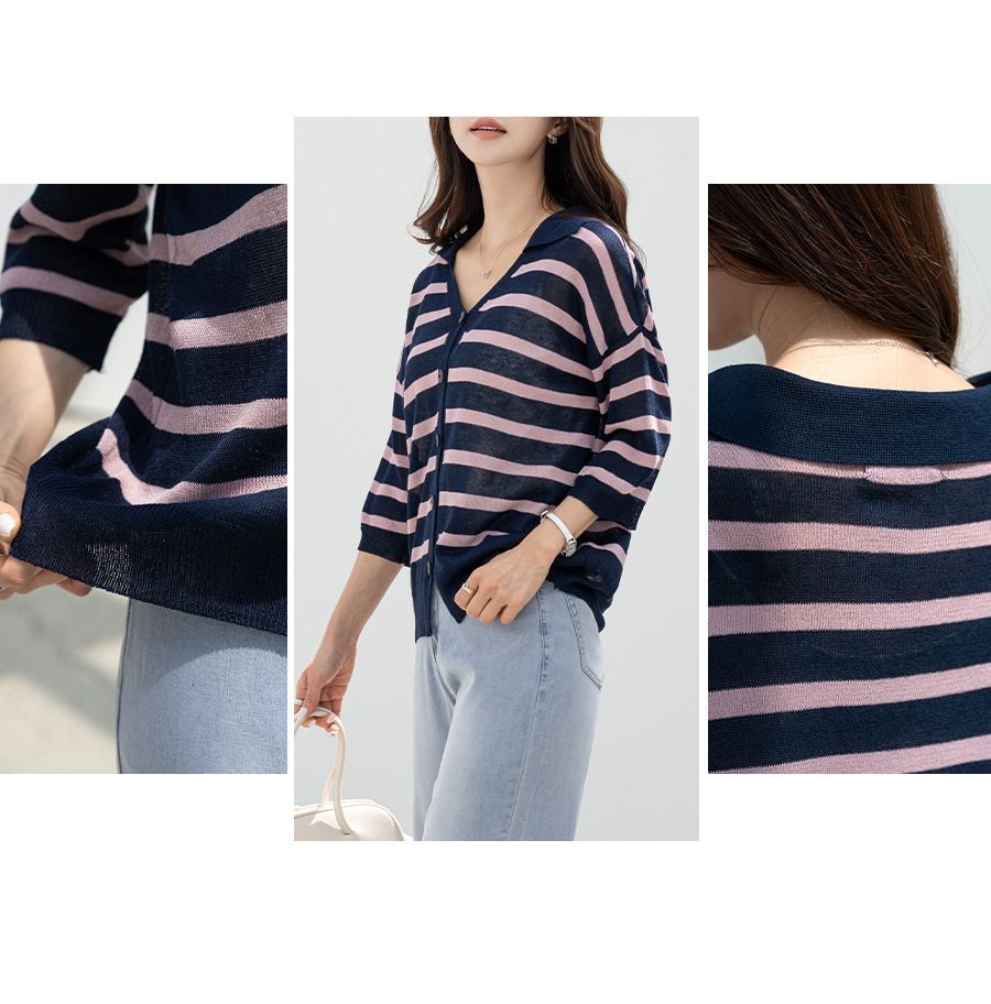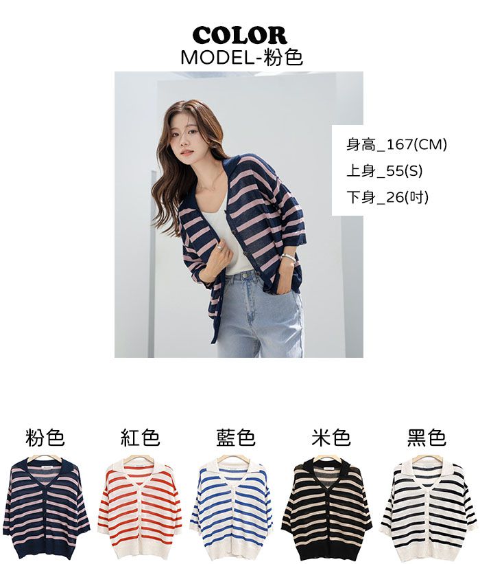 翻領/V領/輕薄混亞麻/開襟排釦 - 休閒居家渡假配色條紋外套條紋針織衫條紋針織外套開襟衫七分袖外套針織衫針織上衣粉色紅色藍色米色黑色