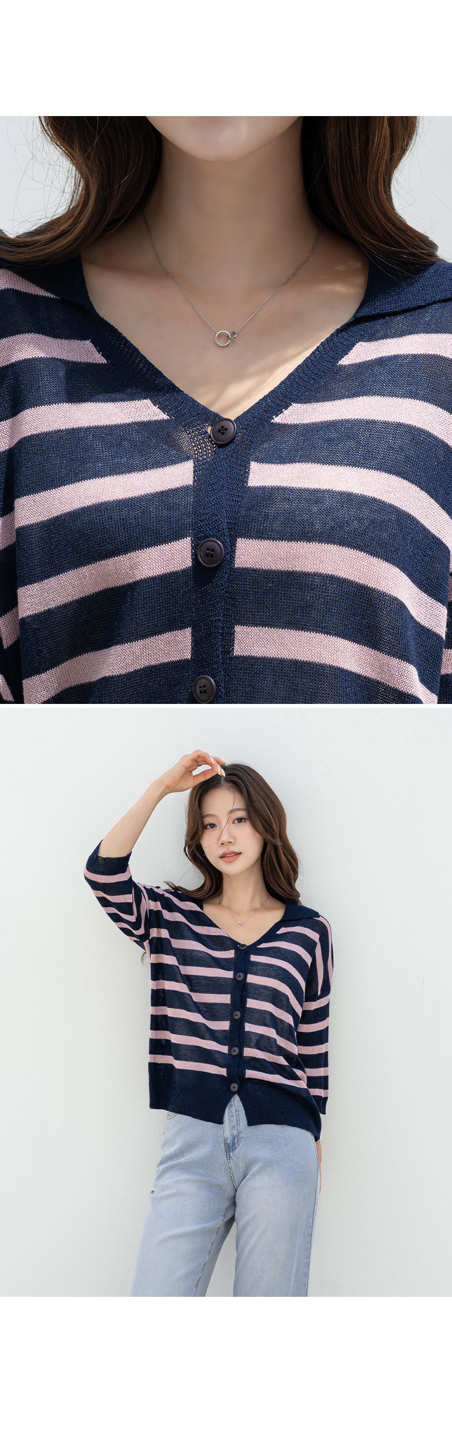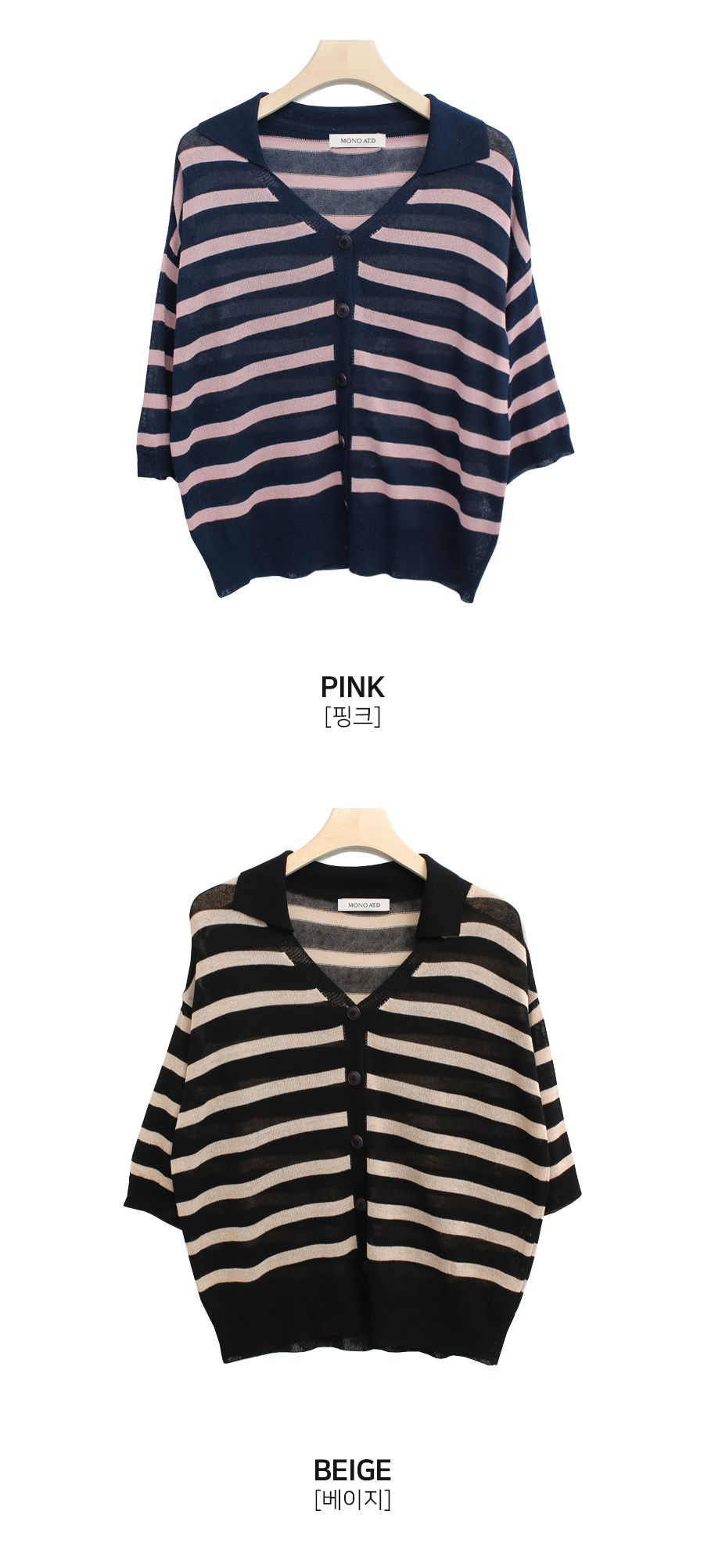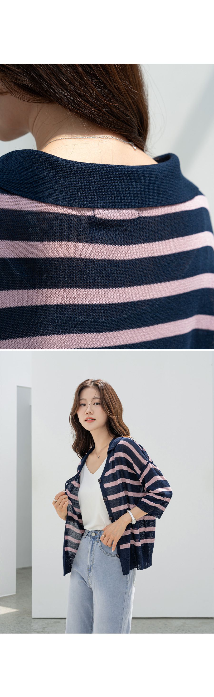 翻領/V領/輕薄混亞麻/開襟排釦 - 休閒居家渡假配色條紋外套條紋針織衫條紋針織外套開襟衫七分袖外套針織衫針織上衣粉色紅色藍色米色黑色