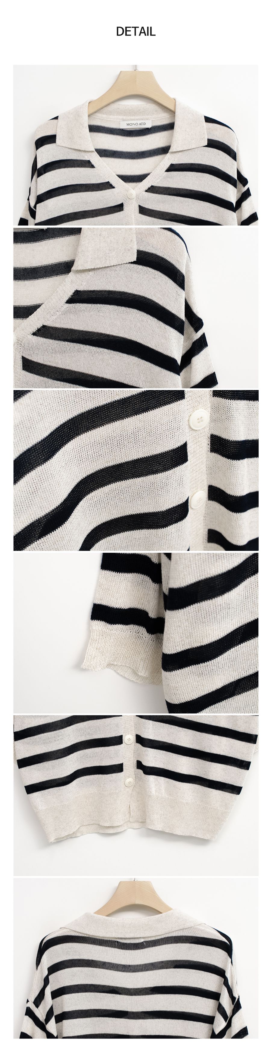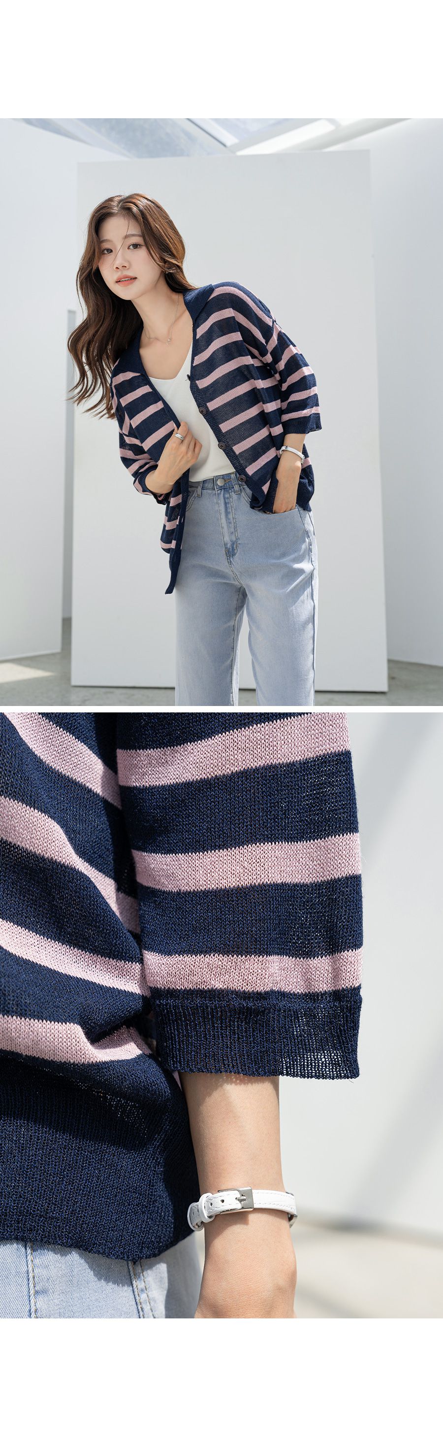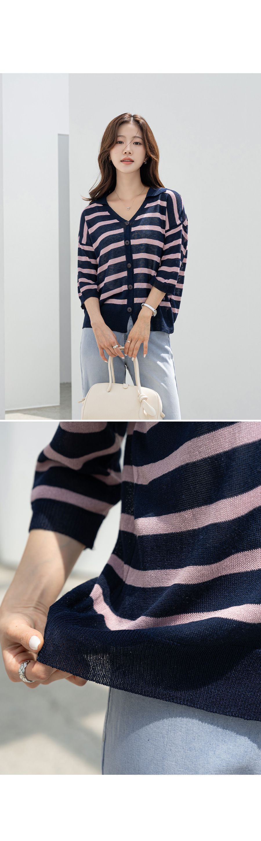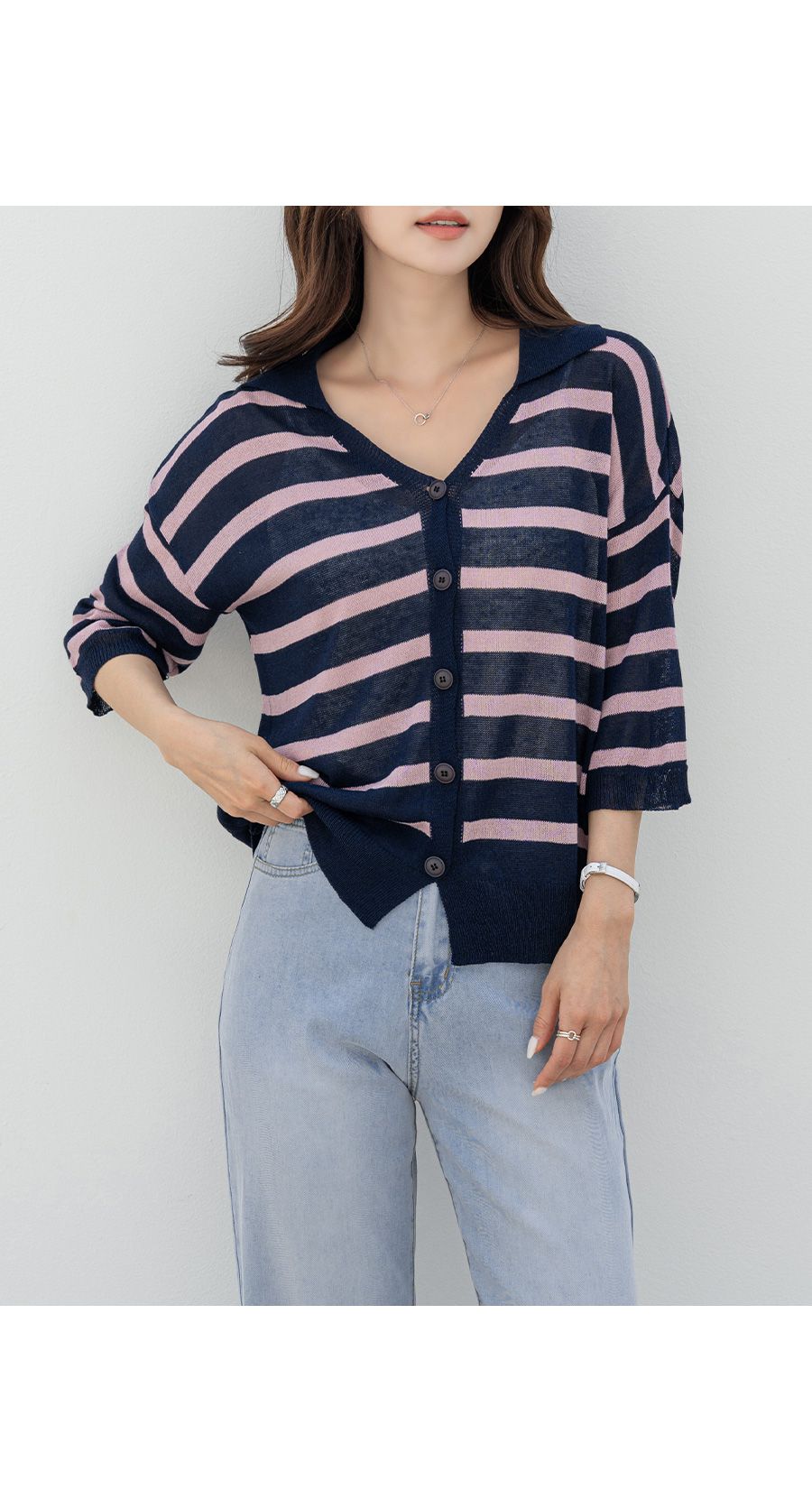【C55165】韓國MNA 條紋針織外套-輕薄混亞麻V領七分袖排釦針織上衣★★