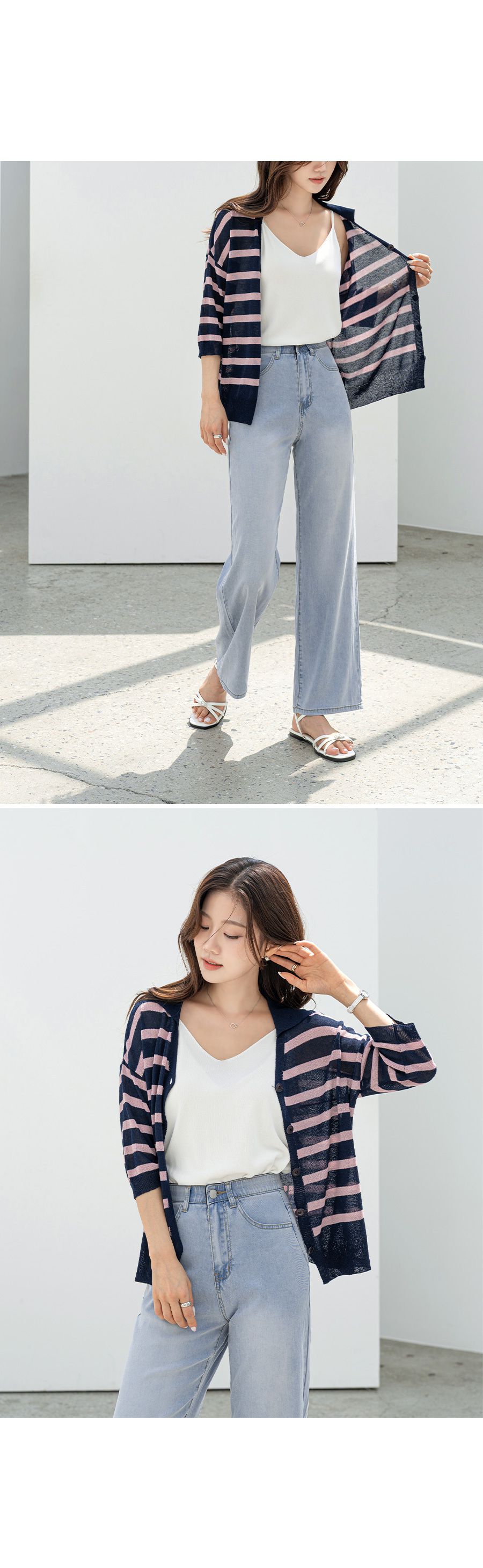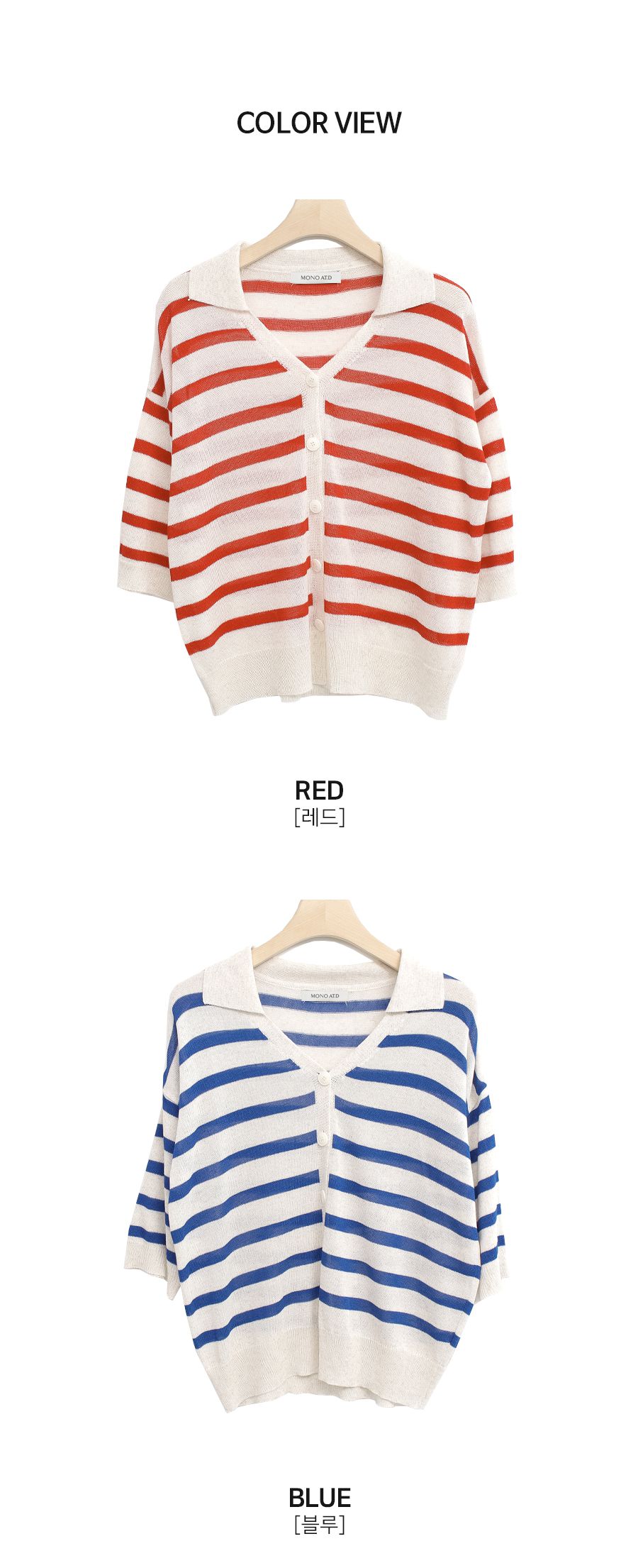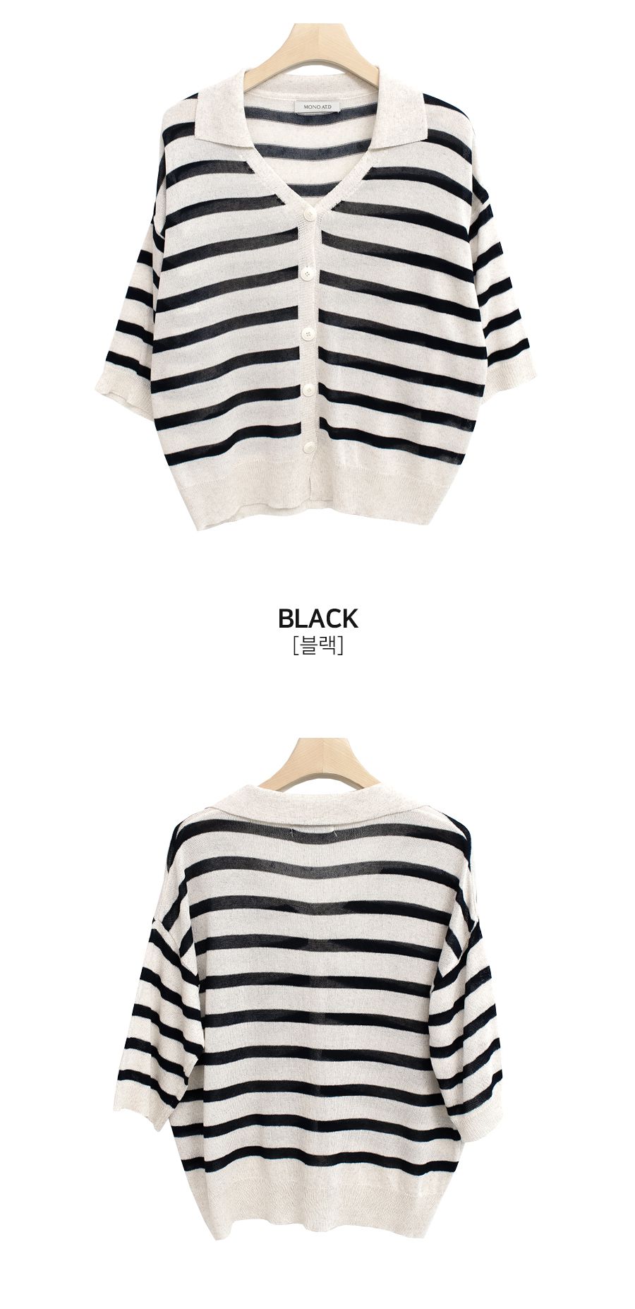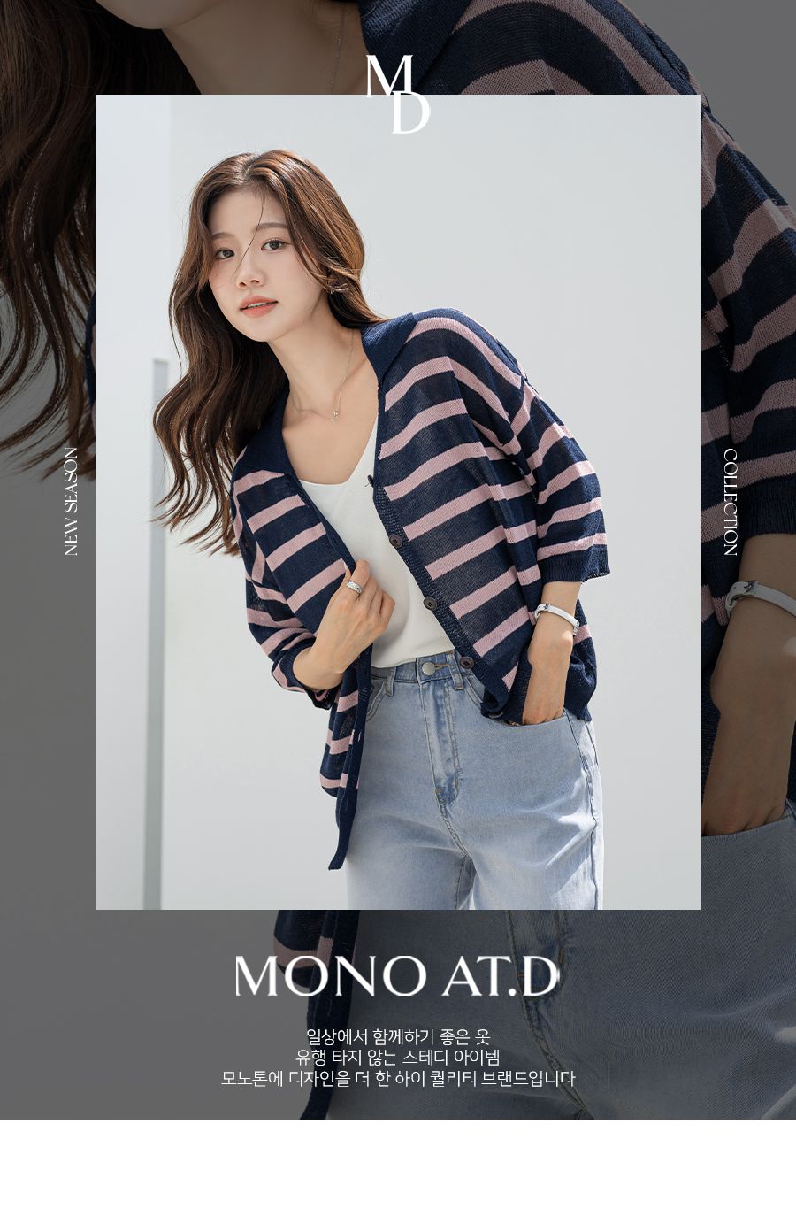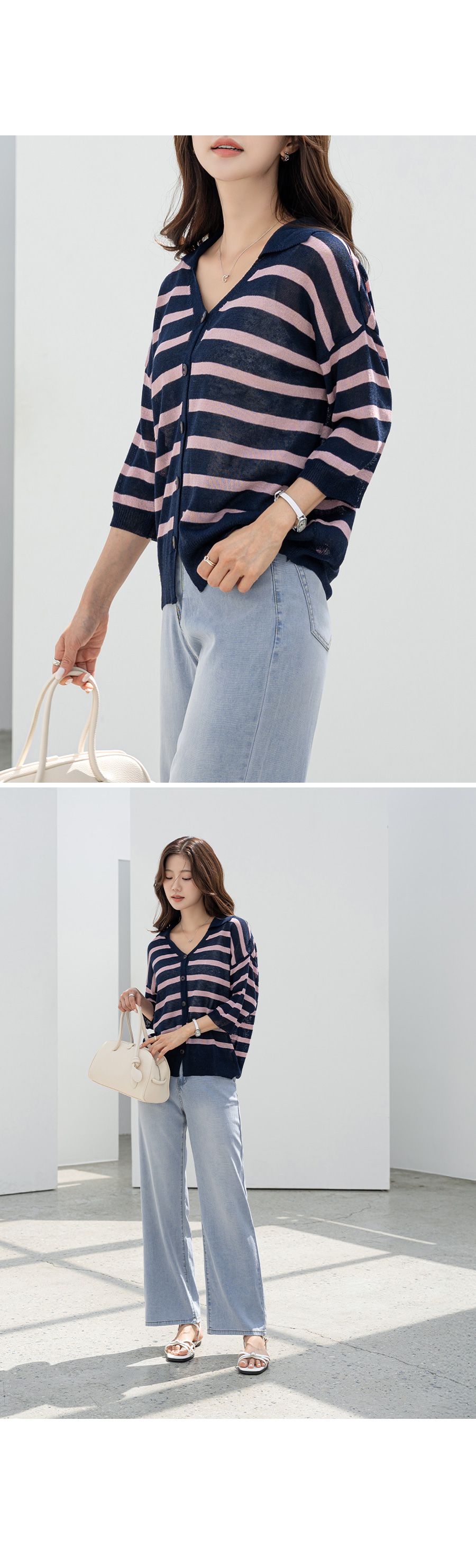 【C55165】韓國MNA 條紋針織外套-輕薄混亞麻V領七分袖排釦針織上衣★★