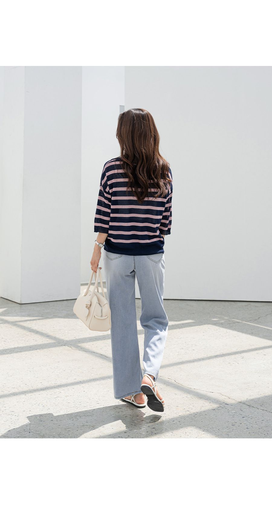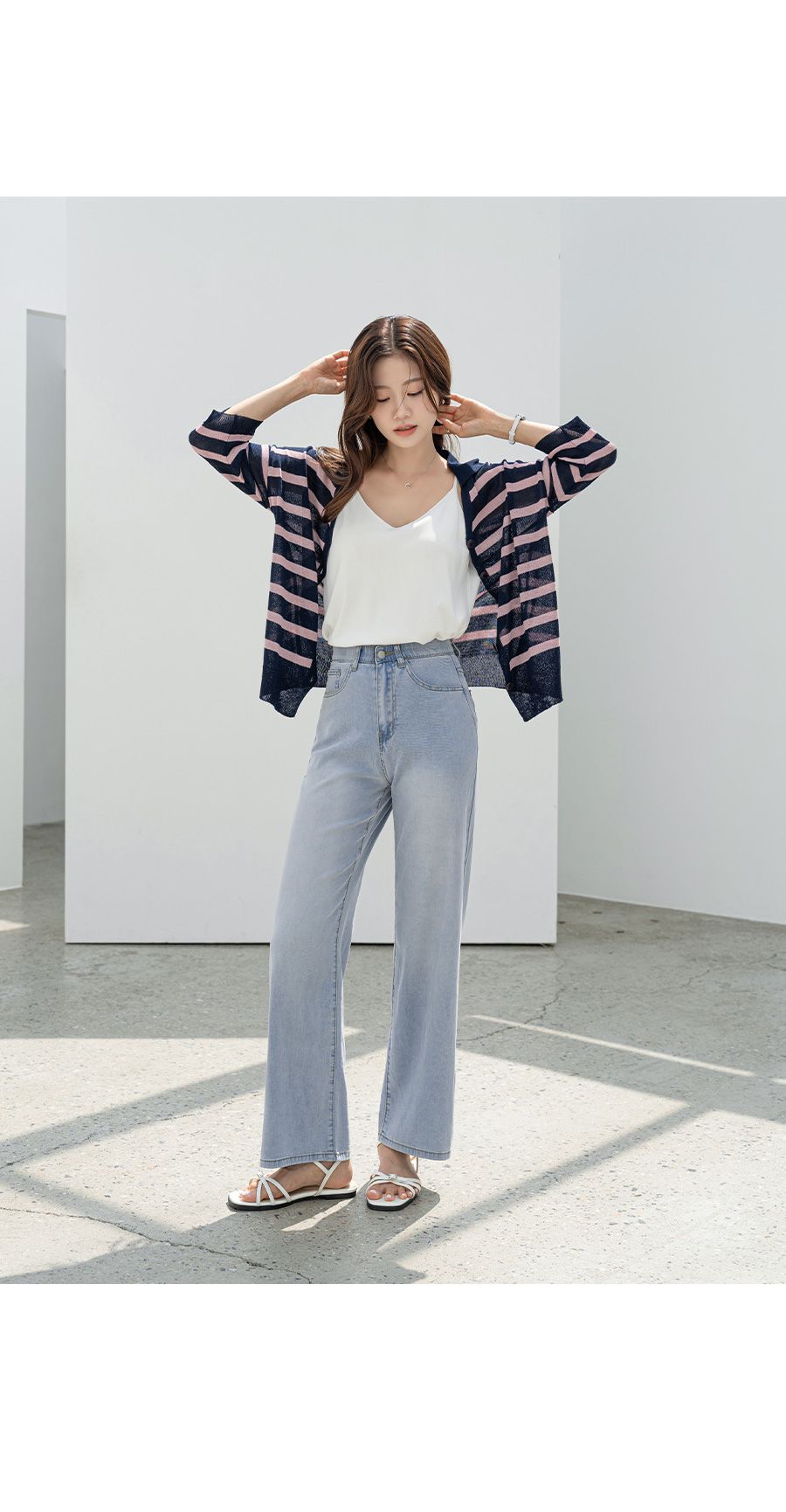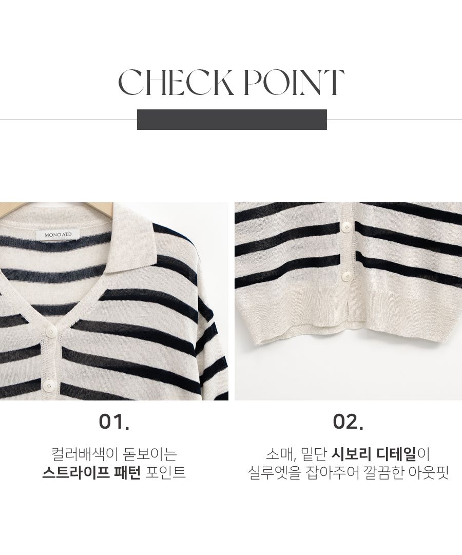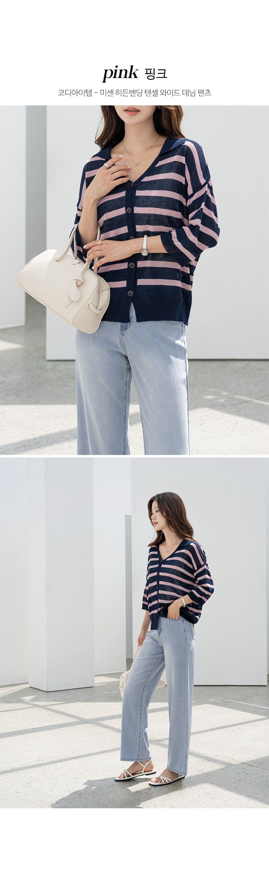 【C55165】韓國MNA 條紋針織外套-輕薄混亞麻V領七分袖排釦針織上衣★★