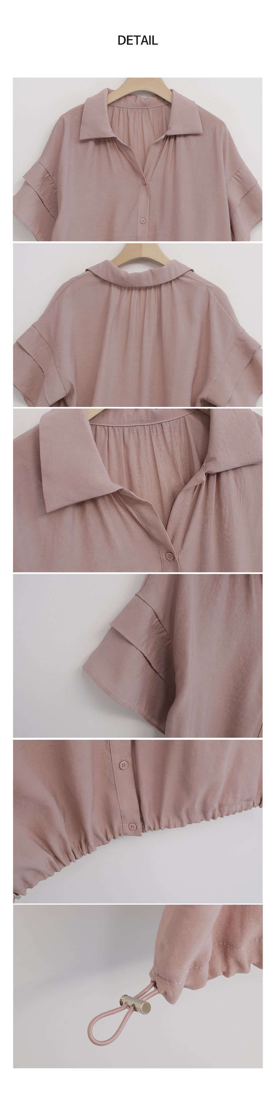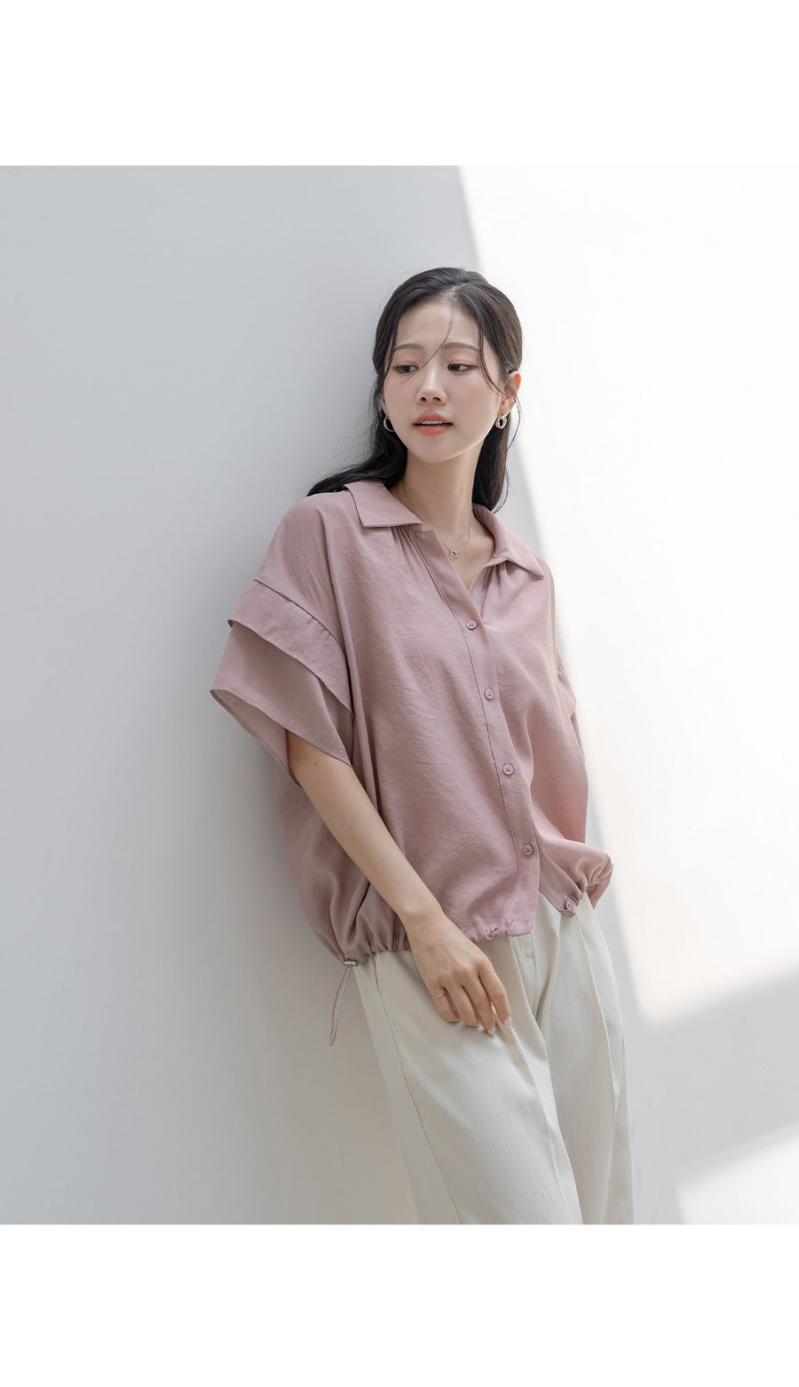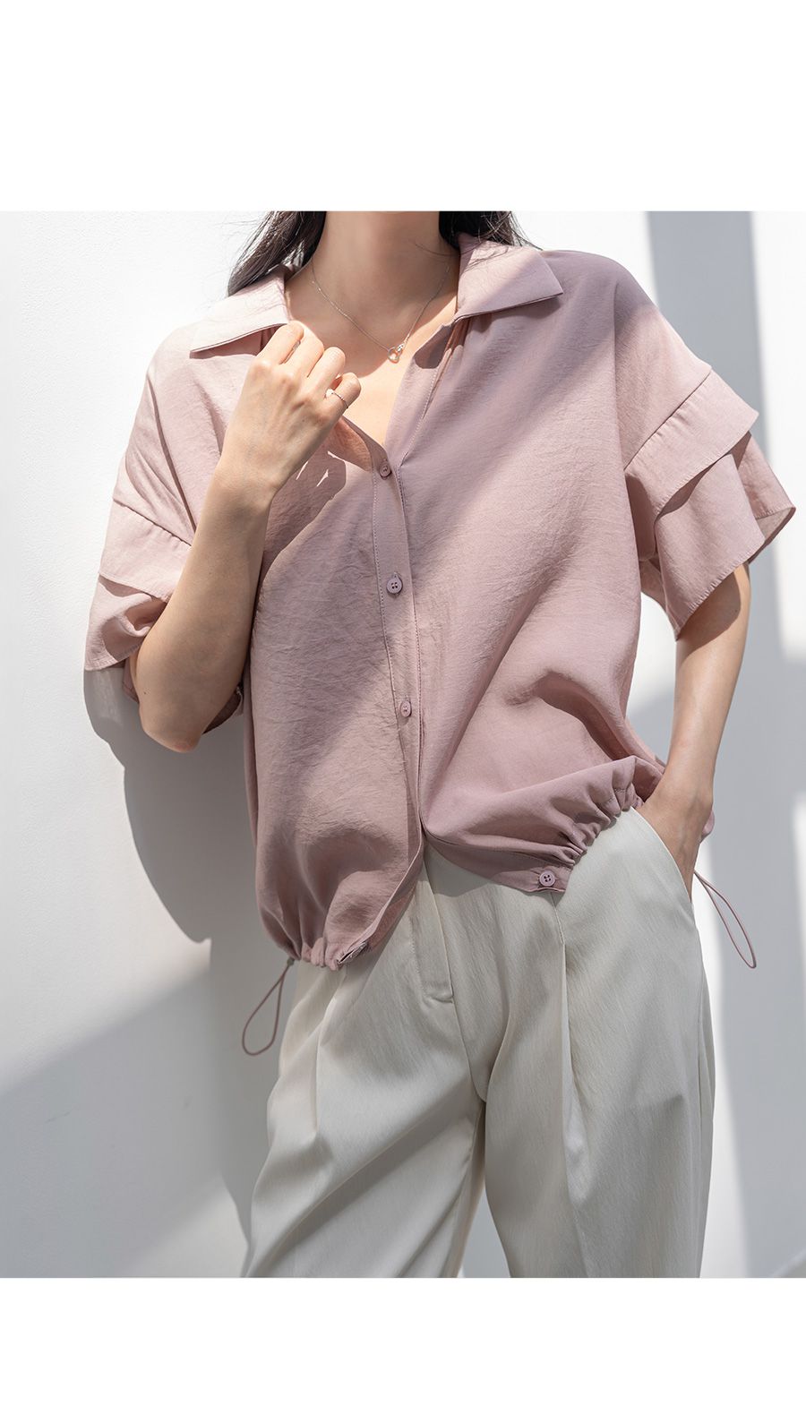 抽繩收腰/開襟排釦/雙層滾邊袖口/落肩寬袖/好氣色 - 休閒居家簡約百搭素面雙層寬袖襯衫上衣五分袖上衣粉色深灰色