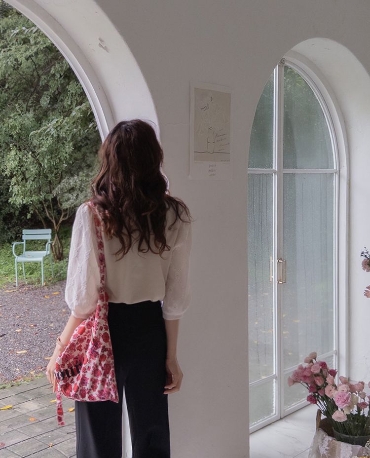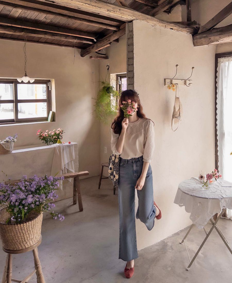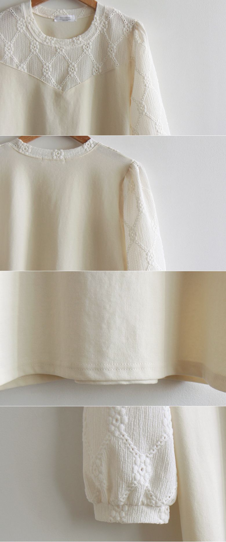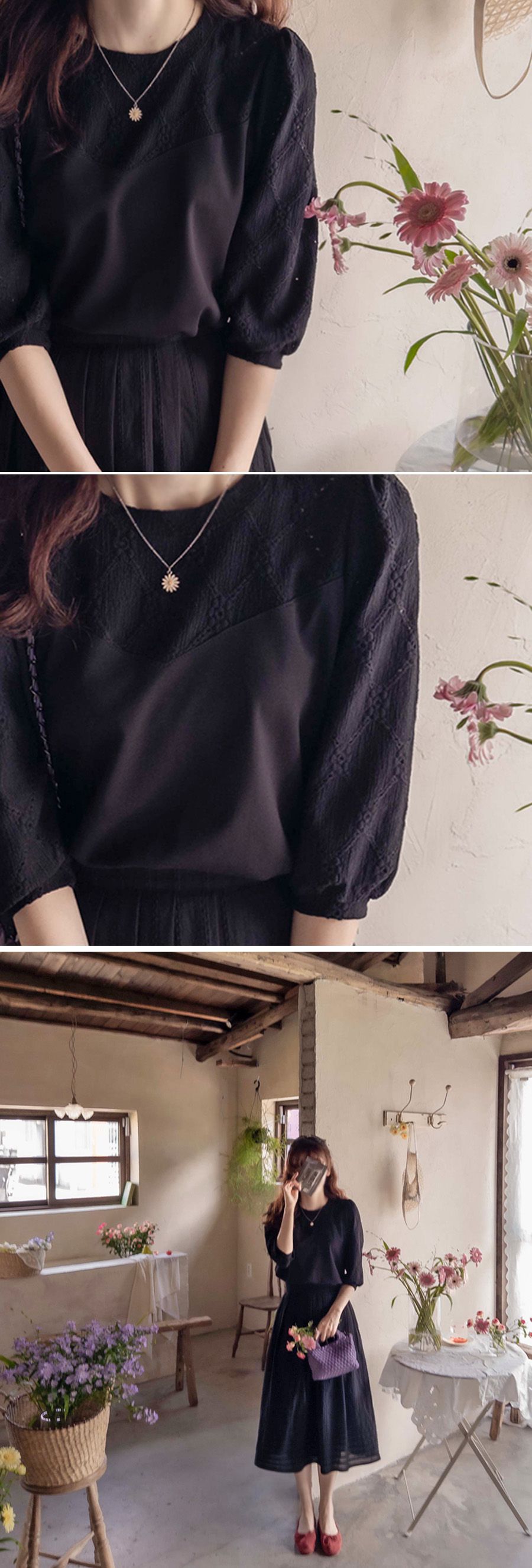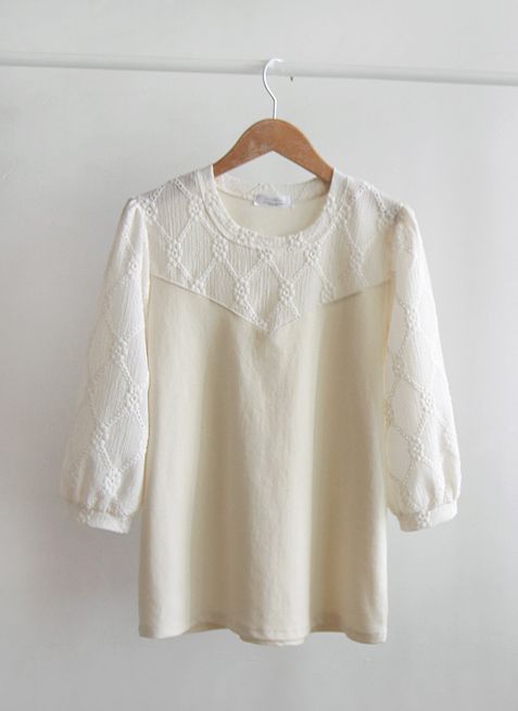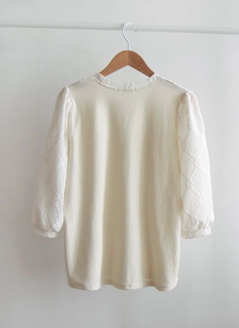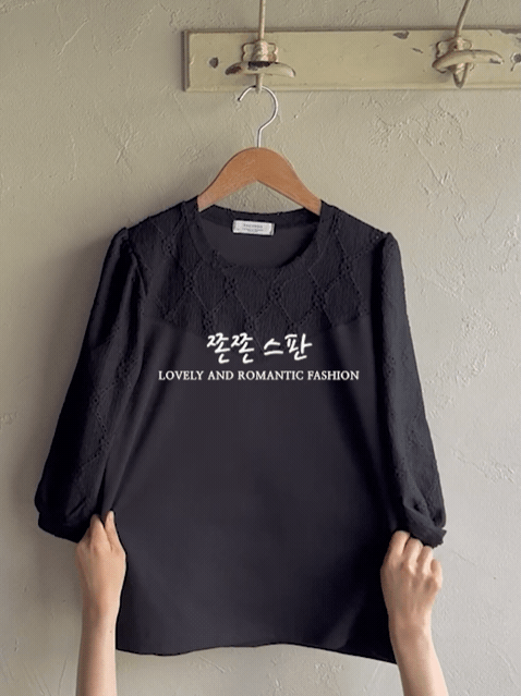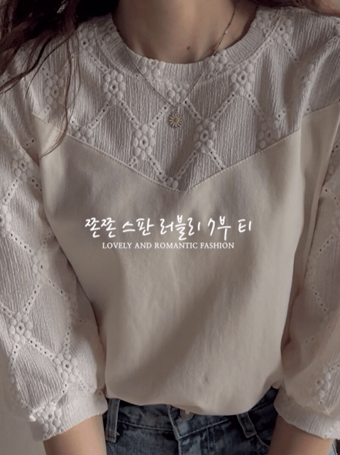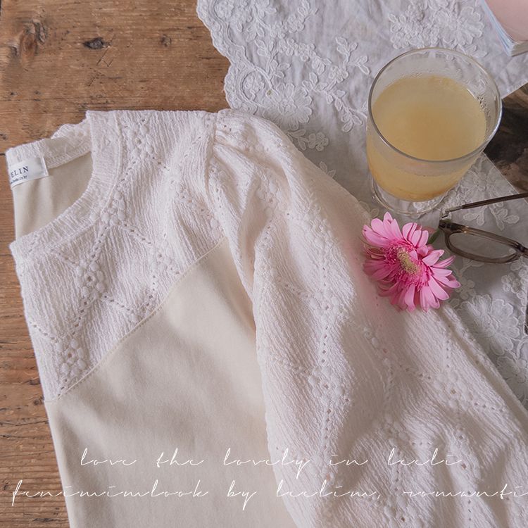 【C55192】韓國LEE 蕾絲拼接T恤-3D花朵刺繡素面圓領七分袖上衣★★