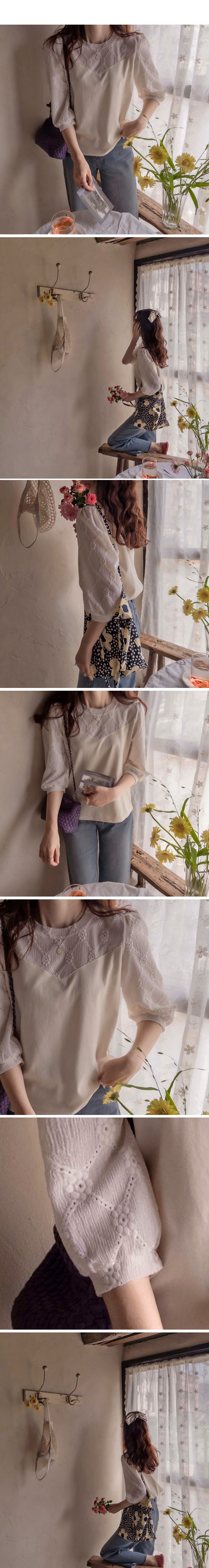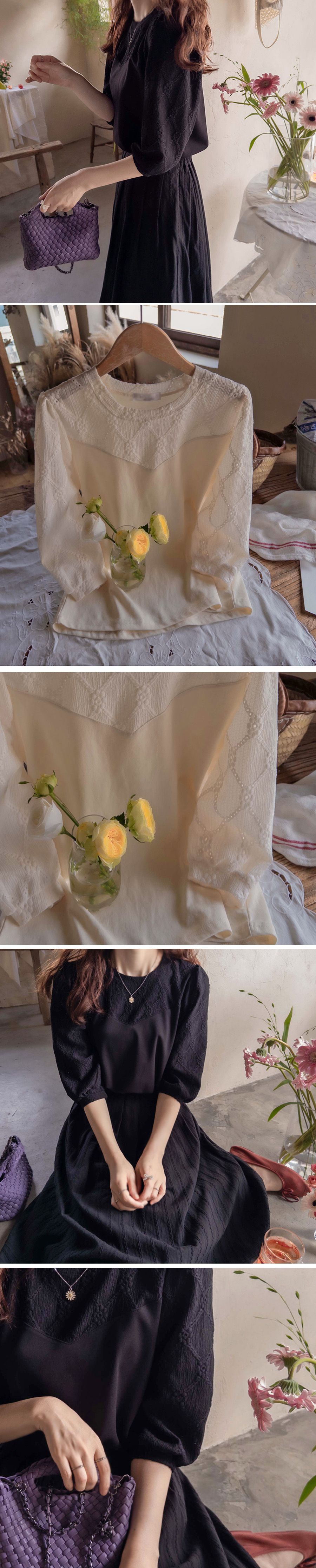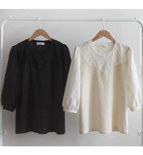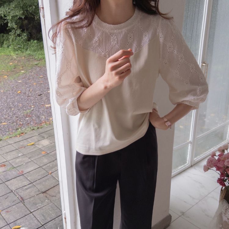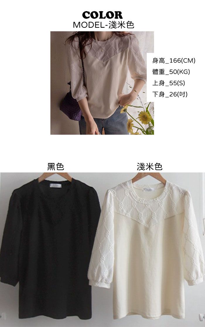 雙材質拼接/3D花朵刺繡/圓領 - 休閒居家婚禮OL上班族簡約百搭素面蕾絲拼接T恤七分袖上衣淺米色黑色