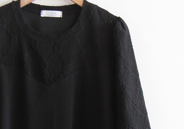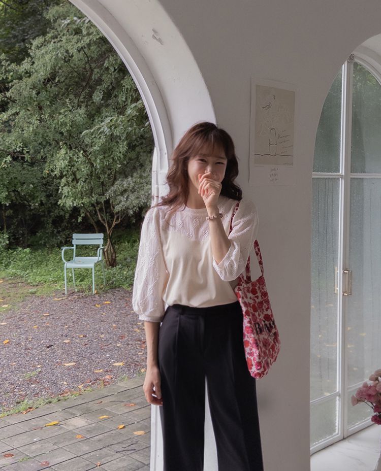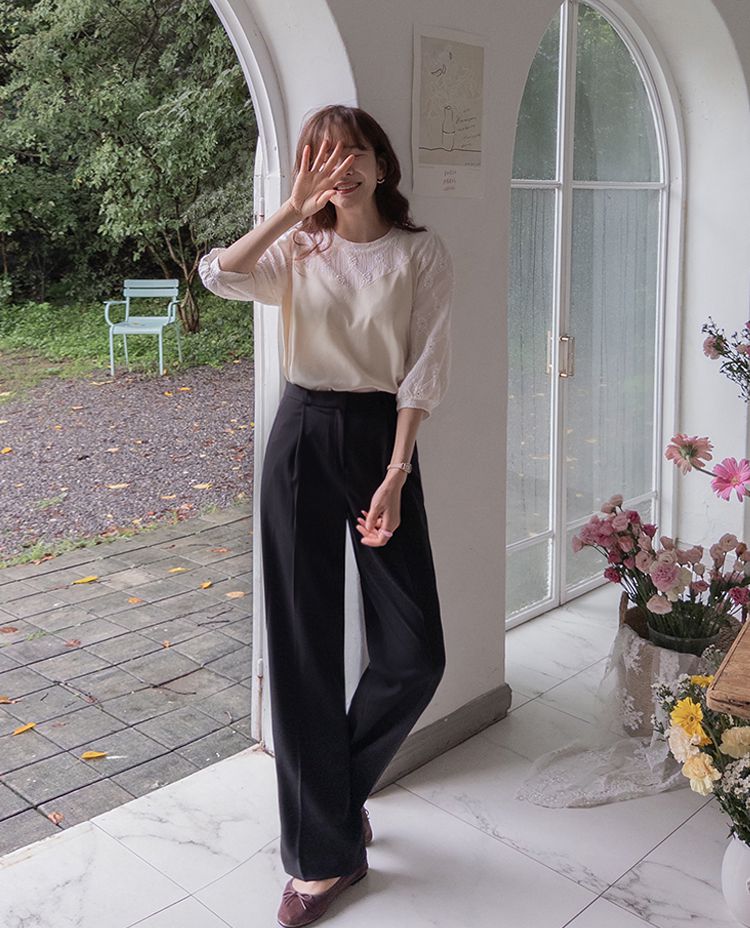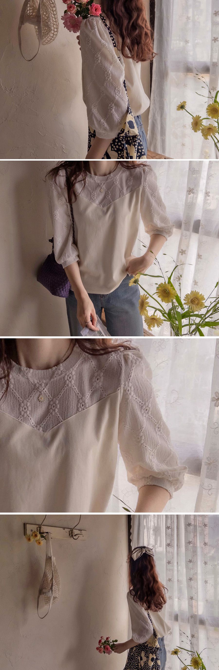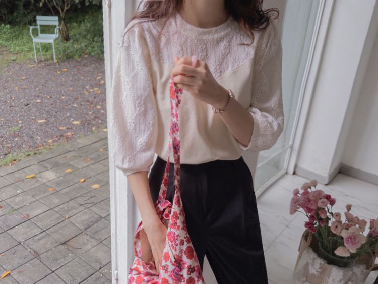 雙材質拼接/3D花朵刺繡/圓領 - 休閒居家婚禮OL上班族簡約百搭素面蕾絲拼接T恤七分袖上衣淺米色黑色