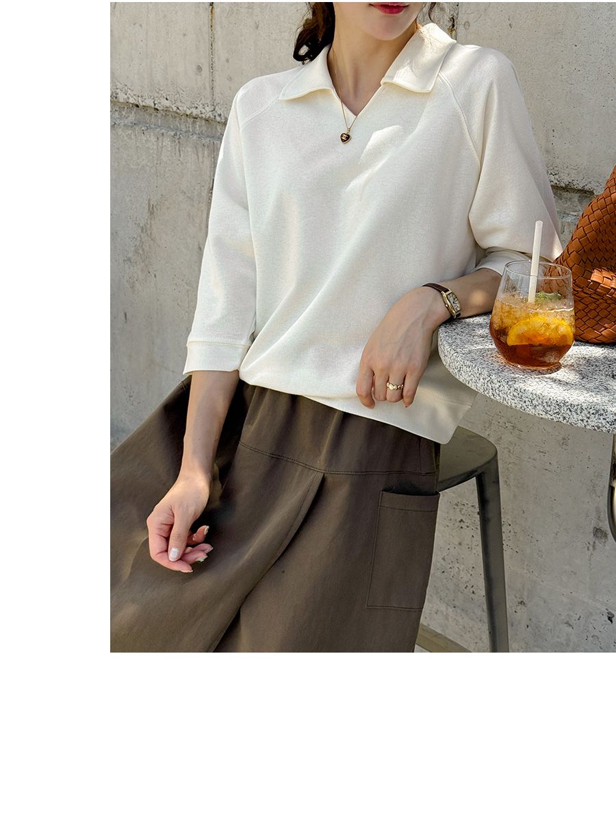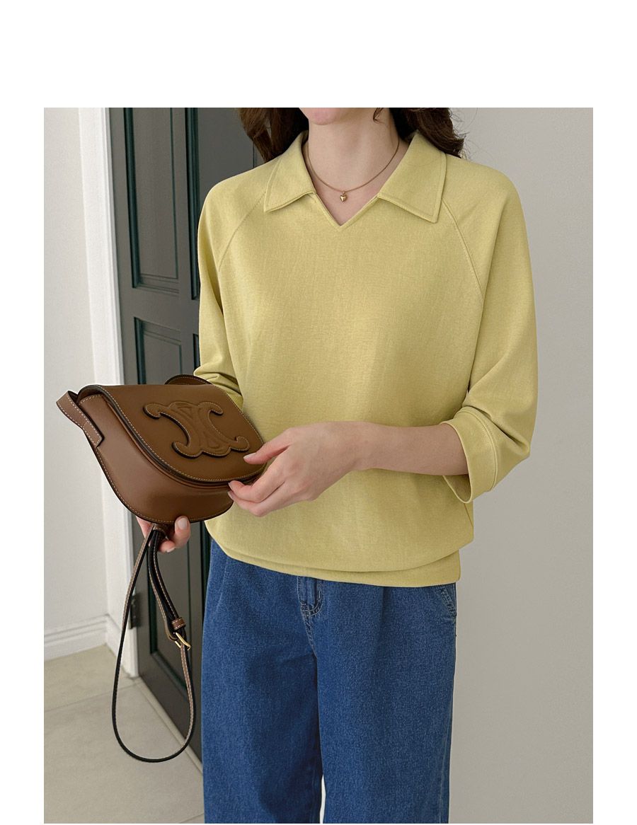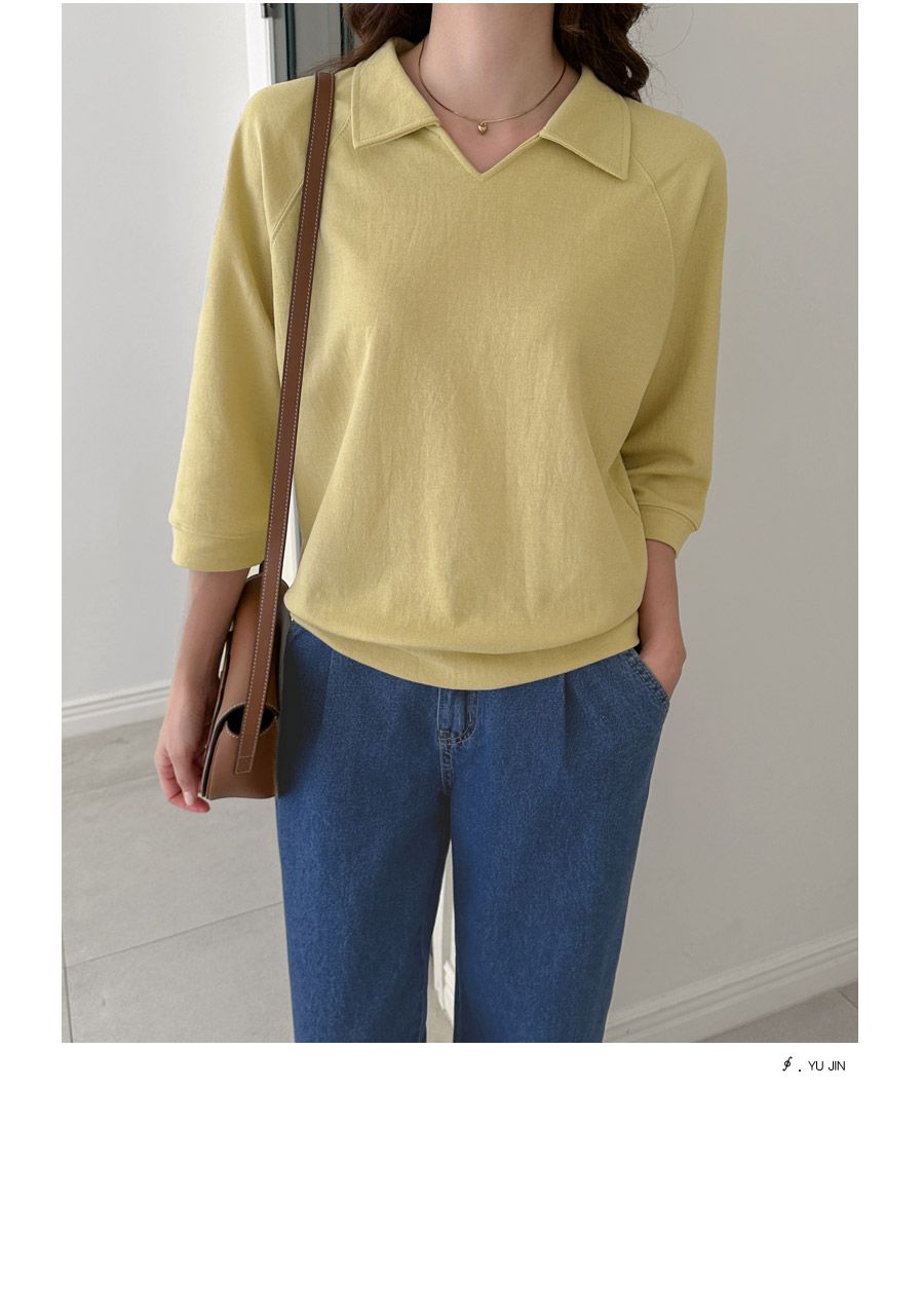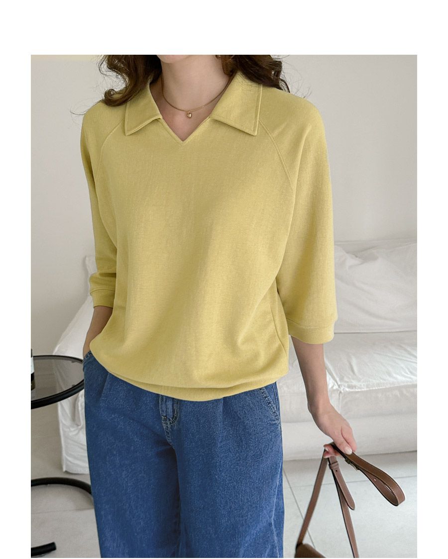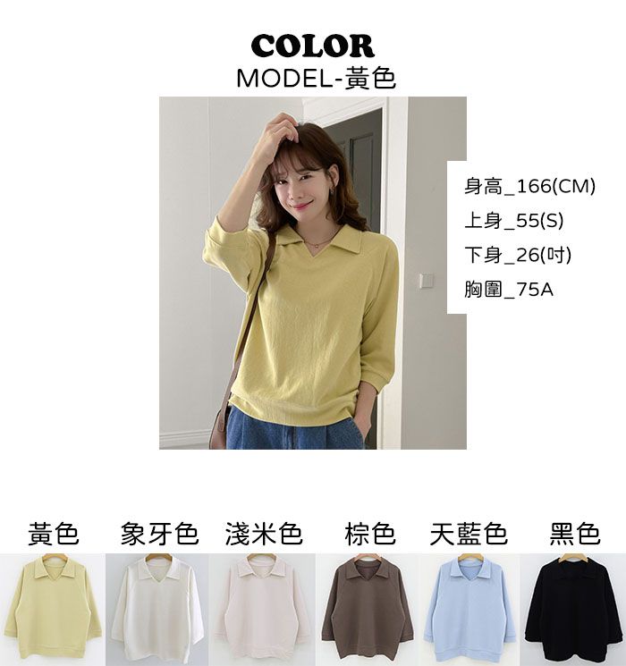 好氣色/連肩袖/V領/直筒版型 - 休閒居家簡約百搭素面翻領素面上衣七分袖上衣T恤黃色象牙色淺米色宗色天藍色黑色