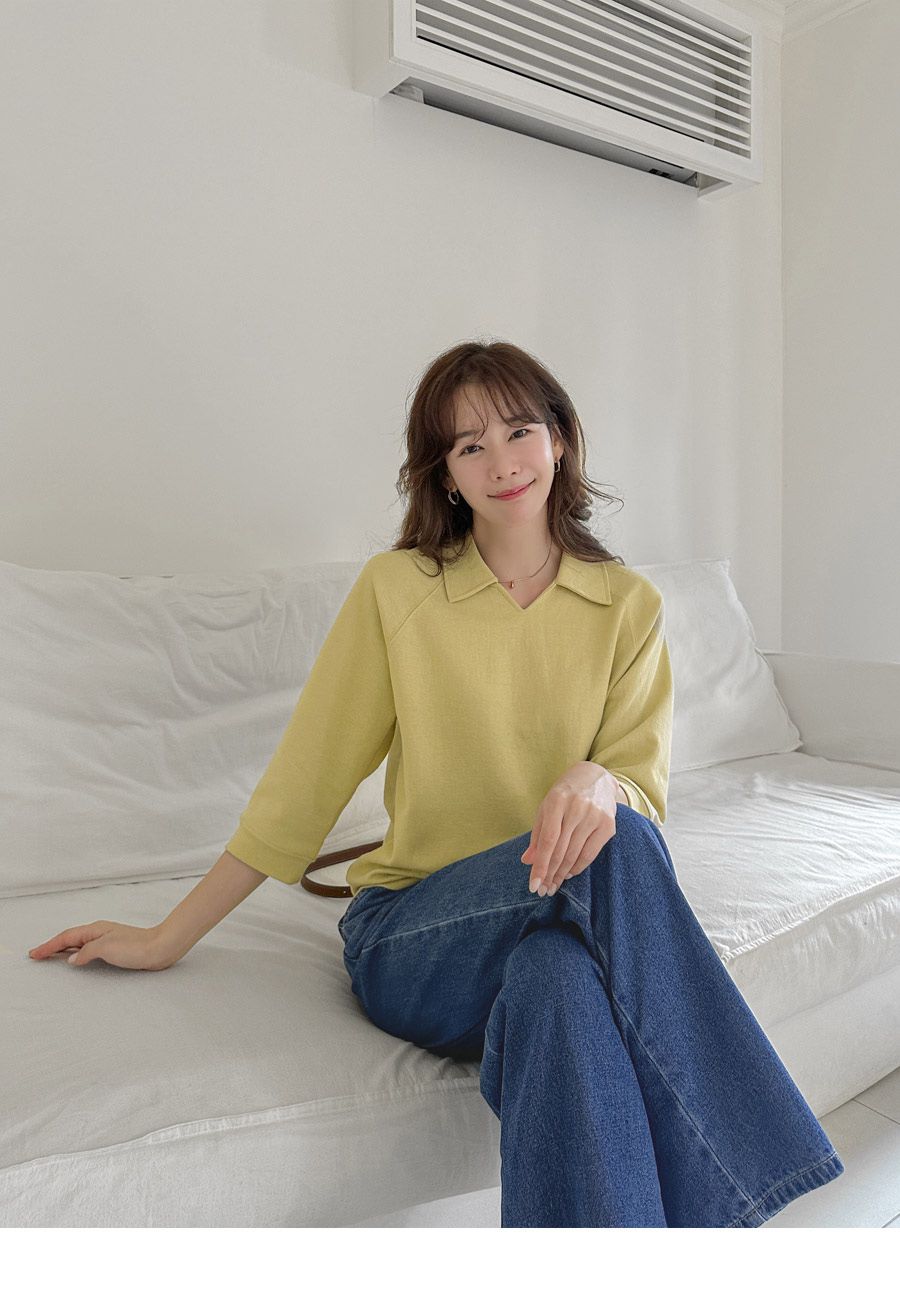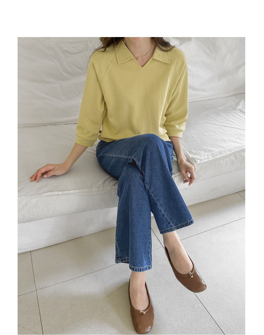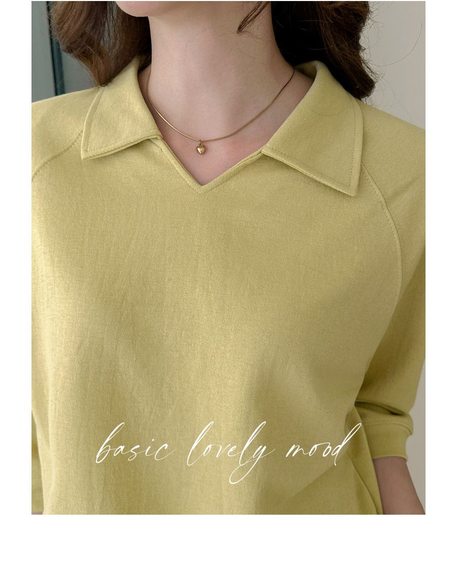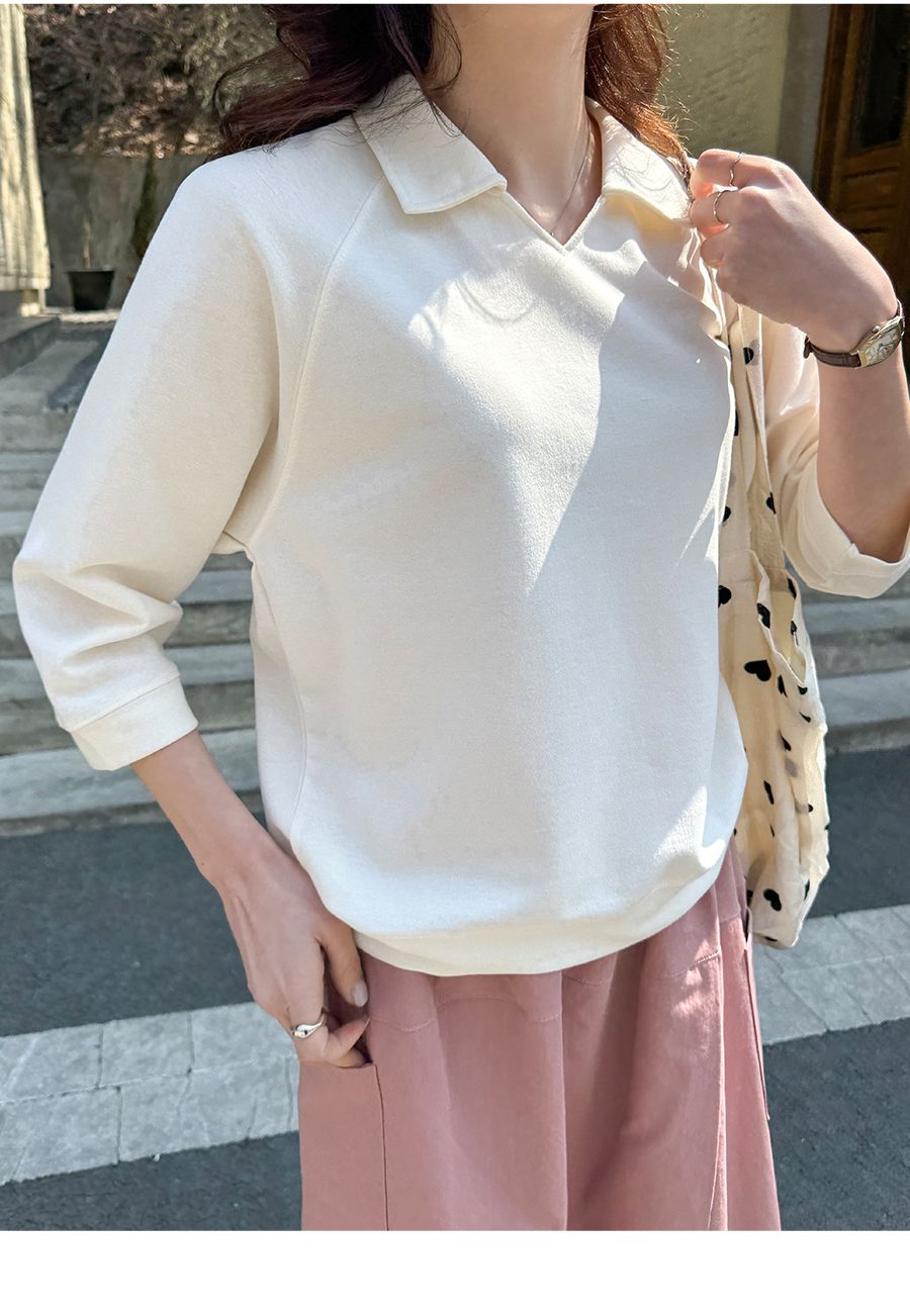 好氣色/連肩袖/V領/直筒版型 - 休閒居家簡約百搭素面翻領素面上衣七分袖上衣T恤黃色象牙色淺米色宗色天藍色黑色
