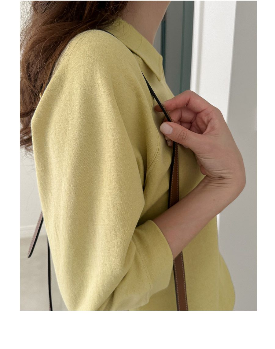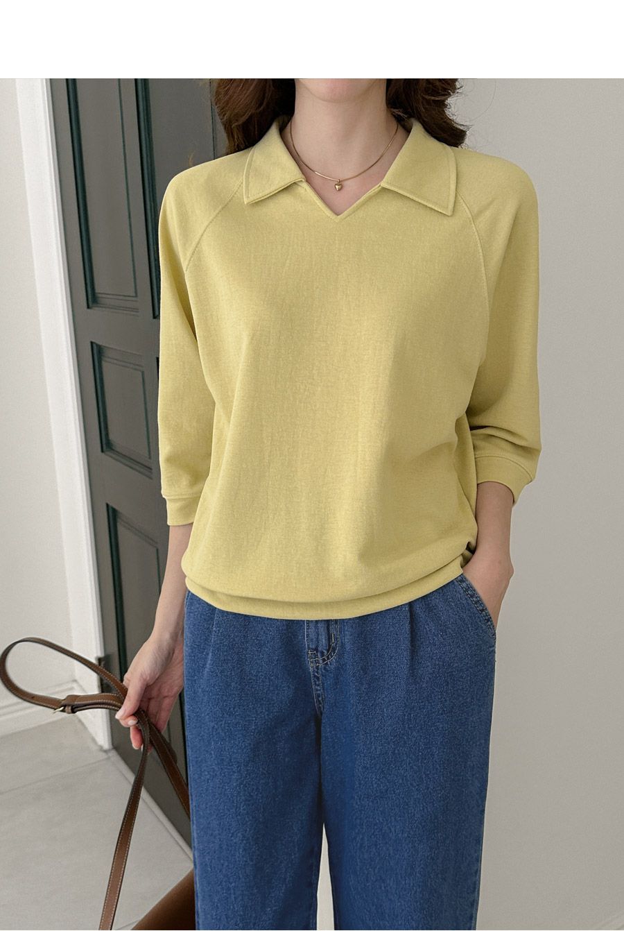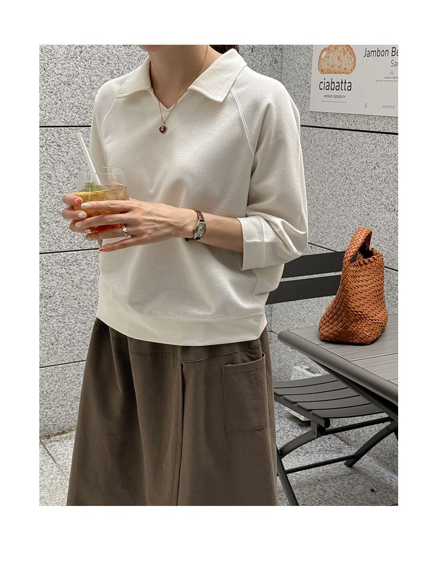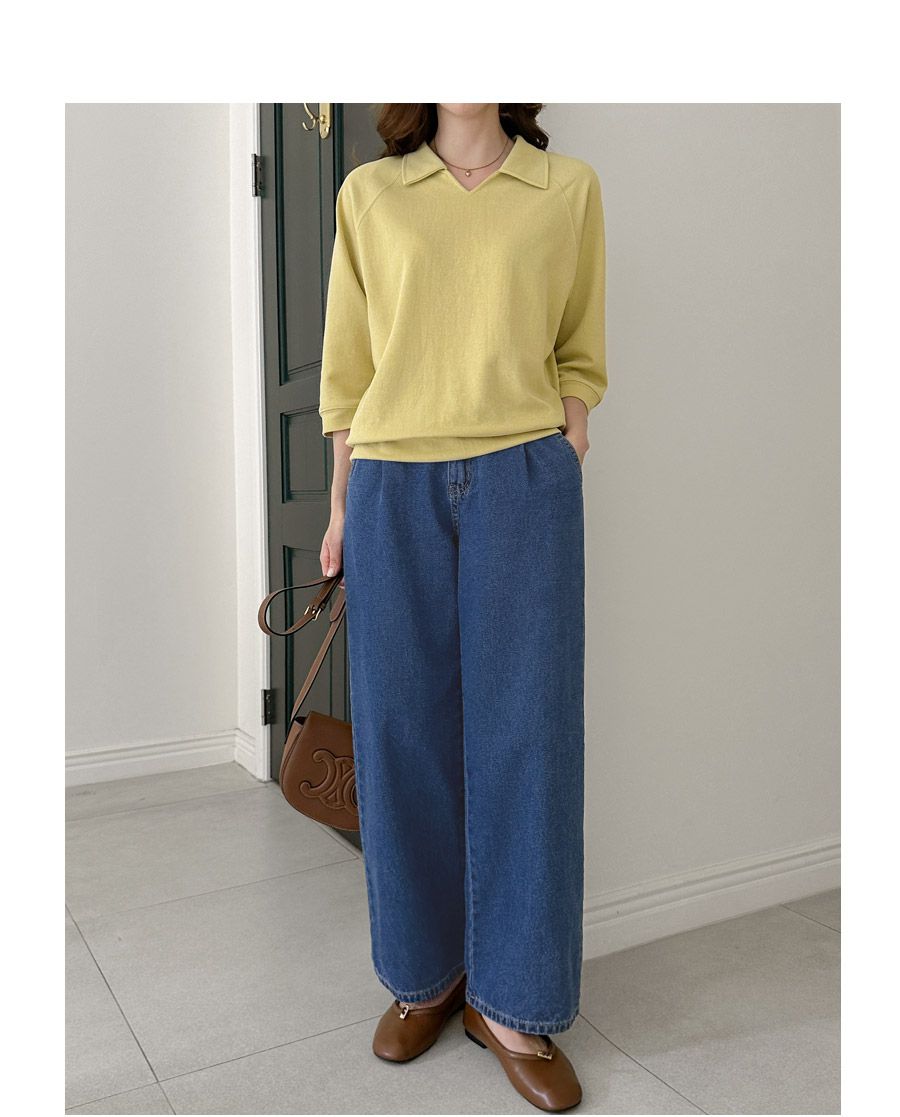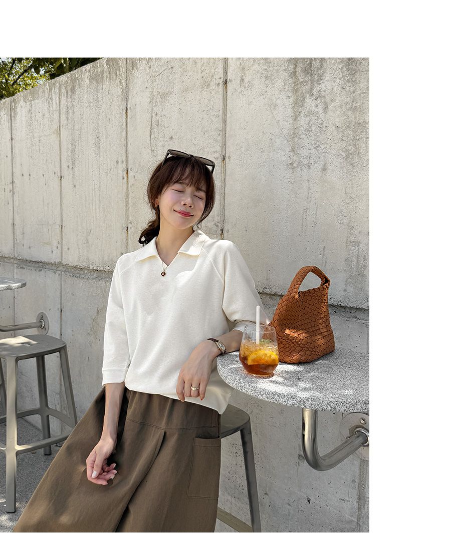 好氣色/連肩袖/V領/直筒版型 - 休閒居家簡約百搭素面翻領素面上衣七分袖上衣T恤黃色象牙色淺米色宗色天藍色黑色