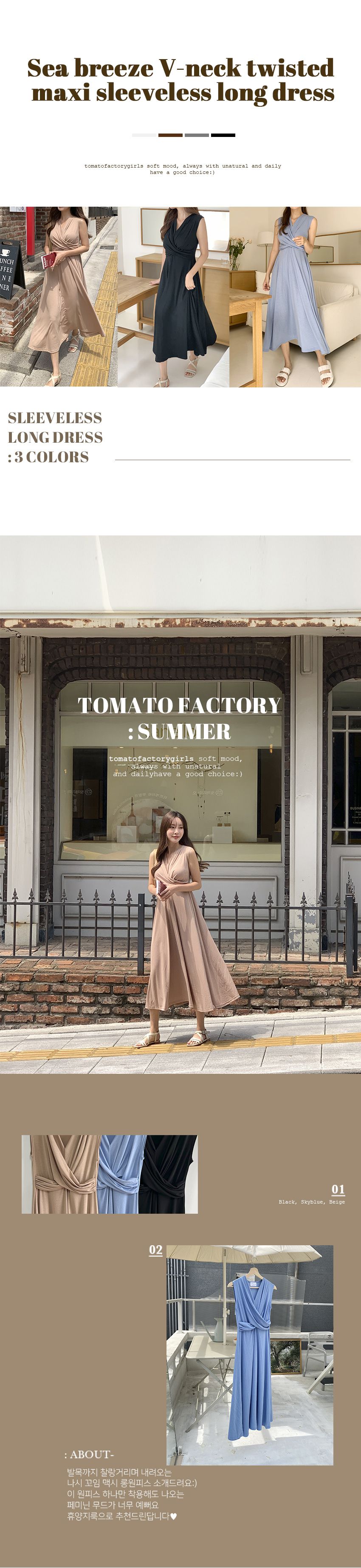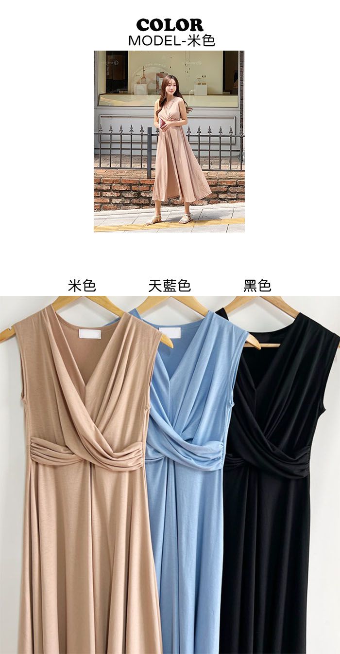 【C55213】韓國TMT 交叉V領洋裝-素面柔軟混絲收腰無袖連身裙★★