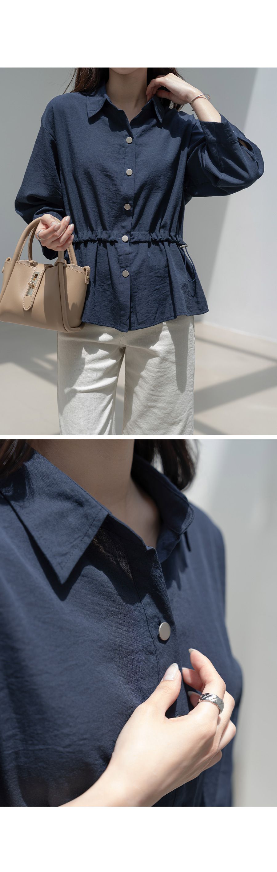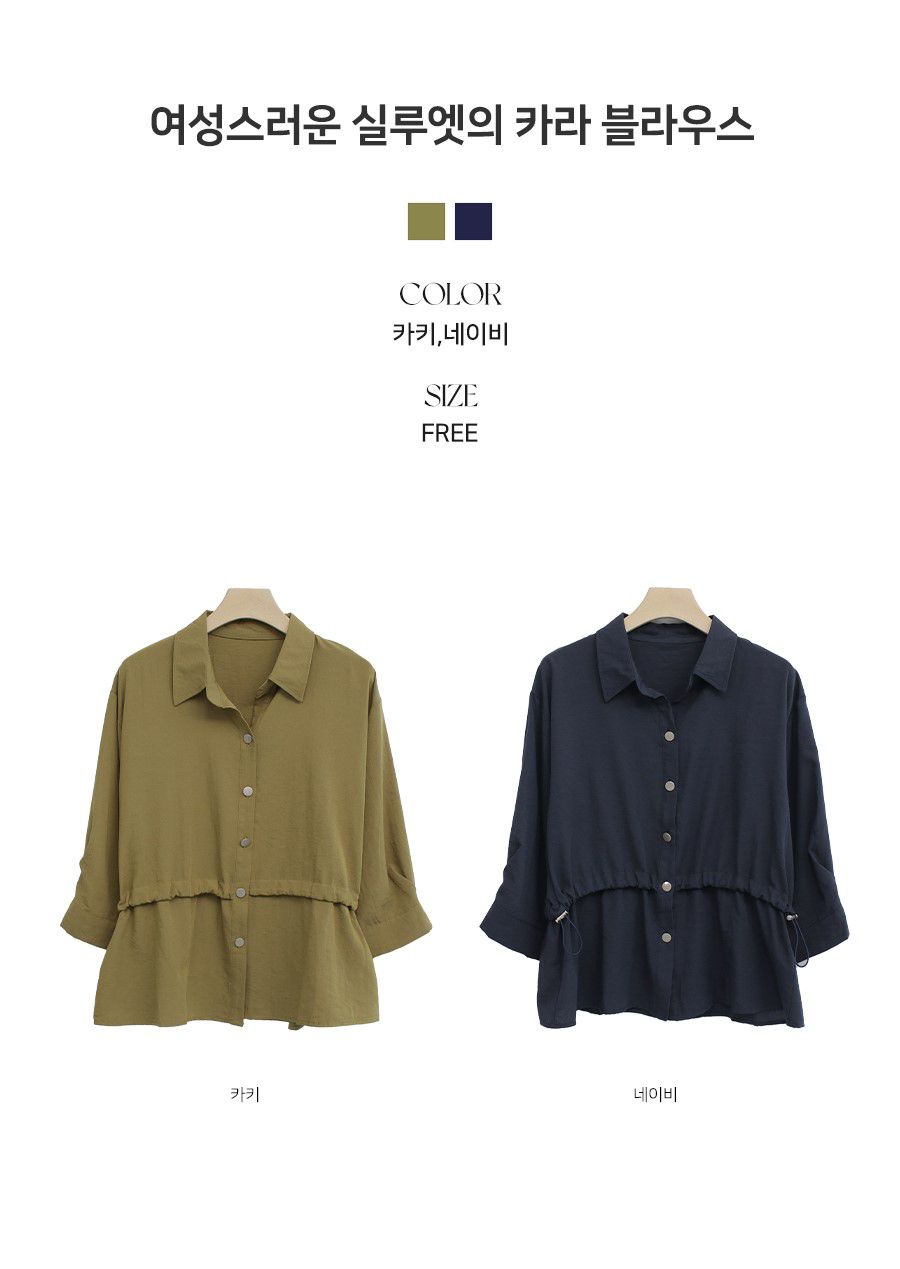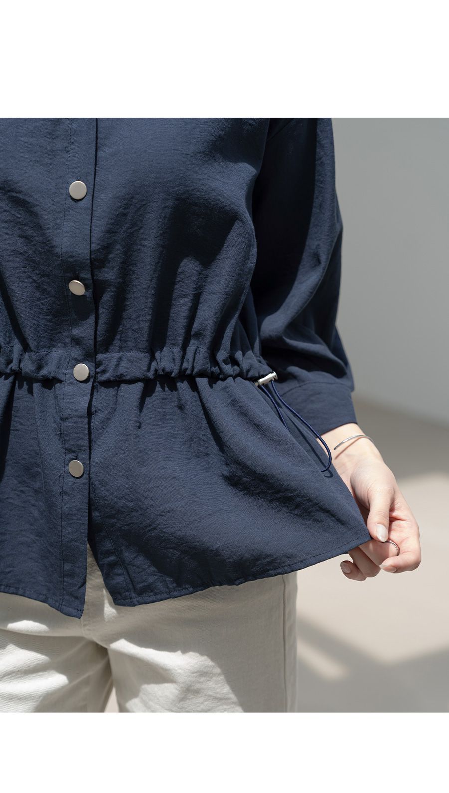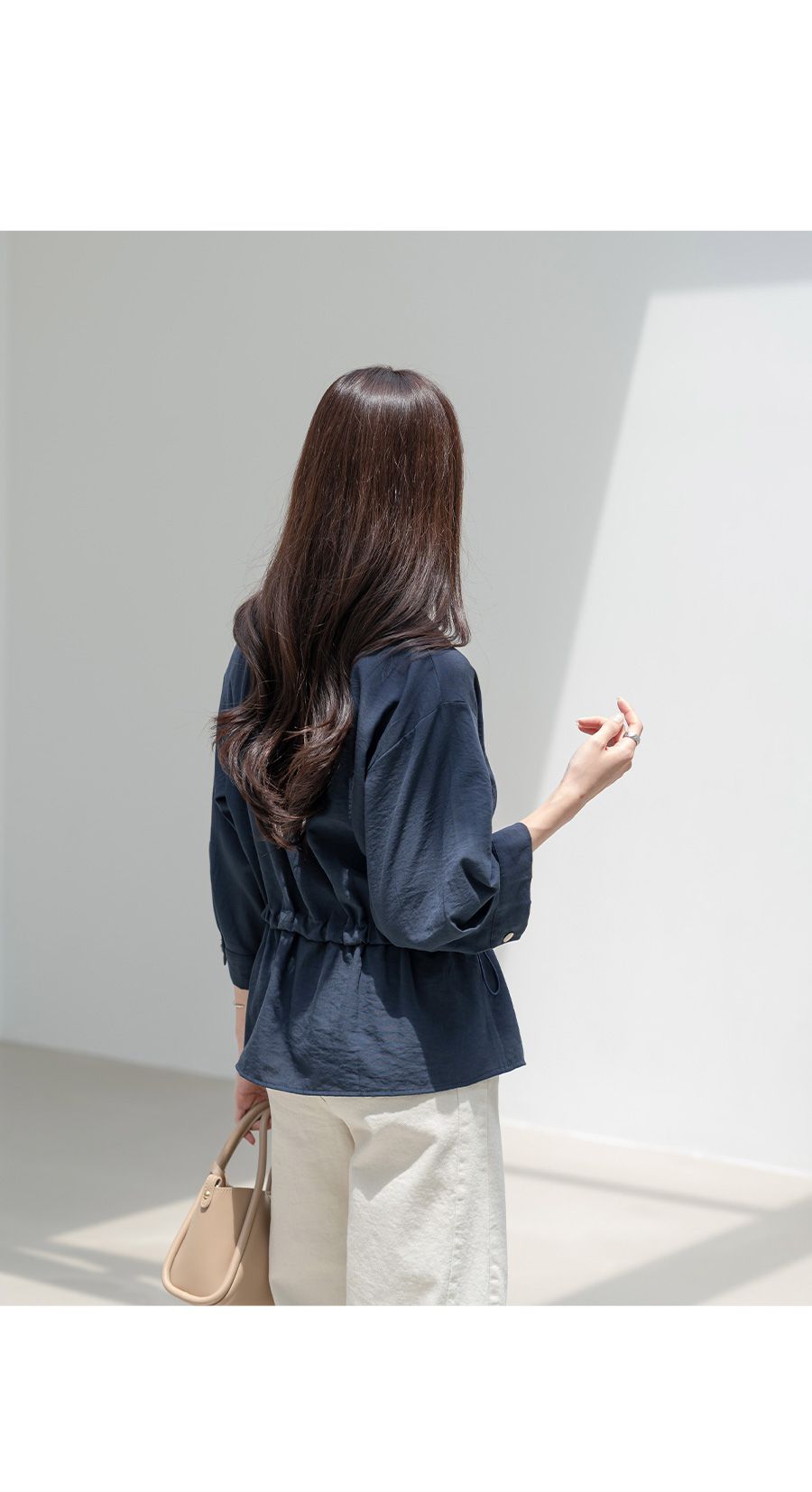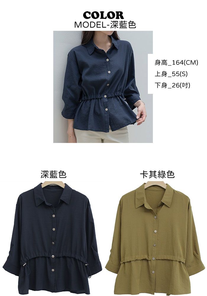 開襟排釦/抽繩收腰/七分袖 - 休閒居家簡約百搭素面收腰七分袖襯衫上衣七分袖上衣深藍色卡其綠色