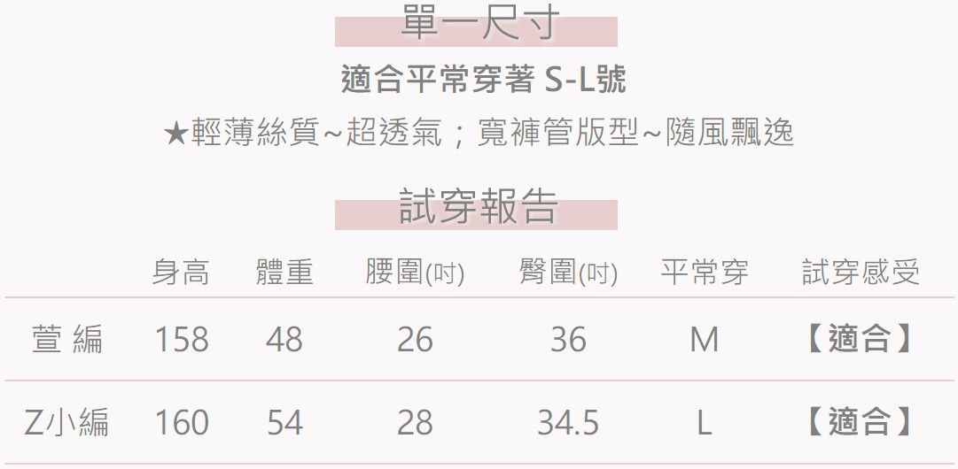 尺寸(cm) | 腰寬 | 臀寬 | 前檔 | 大腿寬 | 褲管寬 | 全長 | FREE | 32~45 | 76 | 40 | 53 | 74 | 88 | 材質 | 產地 | 透光度 | 厚度 | 彈性情況 | 備註 | 建議洗滌 | 人造絲 混聚酯 | 中國 | 米色 輕微透 | 薄 | 無彈性 | 側口袋 | 手洗乾洗 |