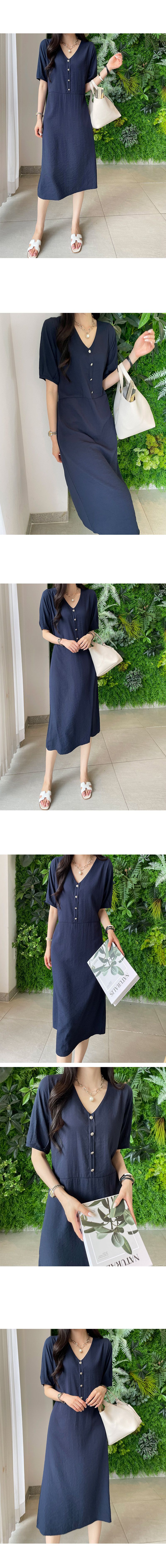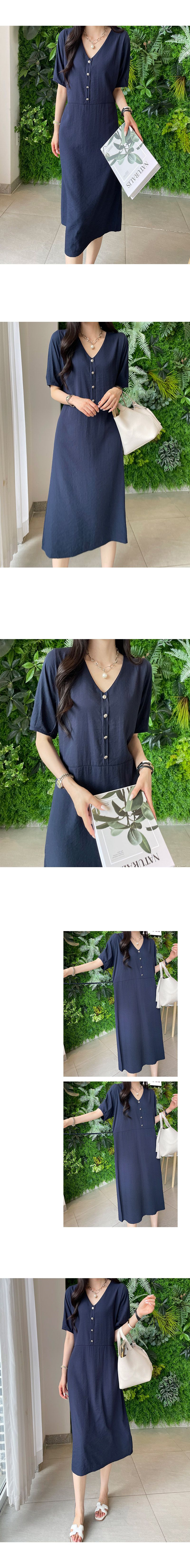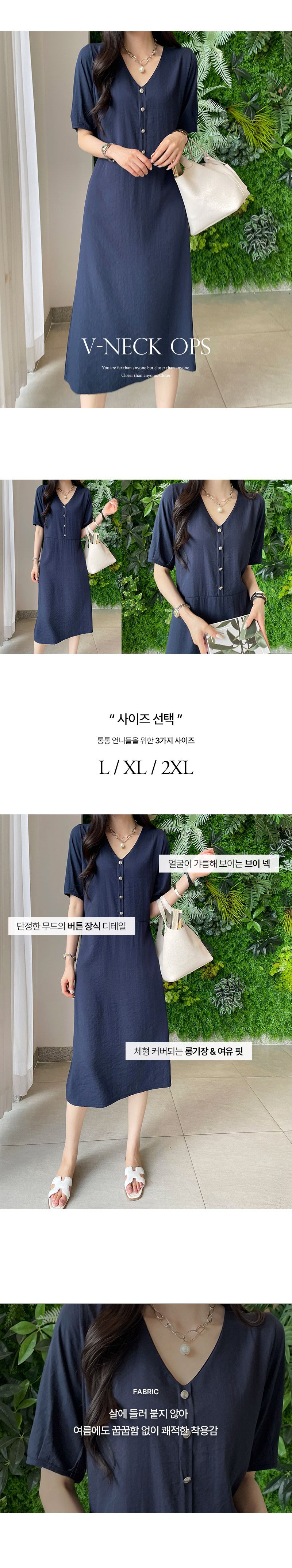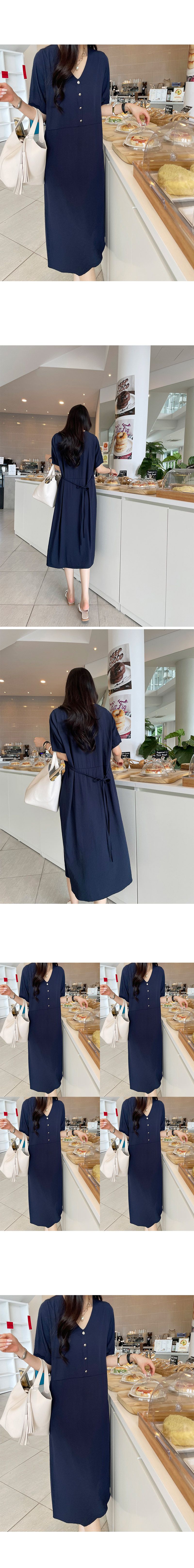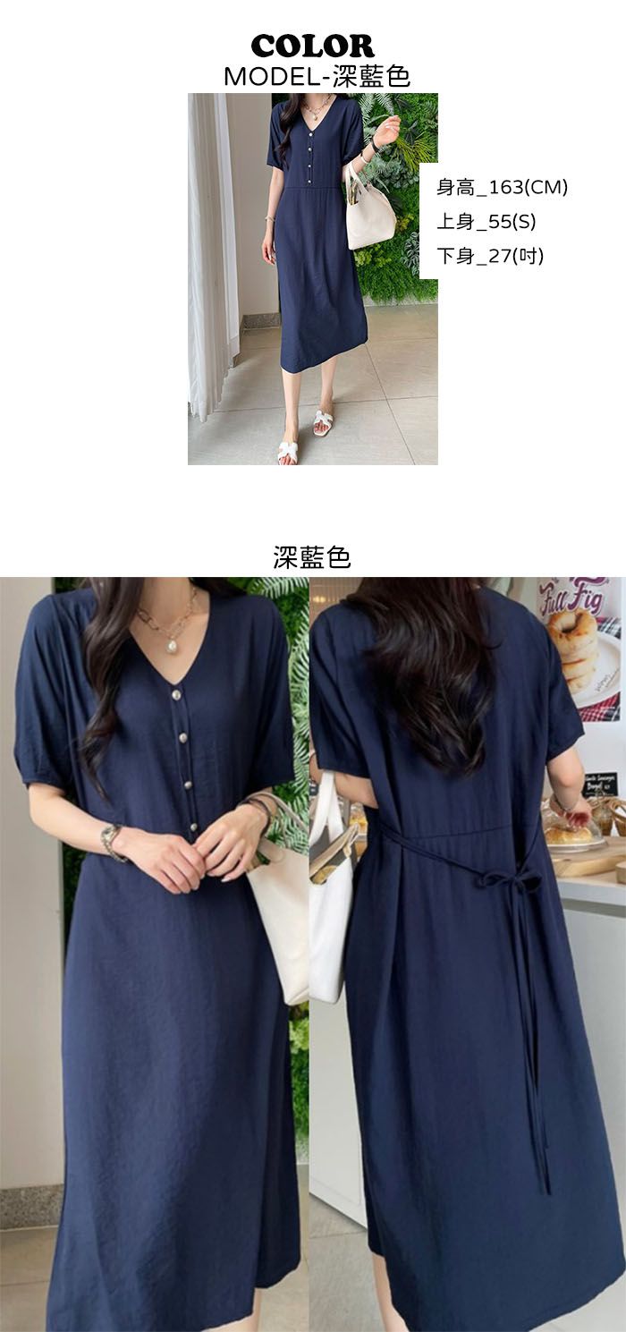 三種尺寸/寬鬆大尺碼洋裝/V領/綁帶收腰/半開襟假排釦 - 休閒居家渡假婚禮OL上班族簡約百搭素面排釦造型洋裝一件式洋裝五分袖洋裝五分袖連身裙多尺寸LXL2XL深藍色