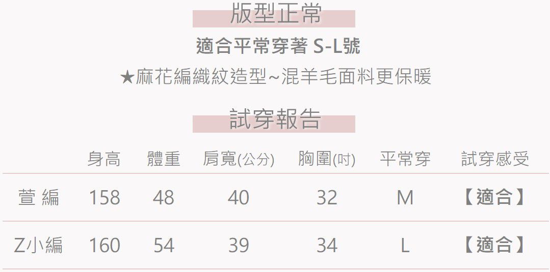 尺寸(cm) | 肩寬 | 胸寬 | 袖長 | 袖口寬 | 腋下寬 | 腰寬 | 臀寬 | 全長 | 領口 | FREE | 38 | 46 | 24.5 | 12 | 21 | 43.5 | 35 | 51 | 寬14/深7 | 材質 | 產地 | 透光度 | 厚度 | 彈性情況 | 建議洗滌 | 50%羊毛 混壓克力 混尼龍 | 韓國 | 不透 | 適中 | 有彈性 | 手洗乾洗 請勿烘乾 |