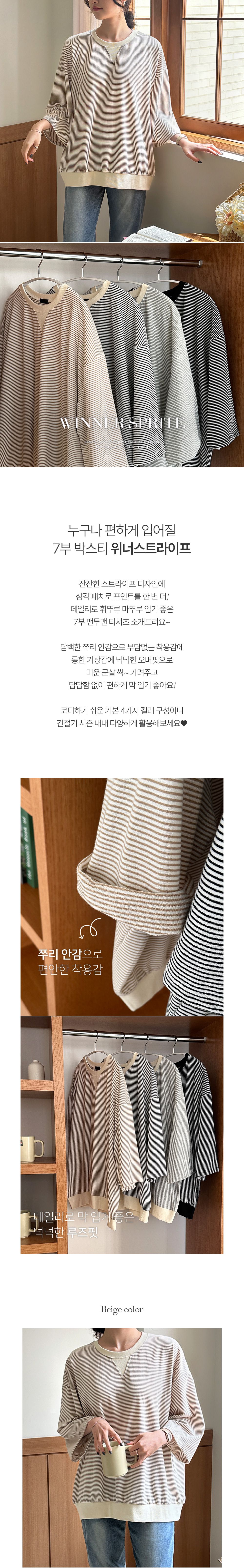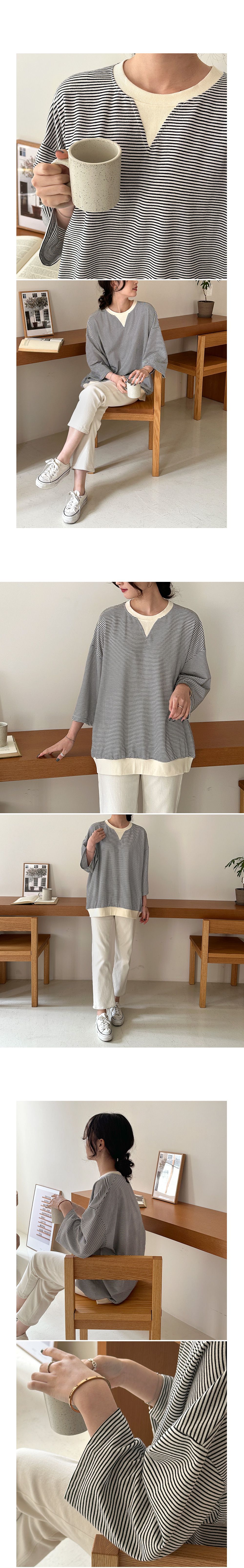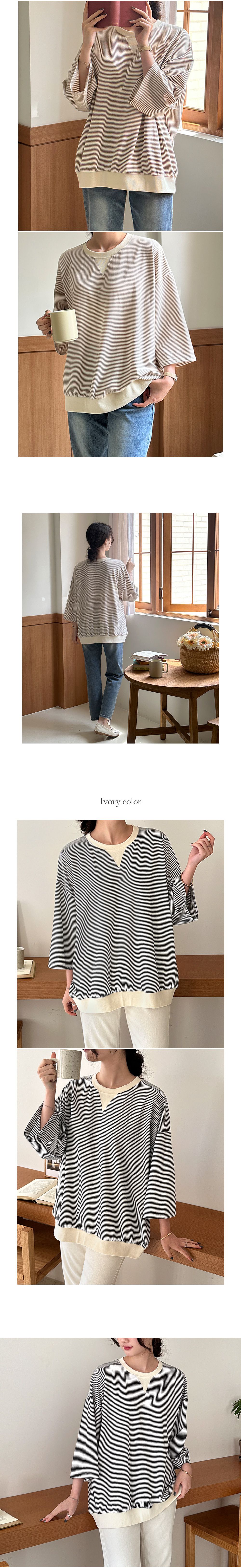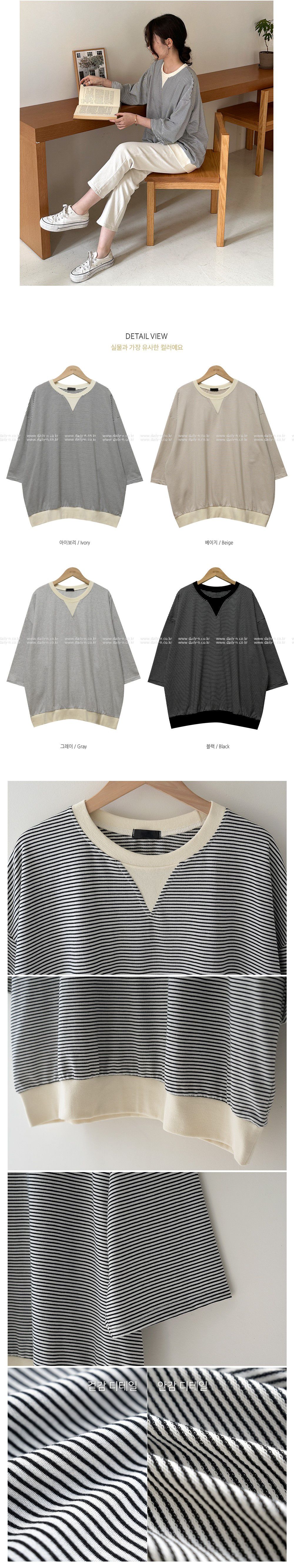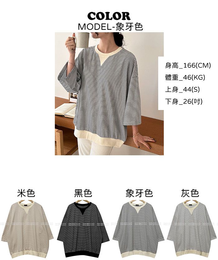 羅紋滾邊圓領/三角加固/落肩寬袖/寬鬆版型 - 休閒居家配色條紋上衣條紋T恤TEE條紋八分袖上衣寬鬆大尺碼上衣八分袖上衣七分袖T恤米色黑色象牙色灰色