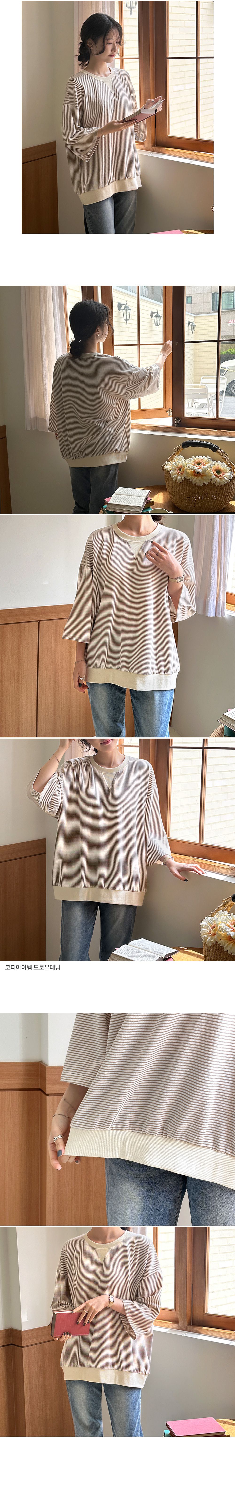 【C55251】韓國DLY 條紋八分袖上衣-羅紋滾邊圓領落肩寬袖寬鬆T恤