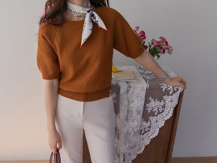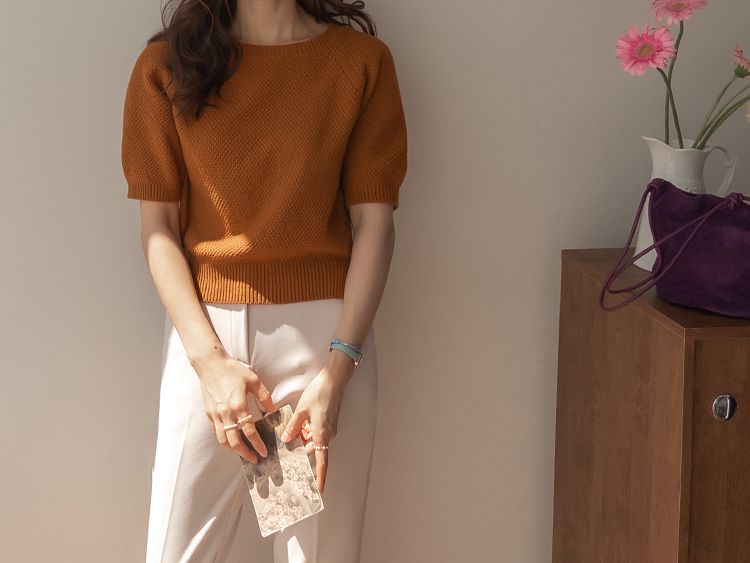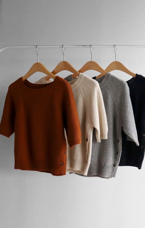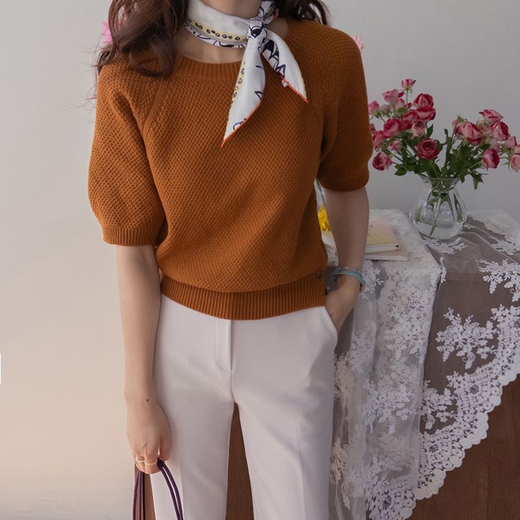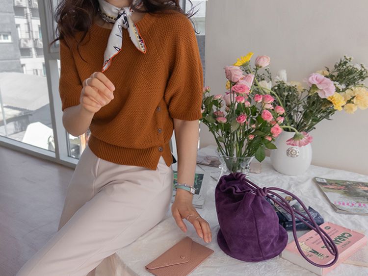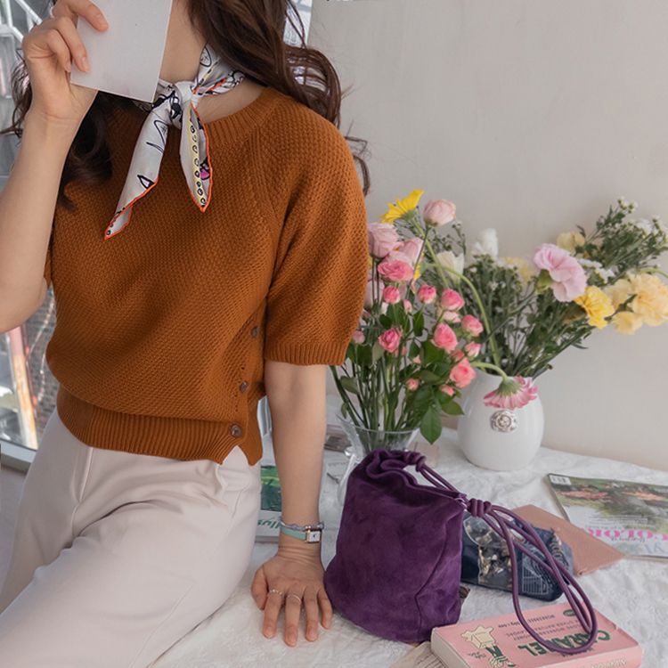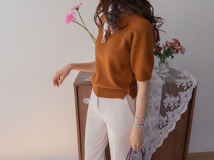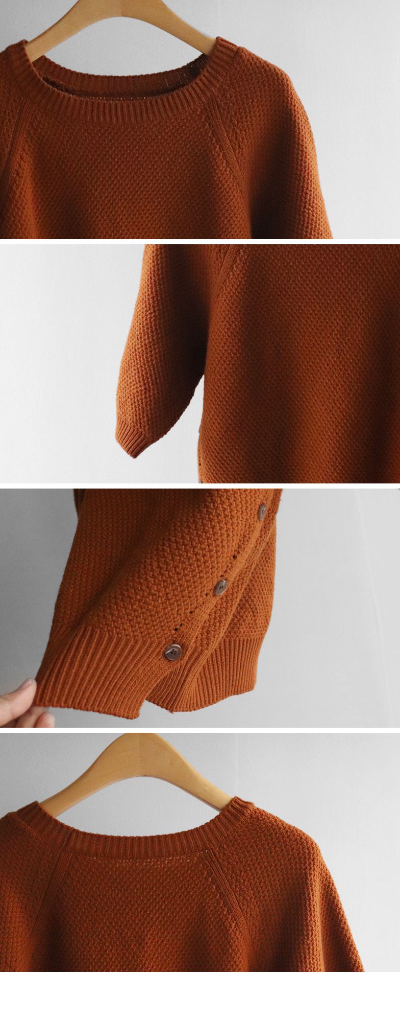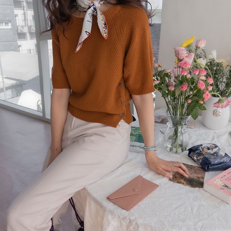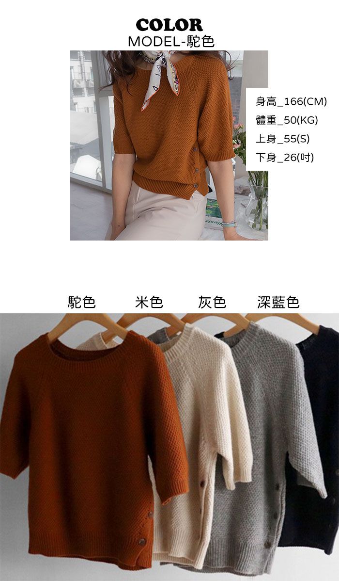 好氣色/華夫格紋路/短版上衣/圓領/連肩袖/寬袖/側開衩/側腰排釦設計 - 休閒居家簡約百搭素面側腰排釦針織衫針織上衣五分袖上衣駝色米色灰色深藍色