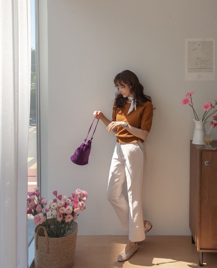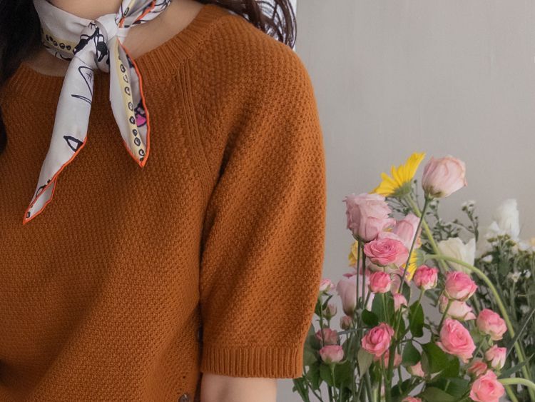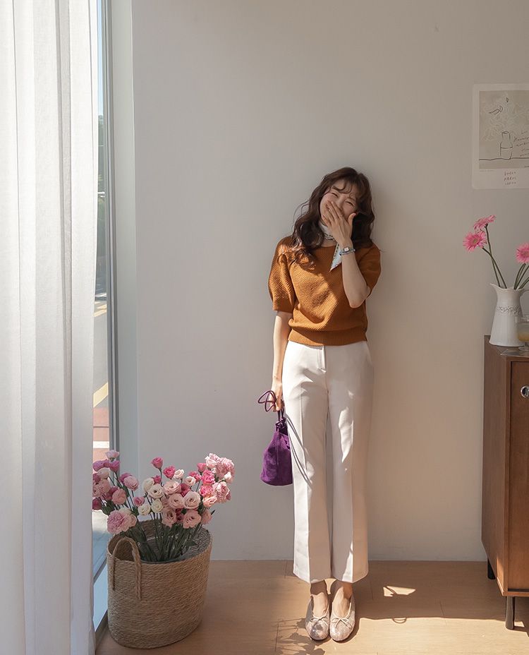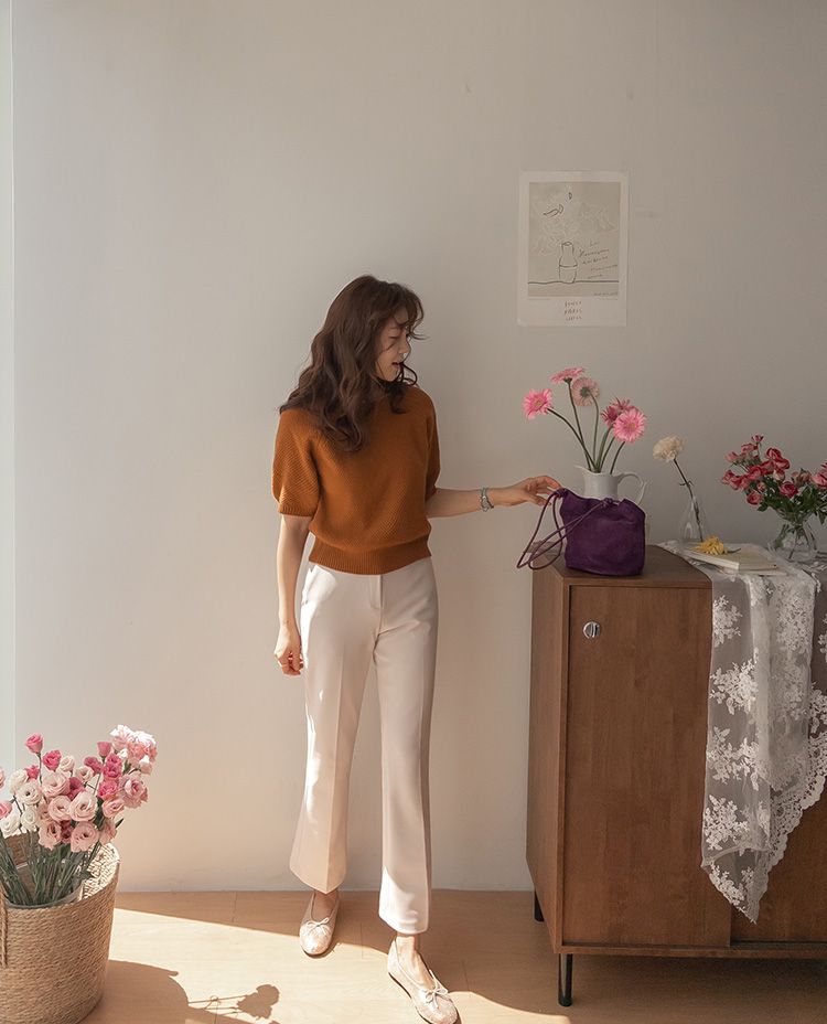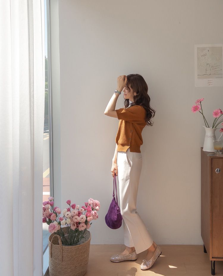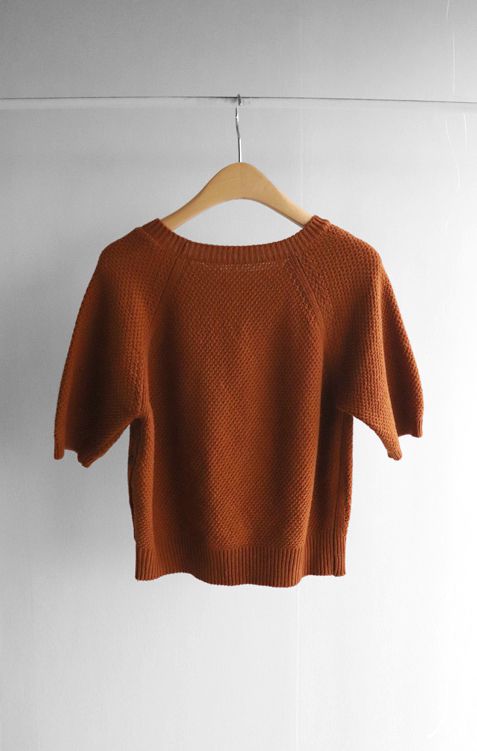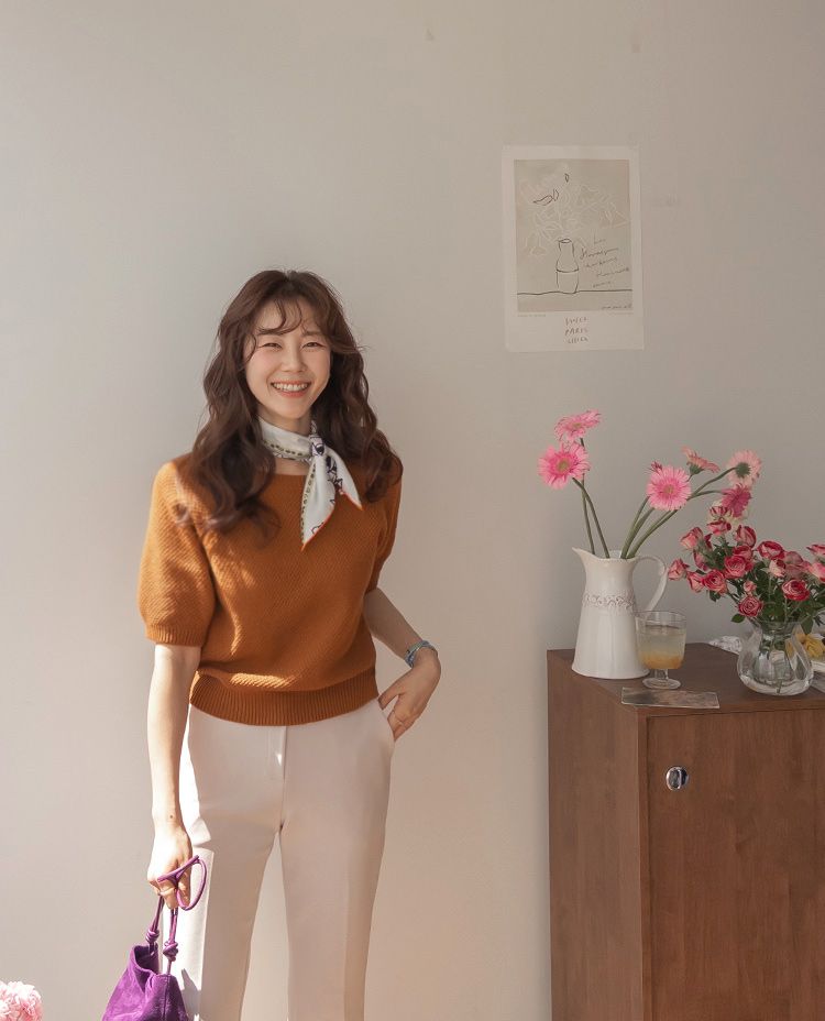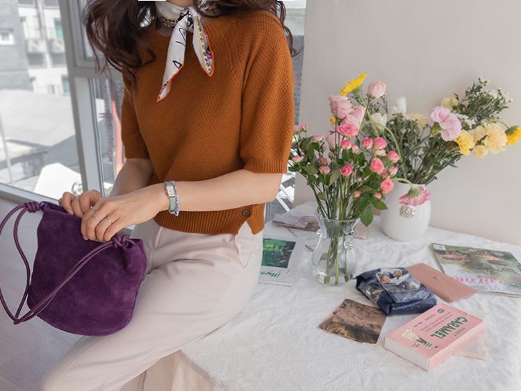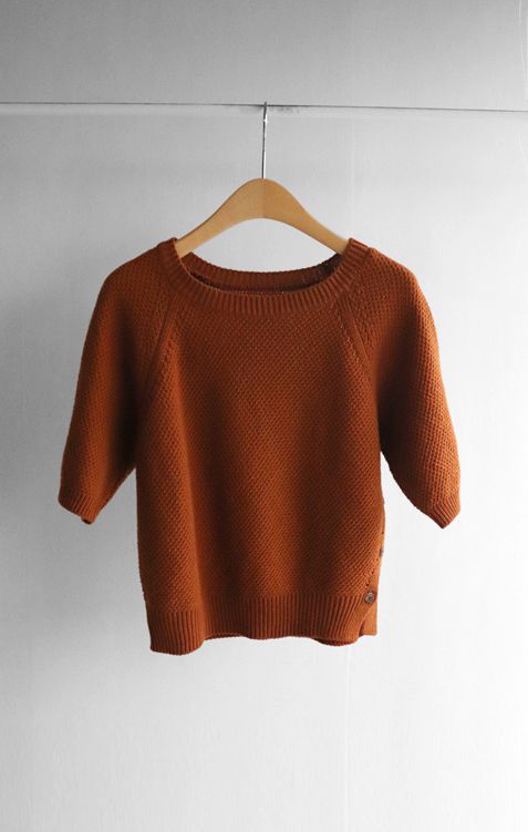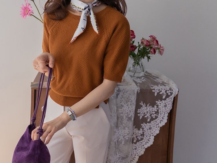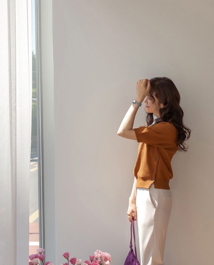 好氣色/華夫格紋路/短版上衣/圓領/連肩袖/寬袖/側開衩/側腰排釦設計 - 休閒居家簡約百搭素面側腰排釦針織衫針織上衣五分袖上衣駝色米色灰色深藍色