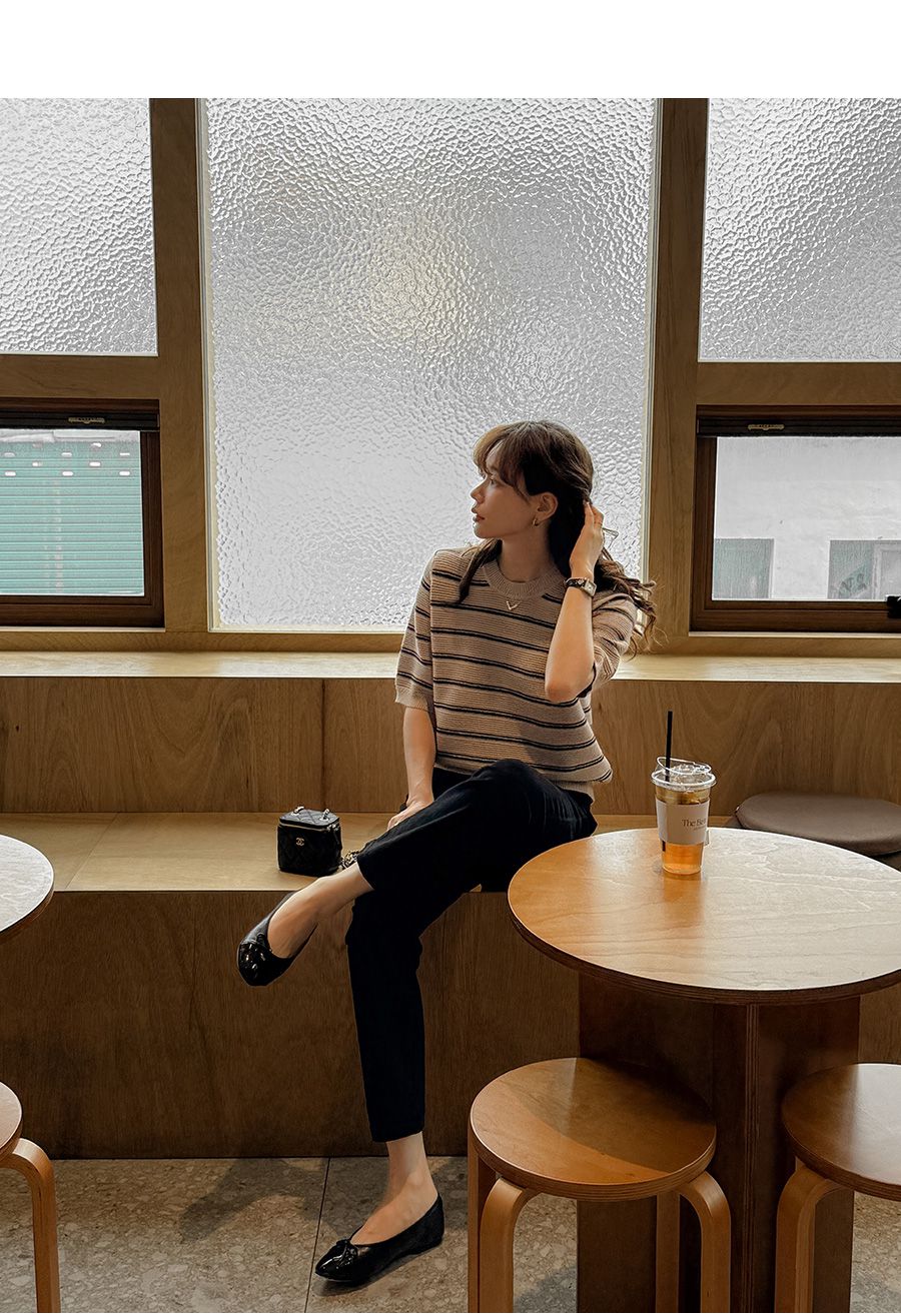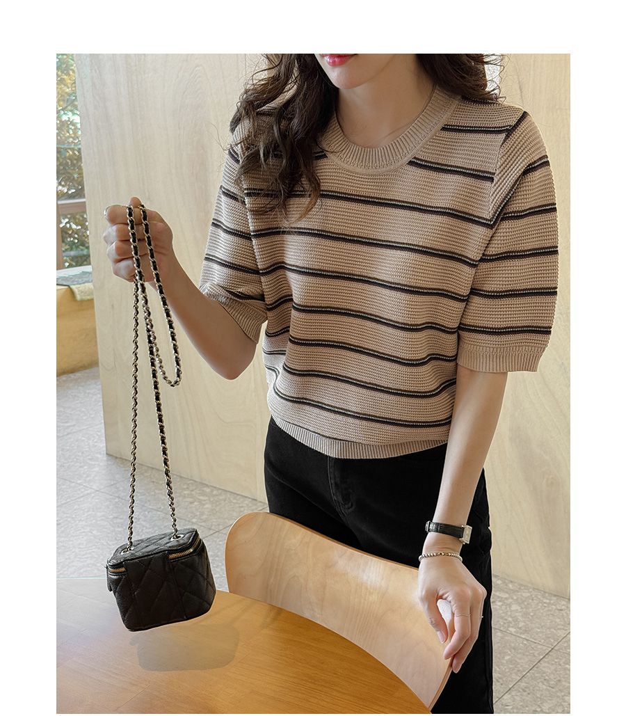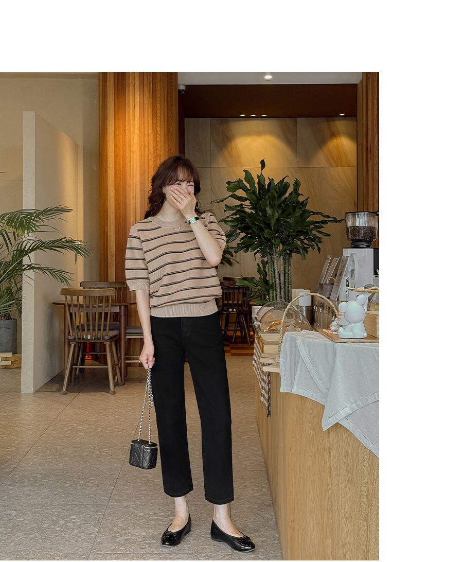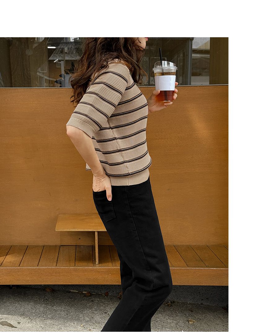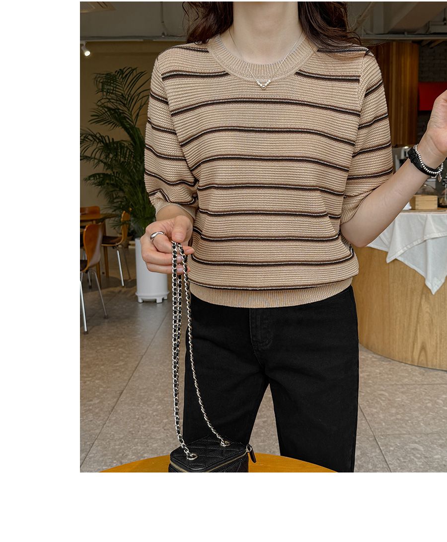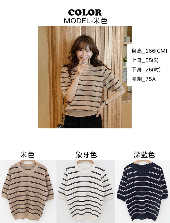 彈性羅紋滾邊圓領/橫條紋/五分袖 - 休閒居家配色條紋上衣條紋針織衫三色條紋針織衫五分袖上衣米色象牙色深藍色