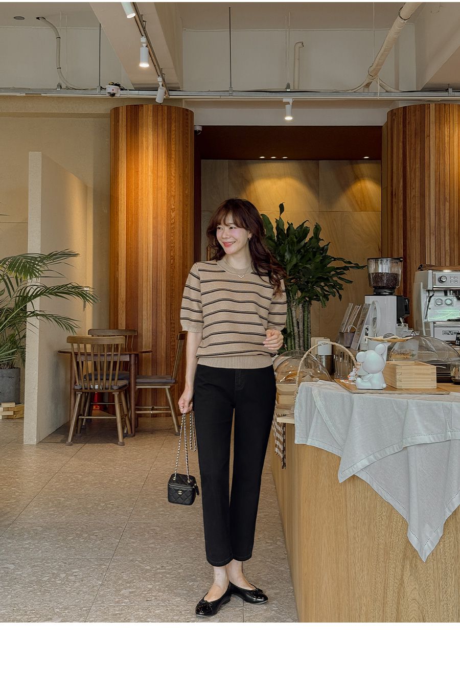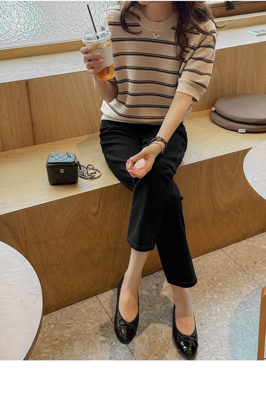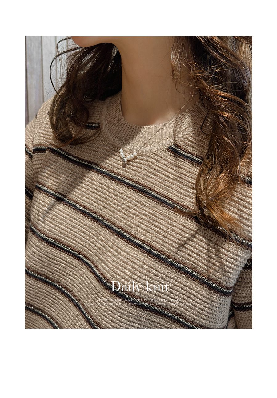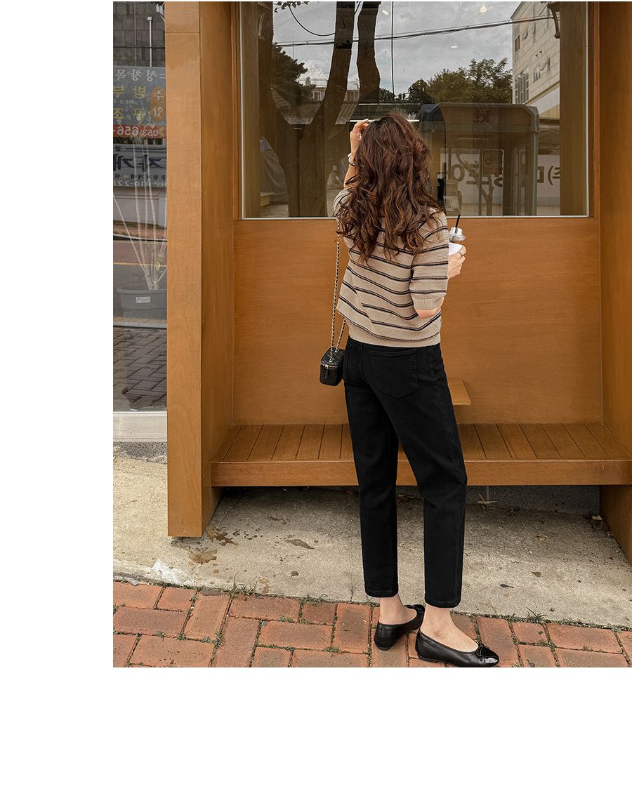 彈性羅紋滾邊圓領/橫條紋/五分袖 - 休閒居家配色條紋上衣條紋針織衫三色條紋針織衫五分袖上衣米色象牙色深藍色