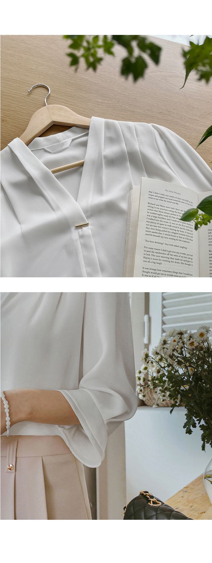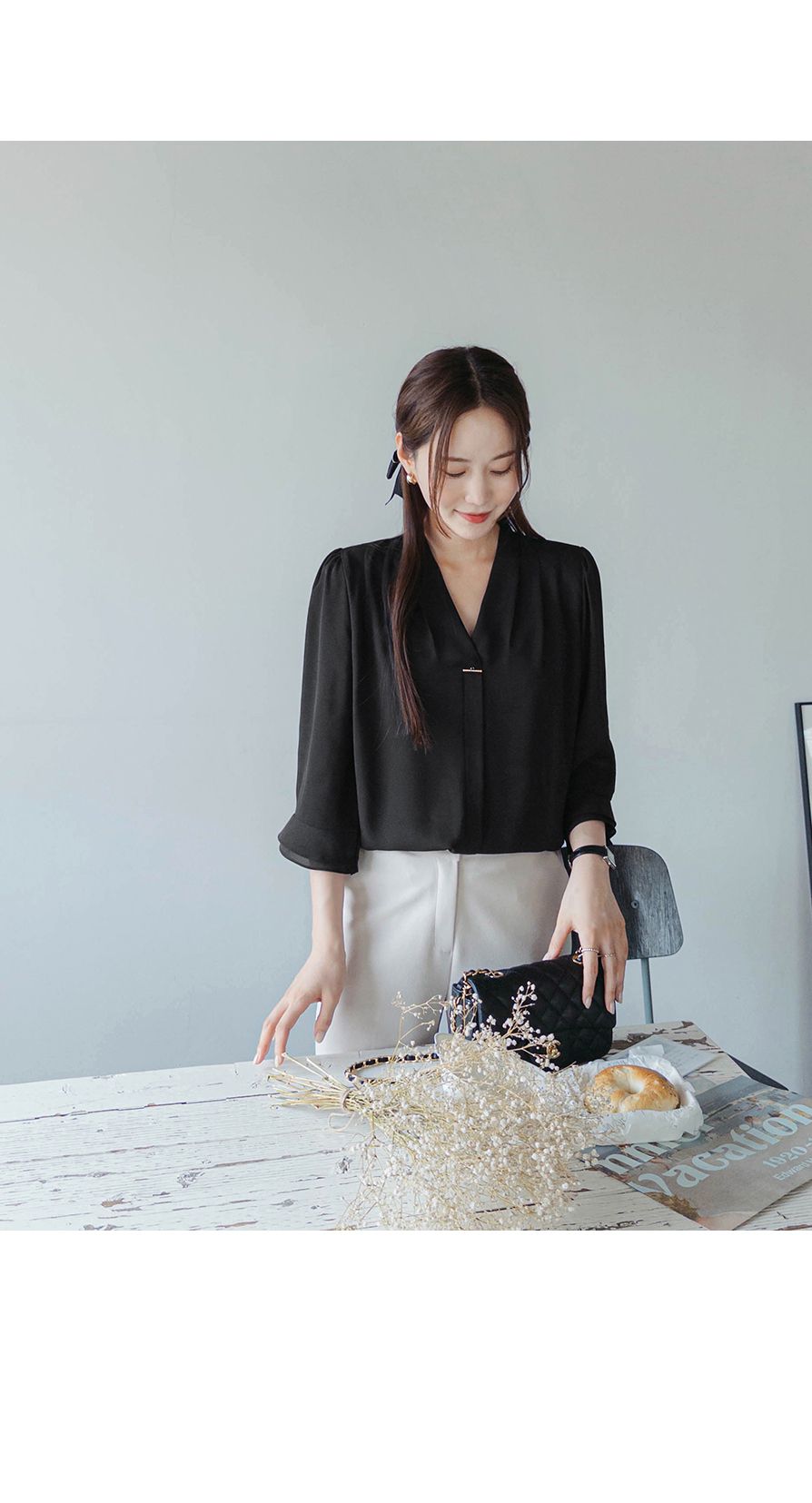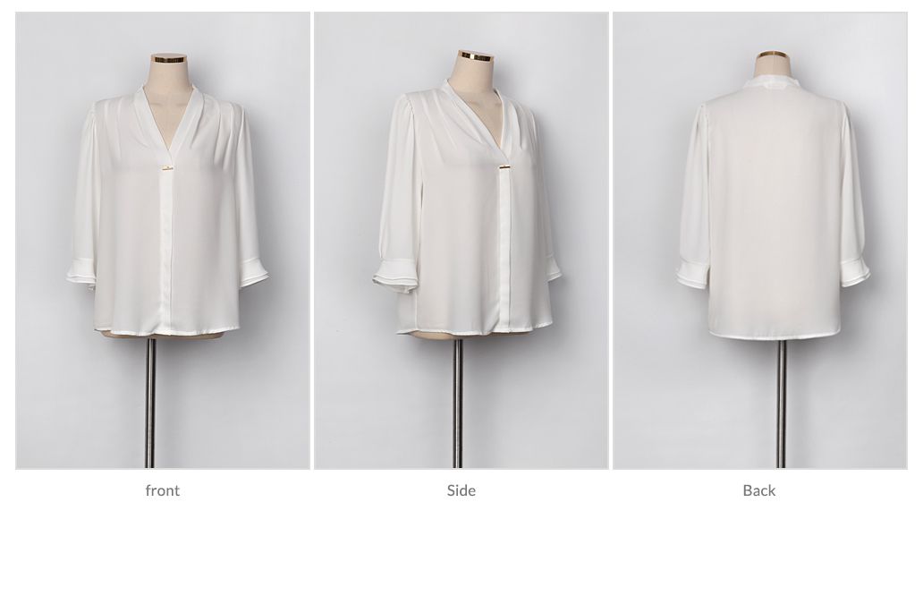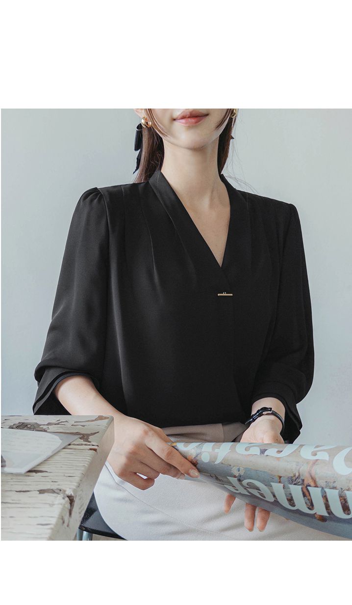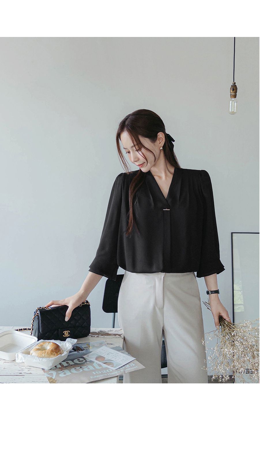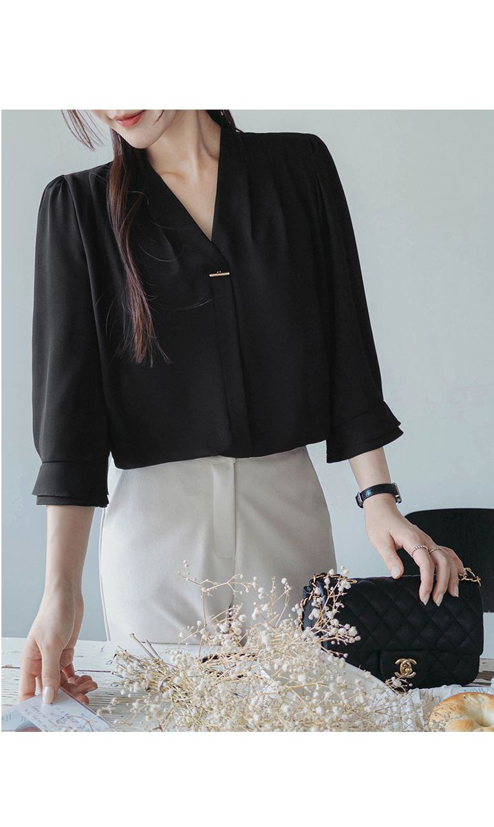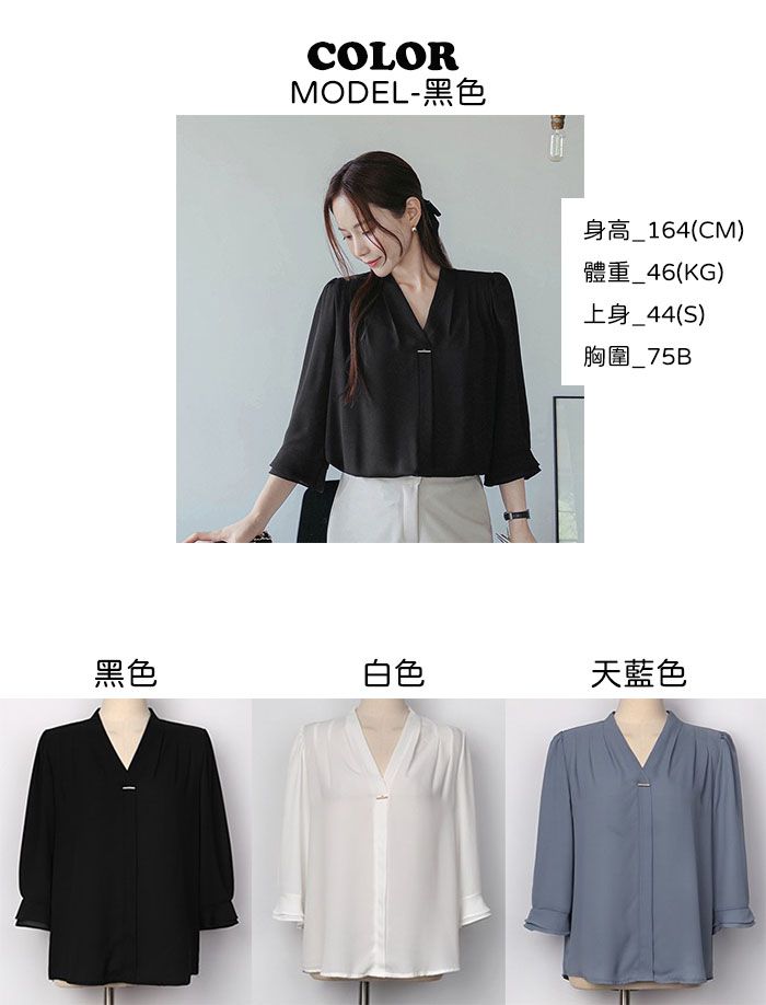 公主袖/寬袖/金屬雕墜V領/雙層花瓣袖口/弧形下襬/交疊衣襟 - 休閒婚禮OL上班族簡約百搭素面抓褶肩雪紡衫雪紡上衣雪紡襯衫上衣七分袖上衣黑色白色天藍色