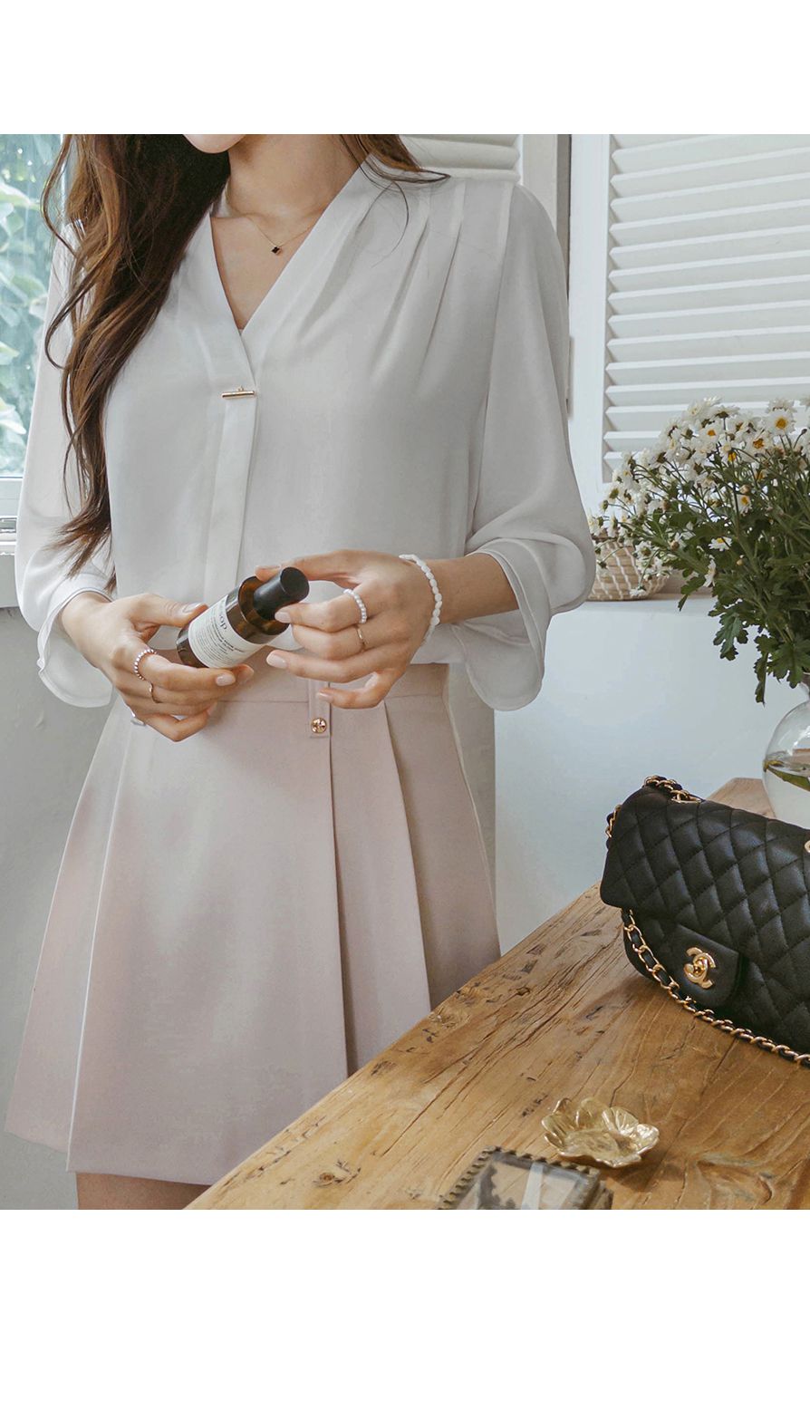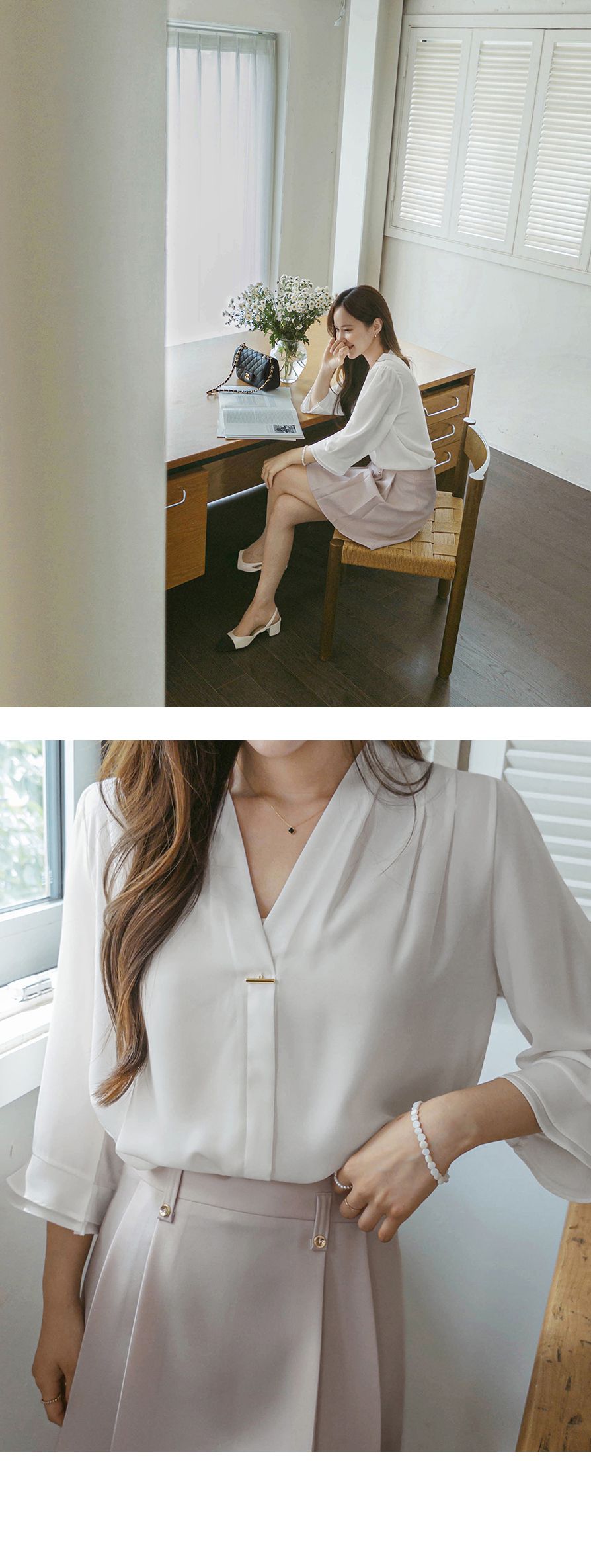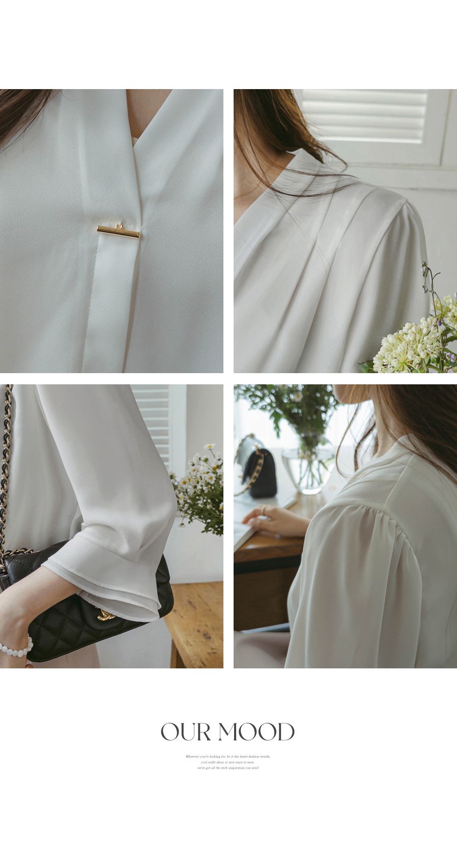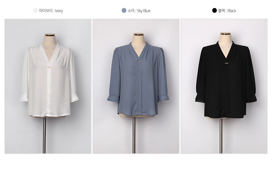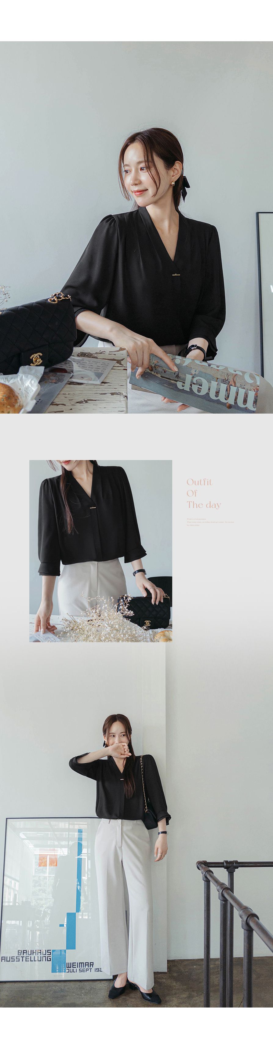 公主袖/寬袖/金屬雕墜V領/雙層花瓣袖口/弧形下襬/交疊衣襟 - 休閒婚禮OL上班族簡約百搭素面抓褶肩雪紡衫雪紡上衣雪紡襯衫上衣七分袖上衣黑色白色天藍色