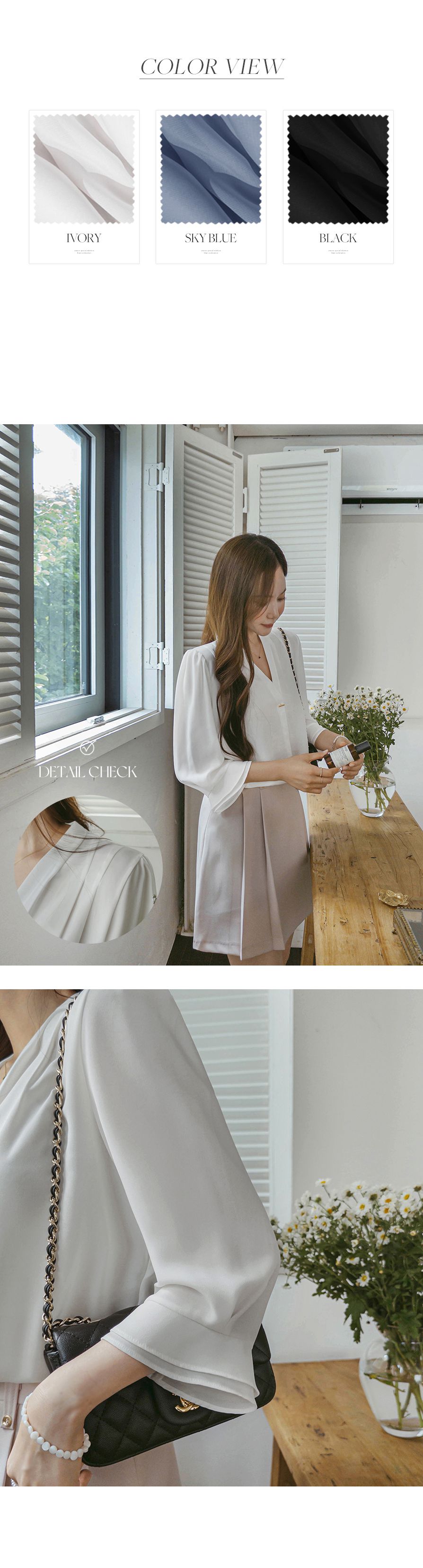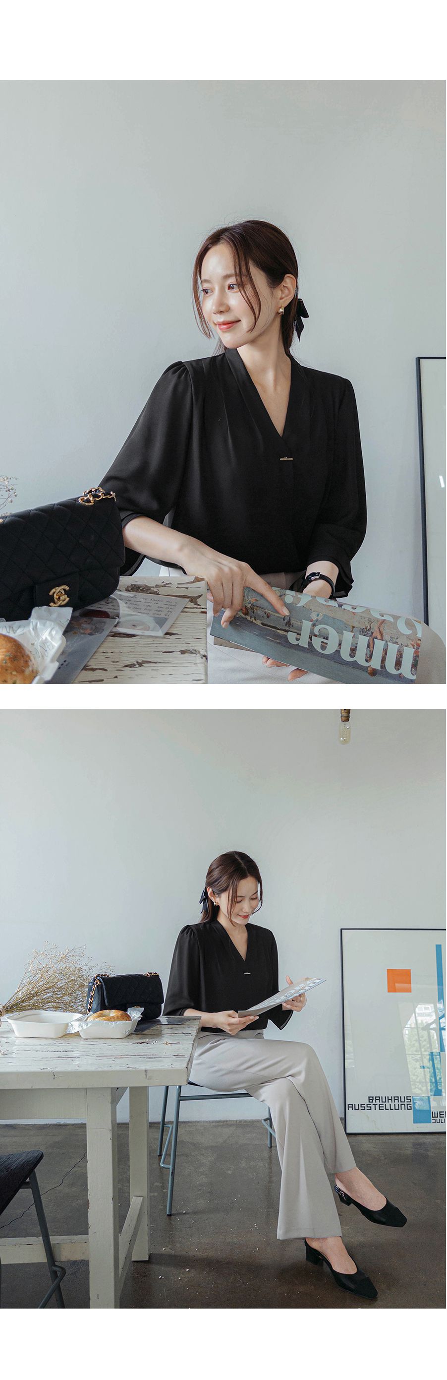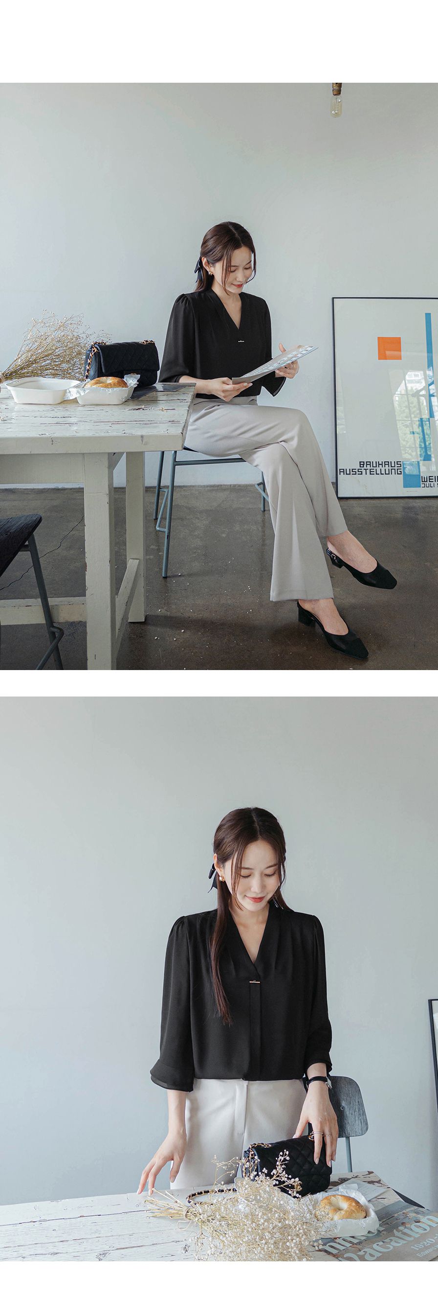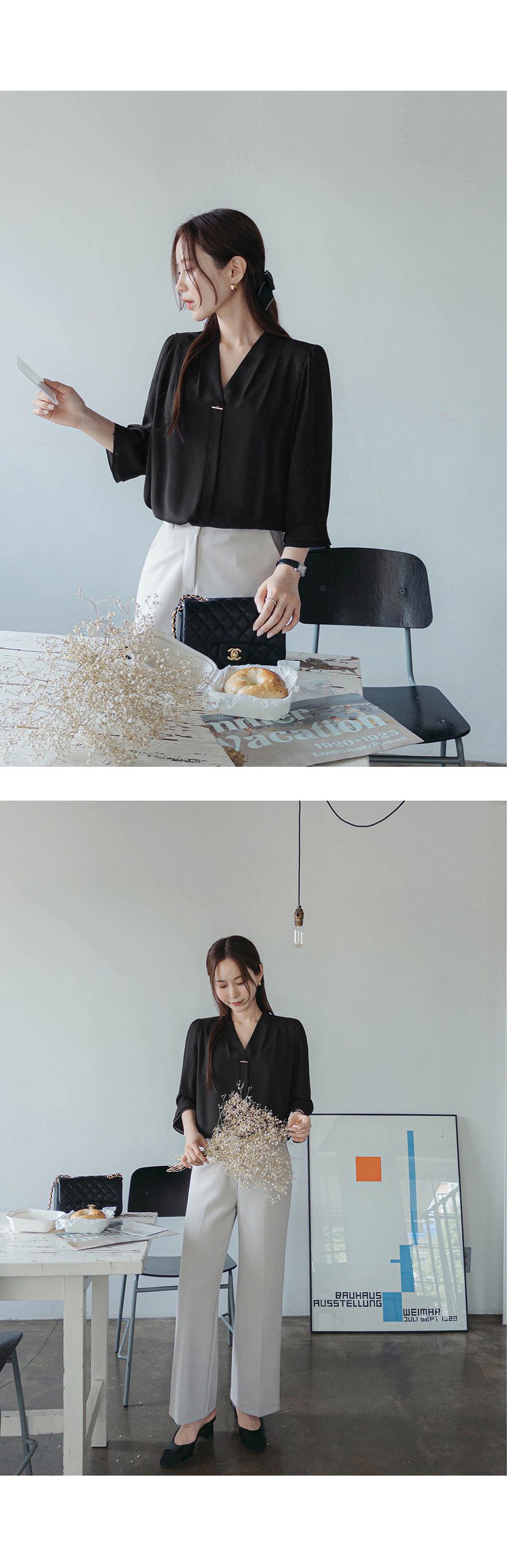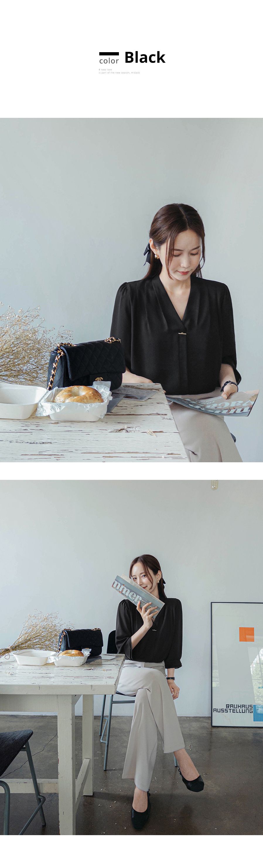 公主袖/寬袖/金屬雕墜V領/雙層花瓣袖口/弧形下襬/交疊衣襟 - 休閒婚禮OL上班族簡約百搭素面抓褶肩雪紡衫雪紡上衣雪紡襯衫上衣七分袖上衣黑色白色天藍色
